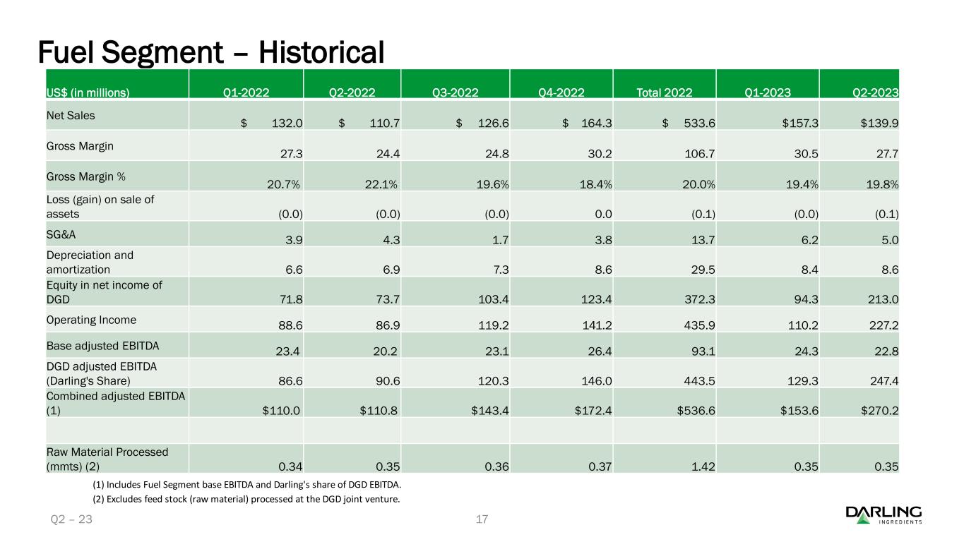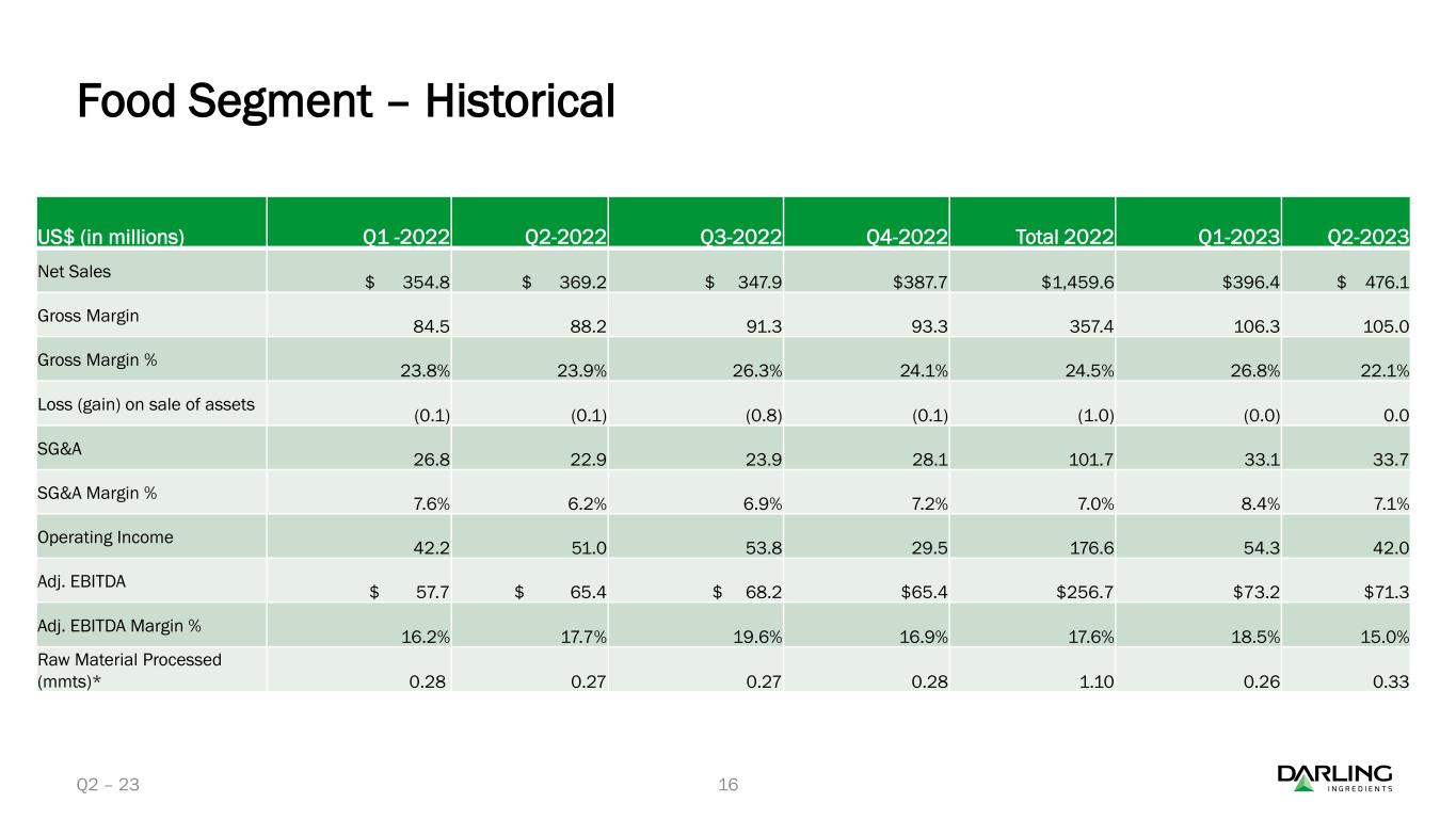 Food Segment – Historical US$ (in millions) Q1 -2022 Q2-2022 Q3-2022 Q4-2022 Total 2022 Q1-2023 Q2-2023 Net Sales $ 354.8 $ 369.2 $ 347.9 $387.7 $1,459.6 $396.4 $ 476.1 Gross Margin 84.5 88.2 91.3 93.3 357.4 106.3 105.0 Gross Margin % 23.8% 23.9% 26.3% 24.1% 24.5% 26.8% 22.1% Loss (gain) on sale of assets (0.1) (0.1) (0.8) (0.1) (1.0) (0.0) 0.0 SG&A 26.8 22.9 23.9 28.1 101.7 33.1 33.7 SG&A Margin % 7.6% 6.2% 6.9% 7.2% 7.0% 8.4% 7.1% Operating Income 42.2 51.0 53.8 29.5 176.6 54.3 42.0 Adj. EBITDA $ 57.7 $ 65.4 $ 68.2 $65.4 $256.7 $73.2 $71.3 Adj. EBITDA Margin % 16.2% 17.7% 19.6% 16.9% 17.6% 18.5% 15.0% Raw Material Processed (mmts)* 0.28 0.27 0.27 0.28 1.10 0.26 0.33 Q2 – 23 16