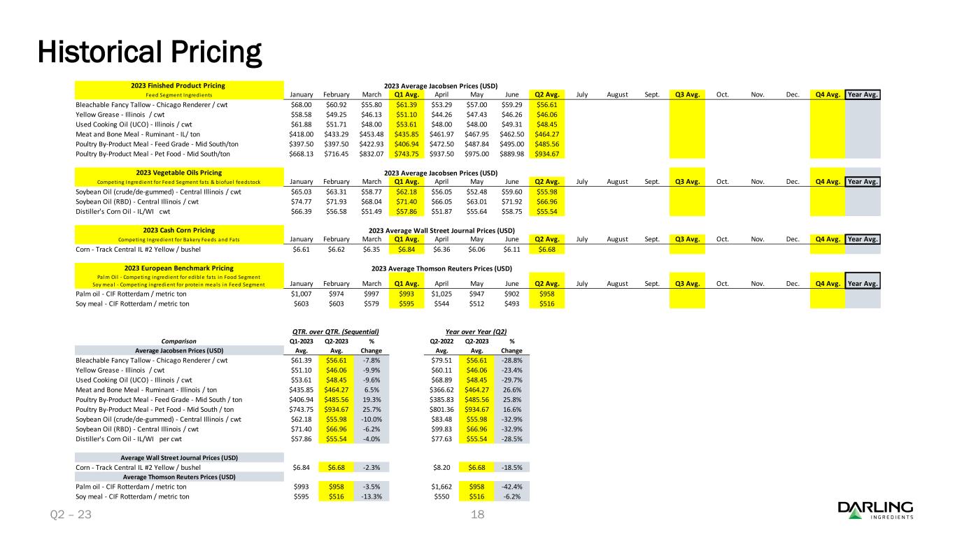 Historical Pricing Q2 – 23 18 2023 Finished Product Pricing Feed Segment Ingredients January February March Q1 Avg. April May June Q2 Avg. July August Sept. Q3 Avg. Oct. Nov. Dec. Q4 Avg. Year Avg. Bleachable Fancy Tallow - Chicago Renderer / cwt $68.00 $60.92 $55.80 $61.39 $53.29 $57.00 $59.29 $56.61 Yellow Grease - Illinois / cwt $58.58 $49.25 $46.13 $51.10 $44.26 $47.43 $46.26 $46.06 Used Cooking Oil (UCO) - Illinois / cwt $61.88 $51.71 $48.00 $53.61 $48.00 $48.00 $49.31 $48.45 Meat and Bone Meal - Ruminant - IL/ ton $418.00 $433.29 $453.48 $435.85 $461.97 $467.95 $462.50 $464.27 Poultry By-Product Meal - Feed Grade - Mid South/ton $397.50 $397.50 $422.93 $406.94 $472.50 $487.84 $495.00 $485.56 Poultry By-Product Meal - Pet Food - Mid South/ton $668.13 $716.45 $832.07 $743.75 $937.50 $975.00 $889.98 $934.67 2023 Vegetable Oils Pricing Competing Ingredient for Feed Segment fats & biofuel feedstock January February March Q1 Avg. April May June Q2 Avg. July August Sept. Q3 Avg. Oct. Nov. Dec. Q4 Avg. Year Avg. Soybean Oil (crude/de-gummed) - Central Illinois / cwt $65.03 $63.31 $58.77 $62.18 $56.05 $52.48 $59.60 $55.98 Soybean Oil (RBD) - Central Illinois / cwt $74.77 $71.93 $68.04 $71.40 $66.05 $63.01 $71.92 $66.96 Distiller's Corn Oil - IL/WI cwt $66.39 $56.58 $51.49 $57.86 $51.87 $55.64 $58.75 $55.54 2023 Cash Corn Pricing Competing Ingredient for Bakery Feeds and Fats January February March Q1 Avg. April May June Q2 Avg. July August Sept. Q3 Avg. Oct. Nov. Dec. Q4 Avg. Year Avg. Corn - Track Central IL #2 Yellow / bushel $6.61 $6.62 $6.35 $6.84 $6.36 $6.06 $6.11 $6.68 2023 European Benchmark Pricing Palm Oi l - Competing ingredient for edible fats in Food Segment Soy meal - Competing ingredient for protein meals in Feed Segment January February March Q1 Avg. April May June Q2 Avg. July August Sept. Q3 Avg. Oct. Nov. Dec. Q4 Avg. Year Avg. Palm oil - CIF Rotterdam / metric ton $1,007 $974 $997 $993 $1,025 $947 $902 $958 Soy meal - CIF Rotterdam / metric ton $603 $603 $579 $595 $544 $512 $493 $516 QTR. over QTR. (Sequential) Year over Year (Q2) Comparison Q1-2023 Q2-2023 % Q2-2022 Q2-2023 % Average Jacobsen Prices (USD) Avg. Avg. Change Avg. Avg. Change Bleachable Fancy Tallow - Chicago Renderer / cwt $61.39 $56.61 -7.8% $79.51 $56.61 -28.8% Yellow Grease - Illinois / cwt $51.10 $46.06 -9.9% $60.11 $46.06 -23.4% Used Cooking Oil (UCO) - Illinois / cwt $53.61 $48.45 -9.6% $68.89 $48.45 -29.7% Meat and Bone Meal - Ruminant - Illinois / ton $435.85 $464.27 6.5% $366.62 $464.27 26.6% Poultry By-Product Meal - Feed Grade - Mid South / ton $406.94 $485.56 19.3% $385.83 $485.56 25.8% Poultry By-Product Meal - Pet Food - Mid South / ton $743.75 $934.67 25.7% $801.36 $934.67 16.6% Soybean Oil (crude/de-gummed) - Central Illinois / cwt $62.18 $55.98 -10.0% $83.48 $55.98 -32.9% Soybean Oil (RBD) - Central Illinois / cwt $71.40 $66.96 -6.2% $99.83 $66.96 -32.9% Distiller's Corn Oil - IL/WI per cwt $57.86 $55.54 -4.0% $77.63 $55.54 -28.5% Average Wall Street Journal Prices (USD) Corn - Track Central IL #2 Yellow / bushel $6.84 $6.68 -2.3% $8.20 $6.68 -18.5% Average Thomson Reuters Prices (USD) Palm oil - CIF Rotterdam / metric ton $993 $958 -3.5% $1,662 $958 -42.4% Soy meal - CIF Rotterdam / metric ton $595 $516 -13.3% $550 $516 -6.2% 2023 Average Jacobsen Prices (USD) 2023 Average Jacobsen Prices (USD) 2023 Average Wall Street Journal Prices (USD) 2023 Average Thomson Reuters Prices (USD)