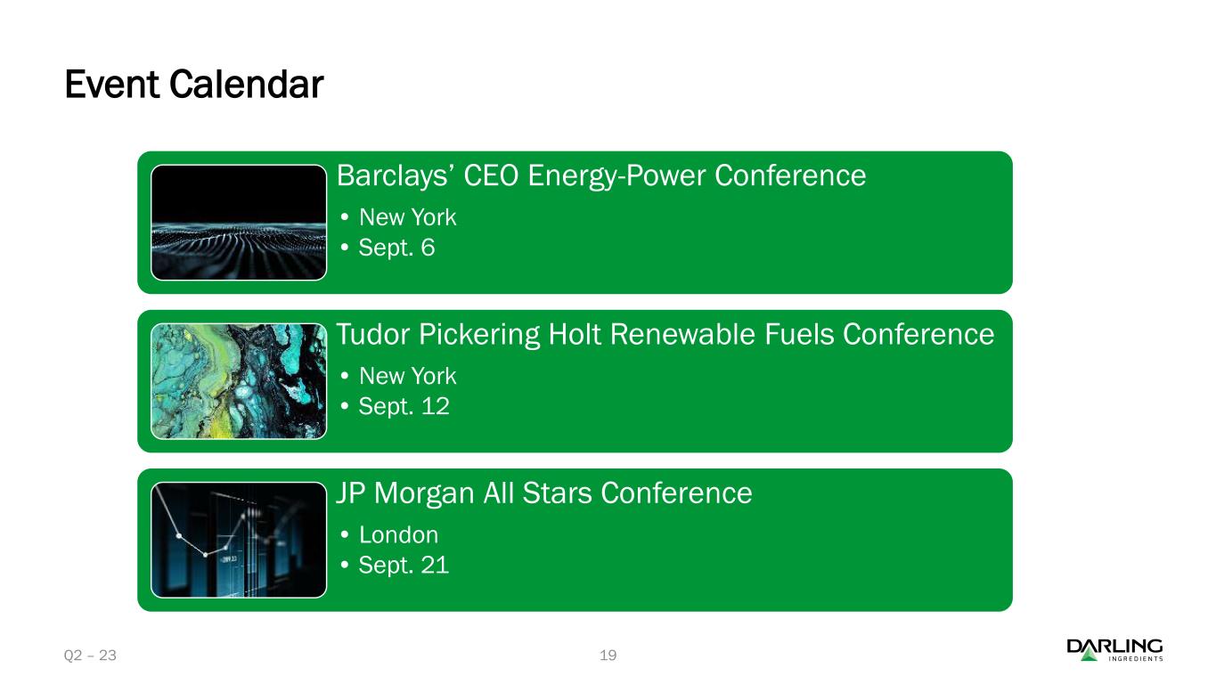 Event Calendar Q2 – 23 19 Barclays’ CEO Energy-Power Conference • New York • Sept. 6 Tudor Pickering Holt Renewable Fuels Conference • New York • Sept. 12 JP Morgan All Stars Conference • London • Sept. 21