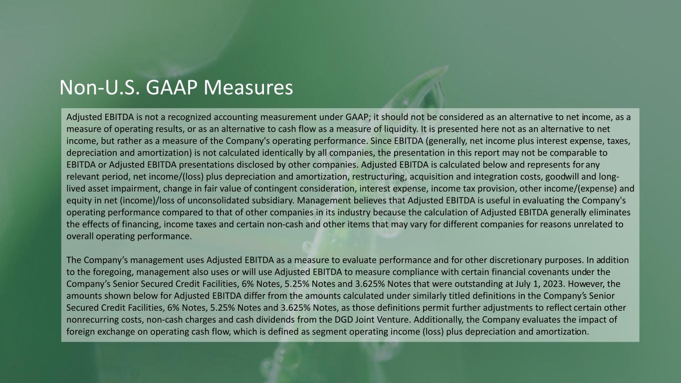 Non-U.S. GAAP Measures Adjusted EBITDA is not a recognized accounting measurement under GAAP; it should not be considered as an alternative to net income, as a measure of operating results, or as an alternative to cash flow as a measure of liquidity. It is presented here not as an alternative to net income, but rather as a measure of the Company's operating performance. Since EBITDA (generally, net income plus interest expense, taxes, depreciation and amortization) is not calculated identically by all companies, the presentation in this report may not be comparable to EBITDA or Adjusted EBITDA presentations disclosed by other companies. Adjusted EBITDA is calculated below and represents for any relevant period, net income/(loss) plus depreciation and amortization, restructuring, acquisition and integration costs, goodwill and long- lived asset impairment, change in fair value of contingent consideration, interest expense, income tax provision, other income/(expense) and equity in net (income)/loss of unconsolidated subsidiary. Management believes that Adjusted EBITDA is useful in evaluating the Company's operating performance compared to that of other companies in its industry because the calculation of Adjusted EBITDA generally eliminates the effects of financing, income taxes and certain non-cash and other items that may vary for different companies for reasons unrelated to overall operating performance. The Company’s management uses Adjusted EBITDA as a measure to evaluate performance and for other discretionary purposes. In addition to the foregoing, management also uses or will use Adjusted EBITDA to measure compliance with certain financial covenants under the Company’s Senior Secured Credit Facilities, 6% Notes, 5.25% Notes and 3.625% Notes that were outstanding at July 1, 2023. However, the amounts shown below for Adjusted EBITDA differ from the amounts calculated under similarly titled definitions in the Company’s Senior Secured Credit Facilities, 6% Notes, 5.25% Notes and 3.625% Notes, as those definitions permit further adjustments to reflect certain other nonrecurring costs, non-cash charges and cash dividends from the DGD Joint Venture. Additionally, the Company evaluates the impact of foreign exchange on operating cash flow, which is defined as segment operating income (loss) plus depreciation and amortization.