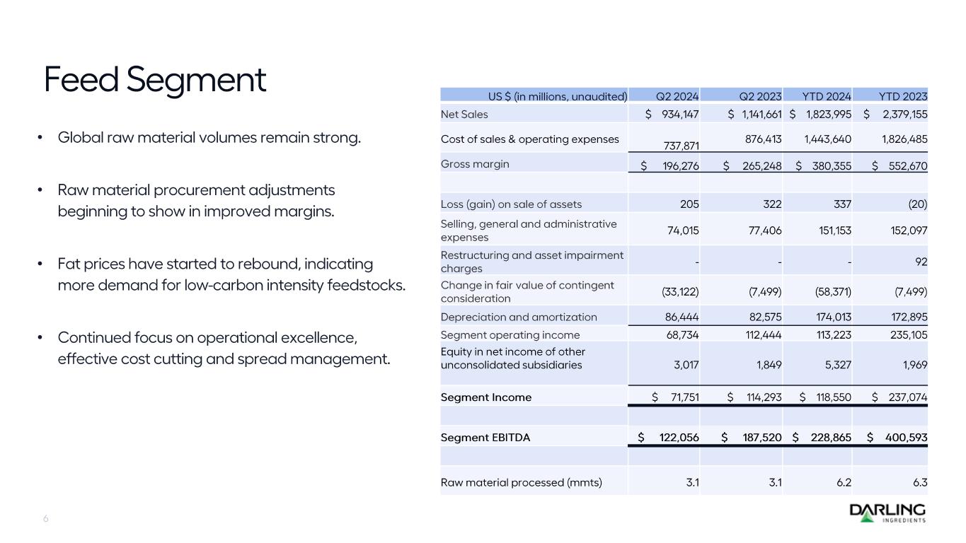 $330.6 $402.6 $394.7 $413.0$418.4 $508.3 $334.0 $350.9 $280.1 $273.6 0 100 200 300 400 500 600 Q122 Q222 Q323 Q422 Q123 Q223 Q323 Q423 Q124 Q224 Global Ingredients DGD Feed Food Fuel