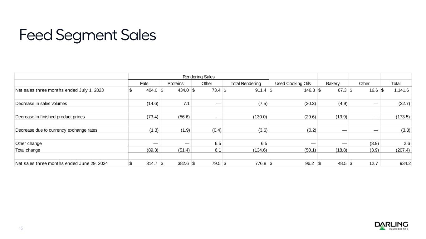 Fats Proteins Other Total Rendering Used Cooking Oils Bakery Other Total Net sales three months ended July 1, 2023 $ 404.0 $ 434.0 $ 73.4 $ 911.4 $ 146.3 $ 67.3 $ 16.6 $ 1,141.6 Decrease in sales volumes (14.6) 7.1 — (7.5) (20.3) (4.9) — (32.7) Decrease in finished product prices (73.4) (56.6) — (130.0) (29.6) (13.9) — (173.5) Decrease due to currency exchange rates (1.3) (1.9) (0.4) (3.6) (0.2) — — (3.8) Other change — — 6.5 6.5 — — (3.9) 2.6 Total change (89.3) (51.4) 6.1 (134.6) (50.1) (18.8) (3.9) (207.4) Net sales three months ended June 29, 2024 $ 314.7 $ 382.6 $ 79.5 $ 776.8 $ 96.2 $ 48.5 $ 12.7 934.2 Rendering Sales
