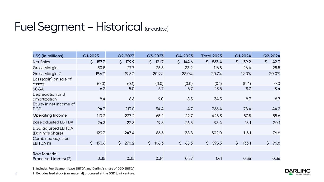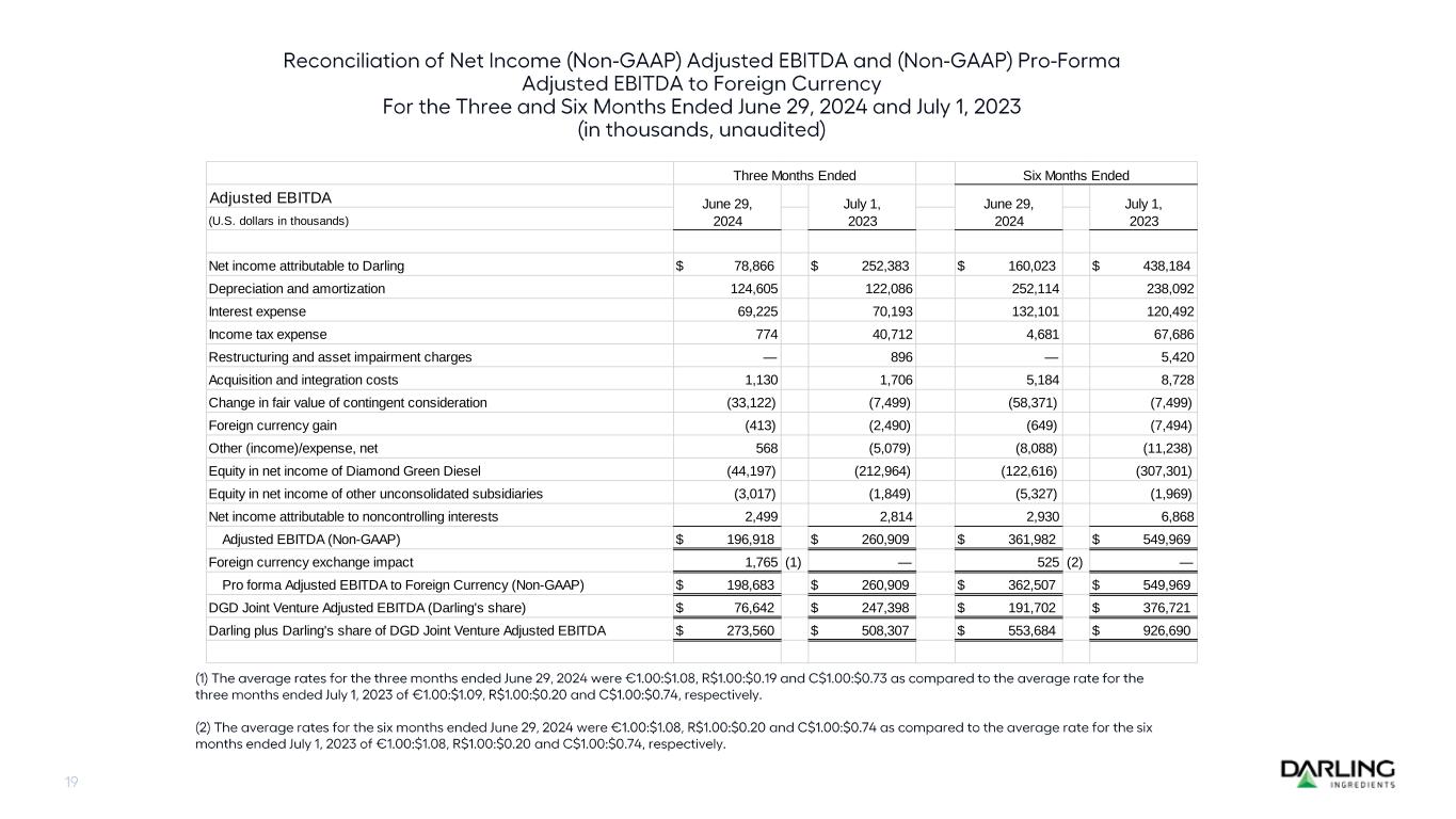Adjusted EBITDA (U.S. dollars in thousands) Net income attributable to Darling $ 78,866 $ 252,383 $ 160,023 $ 438,184 Depreciation and amortization 124,605 122,086 252,114 238,092 Interest expense 69,225 70,193 132,101 120,492 Income tax expense 774 40,712 4,681 67,686 Restructuring and asset impairment charges — 896 — 5,420 Acquisition and integration costs 1,130 1,706 5,184 8,728 Change in fair value of contingent consideration (33,122) (7,499) (58,371) (7,499) Foreign currency gain (413) (2,490) (649) (7,494) Other (income)/expense, net 568 (5,079) (8,088) (11,238) Equity in net income of Diamond Green Diesel (44,197) (212,964) (122,616) (307,301) Equity in net income of other unconsolidated subsidiaries (3,017) (1,849) (5,327) (1,969) Net income attributable to noncontrolling interests 2,499 2,814 2,930 6,868 Adjusted EBITDA (Non-GAAP) $ 196,918 $ 260,909 $ 361,982 $ 549,969 Foreign currency exchange impact 1,765 (1) — 525 (2) — Pro forma Adjusted EBITDA to Foreign Currency (Non-GAAP) $ 198,683 $ 260,909 $ 362,507 $ 549,969 DGD Joint Venture Adjusted EBITDA (Darling's share) $ 76,642 $ 247,398 $ 191,702 $ 376,721 Darling plus Darling's share of DGD Joint Venture Adjusted EBITDA $ 273,560 $ 508,307 $ 553,684 $ 926,690 June 29, 2024 July 1, 2023 June 29, 2024 Three Months Ended July 1, 2023 Six Months Ended