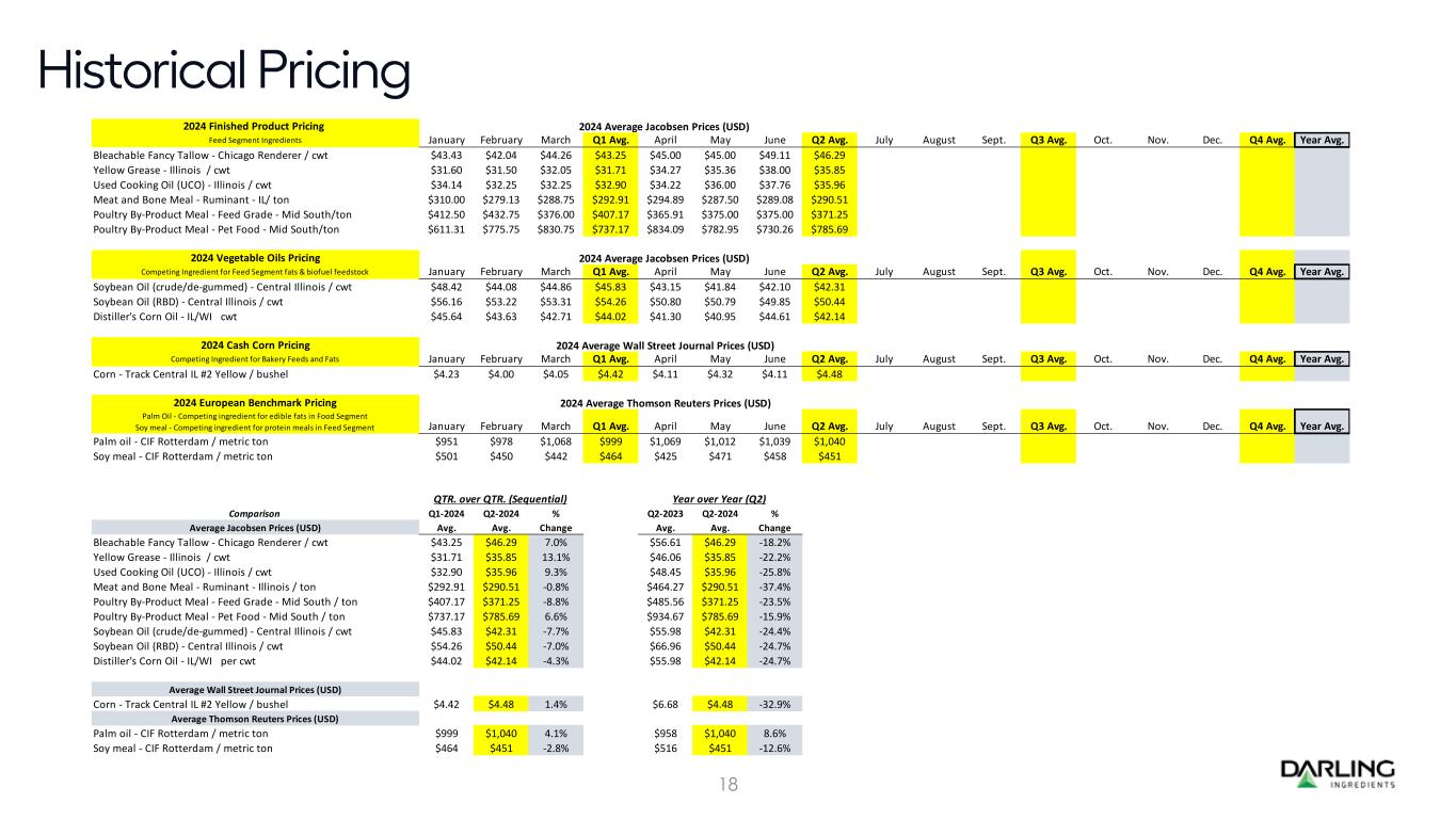2024 Finished Product Pricing Feed Segment Ingredients January February March Q1 Avg. April May June Q2 Avg. July August Sept. Q3 Avg. Oct. Nov. Dec. Q4 Avg. Year Avg. Bleachable Fancy Tallow - Chicago Renderer / cwt $43.43 $42.04 $44.26 $43.25 $45.00 $45.00 $49.11 $46.29 Yellow Grease - Illinois / cwt $31.60 $31.50 $32.05 $31.71 $34.27 $35.36 $38.00 $35.85 Used Cooking Oil (UCO) - Illinois / cwt $34.14 $32.25 $32.25 $32.90 $34.22 $36.00 $37.76 $35.96 Meat and Bone Meal - Ruminant - IL/ ton $310.00 $279.13 $288.75 $292.91 $294.89 $287.50 $289.08 $290.51 Poultry By-Product Meal - Feed Grade - Mid South/ton $412.50 $432.75 $376.00 $407.17 $365.91 $375.00 $375.00 $371.25 Poultry By-Product Meal - Pet Food - Mid South/ton $611.31 $775.75 $830.75 $737.17 $834.09 $782.95 $730.26 $785.69 2024 Vegetable Oils Pricing Competing Ingredient for Feed Segment fats & biofuel feedstock January February March Q1 Avg. April May June Q2 Avg. July August Sept. Q3 Avg. Oct. Nov. Dec. Q4 Avg. Year Avg. Soybean Oil (crude/de-gummed) - Central Illinois / cwt $48.42 $44.08 $44.86 $45.83 $43.15 $41.84 $42.10 $42.31 Soybean Oil (RBD) - Central Illinois / cwt $56.16 $53.22 $53.31 $54.26 $50.80 $50.79 $49.85 $50.44 Distiller's Corn Oil - IL/WI cwt $45.64 $43.63 $42.71 $44.02 $41.30 $40.95 $44.61 $42.14 2024 Cash Corn Pricing Competing Ingredient for Bakery Feeds and Fats January February March Q1 Avg. April May June Q2 Avg. July August Sept. Q3 Avg. Oct. Nov. Dec. Q4 Avg. Year Avg. Corn - Track Central IL #2 Yellow / bushel $4.23 $4.00 $4.05 $4.42 $4.11 $4.32 $4.11 $4.48 2024 European Benchmark Pricing Palm Oil - Competing ingredient for edible fats in Food Segment Soy meal - Competing ingredient for protein meals in Feed Segment January February March Q1 Avg. April May June Q2 Avg. July August Sept. Q3 Avg. Oct. Nov. Dec. Q4 Avg. Year Avg. Palm oil - CIF Rotterdam / metric ton $951 $978 $1,068 $999 $1,069 $1,012 $1,039 $1,040 Soy meal - CIF Rotterdam / metric ton $501 $450 $442 $464 $425 $471 $458 $451 QTR. over QTR. (Sequential) Year over Year (Q2) Comparison Q1-2024 Q2-2024 % Q2-2023 Q2-2024 % Average Jacobsen Prices (USD) Avg. Avg. Change Avg. Avg. Change Bleachable Fancy Tallow - Chicago Renderer / cwt $43.25 $46.29 7.0% $56.61 $46.29 -18.2% Yellow Grease - Illinois / cwt $31.71 $35.85 13.1% $46.06 $35.85 -22.2% Used Cooking Oil (UCO) - Illinois / cwt $32.90 $35.96 9.3% $48.45 $35.96 -25.8% Meat and Bone Meal - Ruminant - Illinois / ton $292.91 $290.51 -0.8% $464.27 $290.51 -37.4% Poultry By-Product Meal - Feed Grade - Mid South / ton $407.17 $371.25 -8.8% $485.56 $371.25 -23.5% Poultry By-Product Meal - Pet Food - Mid South / ton $737.17 $785.69 6.6% $934.67 $785.69 -15.9% Soybean Oil (crude/de-gummed) - Central Illinois / cwt $45.83 $42.31 -7.7% $55.98 $42.31 -24.4% Soybean Oil (RBD) - Central Illinois / cwt $54.26 $50.44 -7.0% $66.96 $50.44 -24.7% Distiller's Corn Oil - IL/WI per cwt $44.02 $42.14 -4.3% $55.98 $42.14 -24.7% Average Wall Street Journal Prices (USD) Corn - Track Central IL #2 Yellow / bushel $4.42 $4.48 1.4% $6.68 $4.48 -32.9% Average Thomson Reuters Prices (USD) Palm oil - CIF Rotterdam / metric ton $999 $1,040 4.1% $958 $1,040 8.6% Soy meal - CIF Rotterdam / metric ton $464 $451 -2.8% $516 $451 -12.6% 2024 Average Jacobsen Prices (USD) 2024 Average Jacobsen Prices (USD) 2024 Average Wall Street Journal Prices (USD) 2024 Average Thomson Reuters Prices (USD) 18
