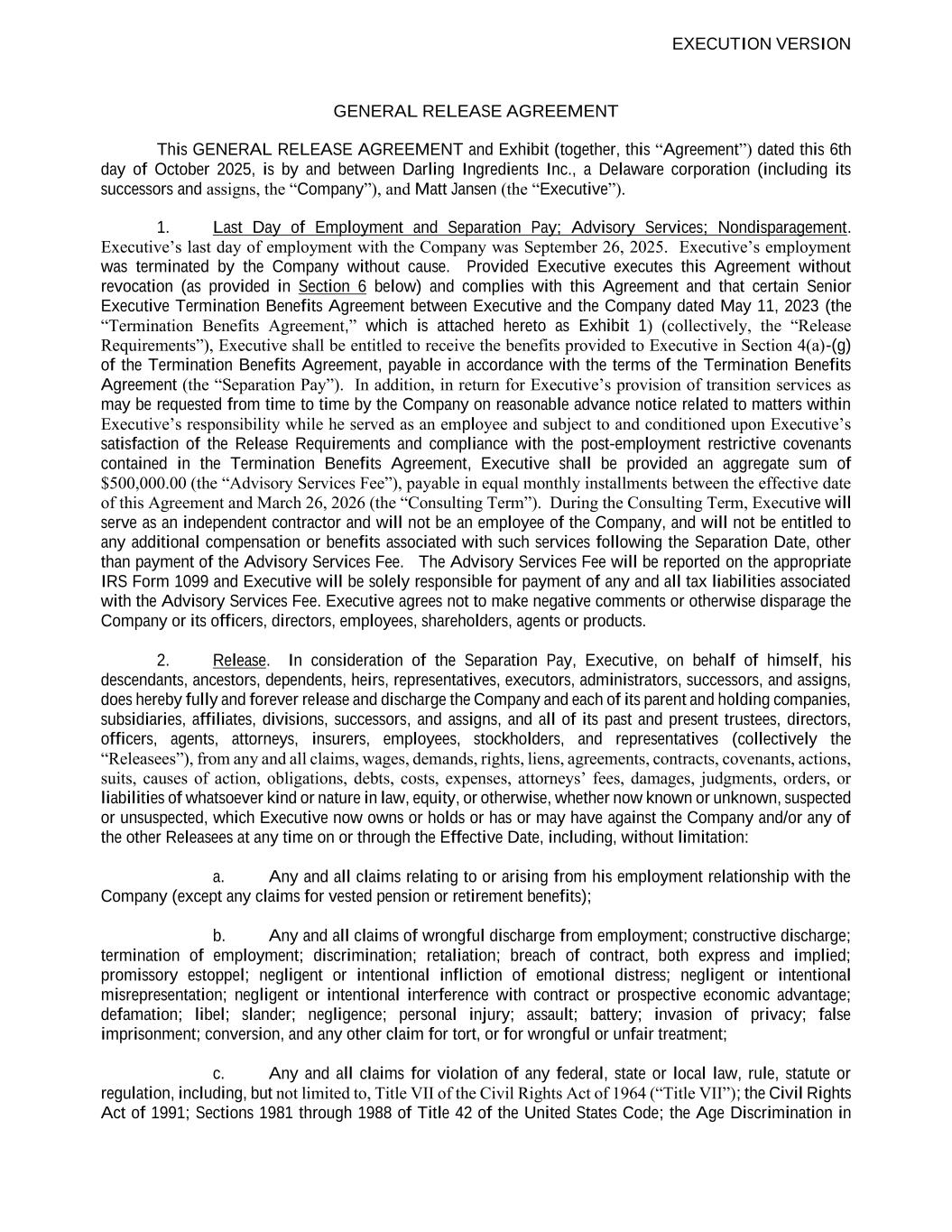 EXECUTION VERSION GENERAL RELEASE AGREEMENT This GENERAL RELEASE AGREEMENT and Exhibit (together, this “Agreement”) dated this 6th day of October 2025, is by and between Darling Ingredients Inc., a Delaware corporation (including its successors and assigns, the “Company”), and Matt Jansen (the “Executive”). 1. Last Day of Employment and Separation Pay; Advisory Services; Nondisparagement. Executive’s last day of employment with the Company was September 26, 2025. Executive’s employment was terminated by the Company without cause. Provided Executive executes this Agreement without revocation (as provided in Section 6 below) and complies with this Agreement and that certain Senior Executive Termination Benefits Agreement between Executive and the Company dated May 11, 2023 (the “Termination Benefits Agreement,” which is attached hereto as Exhibit 1) (collectively, the “Release Requirements”), Executive shall be entitled to receive the benefits provided to Executive in Section 4(a)-(g) of the Termination Benefits Agreement, payable in accordance with the terms of the Termination Benefits Agreement (the “Separation Pay”). In addition, in return for Executive’s provision of transition services as may be requested from time to time by the Company on reasonable advance notice related to matters within Executive’s responsibility while he served as an employee and subject to and conditioned upon Executive’s satisfaction of the Release Requirements and compliance with the post-employment restrictive covenants contained in the Termination Benefits Agreement, Executive shall be provided an aggregate sum of $500,000.00 (the “Advisory Services Fee”), payable in equal monthly installments between the effective date of this Agreement and March 26, 2026 (the “Consulting Term”). During the Consulting Term, Executive will serve as an independent contractor and will not be an employee of the Company, and will not be entitled to any additional compensation or benefits associated with such services following the Separation Date, other than payment of the Advisory Services Fee. The Advisory Services Fee will be reported on the appropriate IRS Form 1099 and Executive will be solely responsible for payment of any and all tax liabilities associated with the Advisory Services Fee. Executive agrees not to make negative comments or otherwise disparage the Company or its officers, directors, employees, shareholders, agents or products. 2. Release. In consideration of the Separation Pay, Executive, on behalf of himself, his descendants, ancestors, dependents, heirs, representatives, executors, administrators, successors, and assigns, does hereby fully and forever release and discharge the Company and each of its parent and holding companies, subsidiaries, affiliates, divisions, successors, and assigns, and all of its past and present trustees, directors, officers, agents, attorneys, insurers, employees, stockholders, and representatives (collectively the “Releasees”), from any and all claims, wages, demands, rights, liens, agreements, contracts, covenants, actions, suits, causes of action, obligations, debts, costs, expenses, attorneys’ fees, damages, judgments, orders, or liabilities of whatsoever kind or nature in law, equity, or otherwise, whether now known or unknown, suspected or unsuspected, which Executive now owns or holds or has or may have against the Company and/or any of the other Releasees at any time on or through the Effective Date, including, without limitation: a. Any and all claims relating to or arising from his employment relationship with the Company (except any claims for vested pension or retirement benefits); b. Any and all claims of wrongful discharge from employment; constructive discharge; termination of employment; discrimination; retaliation; breach of contract, both express and implied; promissory estoppel; negligent or intentional infliction of emotional distress; negligent or intentional misrepresentation; negligent or intentional interference with contract or prospective economic advantage; defamation; libel; slander; negligence; personal injury; assault; battery; invasion of privacy; false imprisonment; conversion, and any other claim for tort, or for wrongful or unfair treatment; c. Any and all claims for violation of any federal, state or local law, rule, statute or regulation, including, but not limited to, Title VII of the Civil Rights Act of 1964 (“Title VII”); the Civil Rights Act of 1991; Sections 1981 through 1988 of Title 42 of the United States Code; the Age Discrimination in