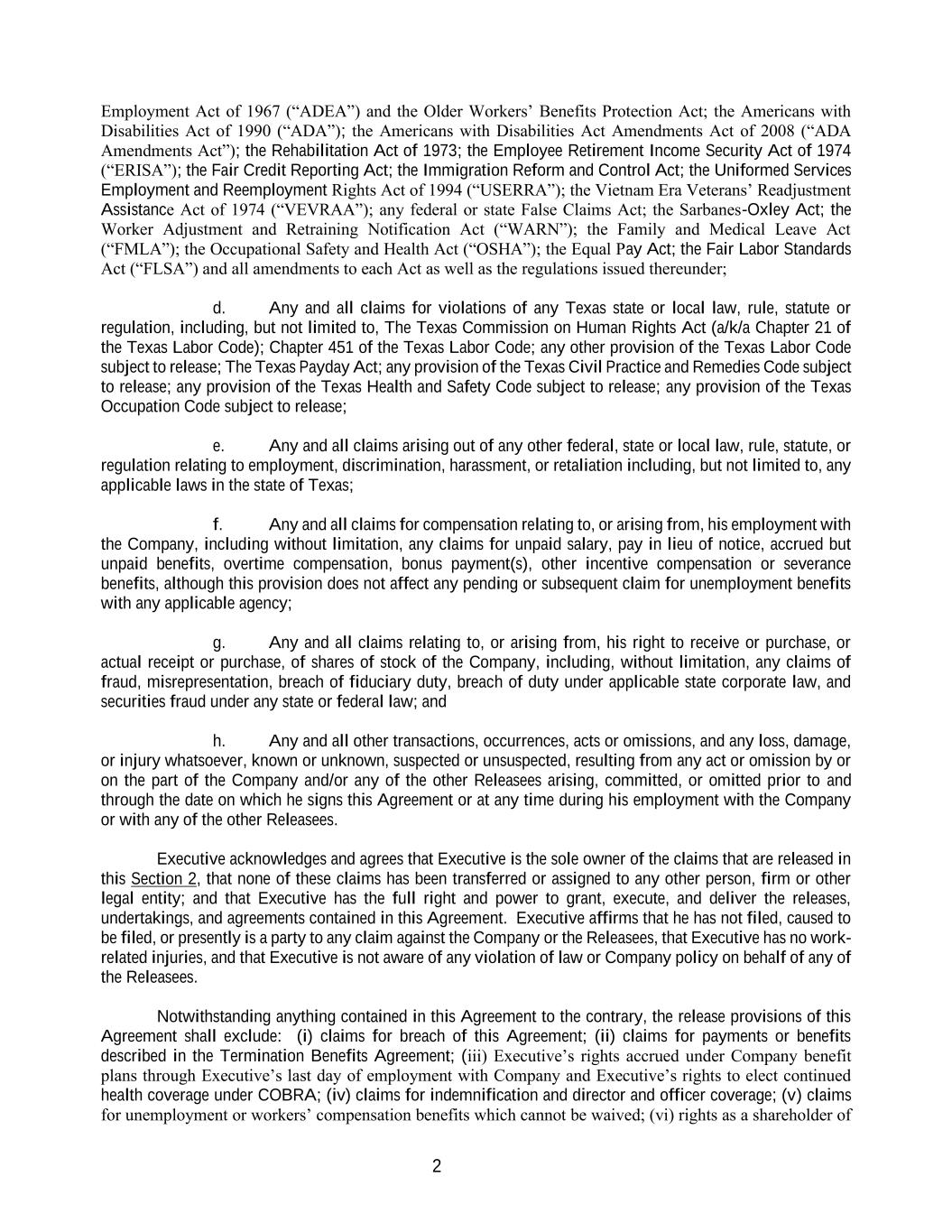 2 Employment Act of 1967 (“ADEA”) and the Older Workers’ Benefits Protection Act; the Americans with Disabilities Act of 1990 (“ADA”); the Americans with Disabilities Act Amendments Act of 2008 (“ADA Amendments Act”); the Rehabilitation Act of 1973; the Employee Retirement Income Security Act of 1974 (“ERISA”); the Fair Credit Reporting Act; the Immigration Reform and Control Act; the Uniformed Services Employment and Reemployment Rights Act of 1994 (“USERRA”); the Vietnam Era Veterans’ Readjustment Assistance Act of 1974 (“VEVRAA”); any federal or state False Claims Act; the Sarbanes-Oxley Act; the Worker Adjustment and Retraining Notification Act (“WARN”); the Family and Medical Leave Act (“FMLA”); the Occupational Safety and Health Act (“OSHA”); the Equal Pay Act; the Fair Labor Standards Act (“FLSA”) and all amendments to each Act as well as the regulations issued thereunder; d. Any and all claims for violations of any Texas state or local law, rule, statute or regulation, including, but not limited to, The Texas Commission on Human Rights Act (a/k/a Chapter 21 of the Texas Labor Code); Chapter 451 of the Texas Labor Code; any other provision of the Texas Labor Code subject to release; The Texas Payday Act; any provision of the Texas Civil Practice and Remedies Code subject to release; any provision of the Texas Health and Safety Code subject to release; any provision of the Texas Occupation Code subject to release; e. Any and all claims arising out of any other federal, state or local law, rule, statute, or regulation relating to employment, discrimination, harassment, or retaliation including, but not limited to, any applicable laws in the state of Texas; f. Any and all claims for compensation relating to, or arising from, his employment with the Company, including without limitation, any claims for unpaid salary, pay in lieu of notice, accrued but unpaid benefits, overtime compensation, bonus payment(s), other incentive compensation or severance benefits, although this provision does not affect any pending or subsequent claim for unemployment benefits with any applicable agency; g. Any and all claims relating to, or arising from, his right to receive or purchase, or actual receipt or purchase, of shares of stock of the Company, including, without limitation, any claims of fraud, misrepresentation, breach of fiduciary duty, breach of duty under applicable state corporate law, and securities fraud under any state or federal law; and h. Any and all other transactions, occurrences, acts or omissions, and any loss, damage, or injury whatsoever, known or unknown, suspected or unsuspected, resulting from any act or omission by or on the part of the Company and/or any of the other Releasees arising, committed, or omitted prior to and through the date on which he signs this Agreement or at any time during his employment with the Company or with any of the other Releasees. Executive acknowledges and agrees that Executive is the sole owner of the claims that are released in this Section 2, that none of these claims has been transferred or assigned to any other person, firm or other legal entity; and that Executive has the full right and power to grant, execute, and deliver the releases, undertakings, and agreements contained in this Agreement. Executive affirms that he has not filed, caused to be filed, or presently is a party to any claim against the Company or the Releasees, that Executive has no work- related injuries, and that Executive is not aware of any violation of law or Company policy on behalf of any of the Releasees. Notwithstanding anything contained in this Agreement to the contrary, the release provisions of this Agreement shall exclude: (i) claims for breach of this Agreement; (ii) claims for payments or benefits described in the Termination Benefits Agreement; (iii) Executive’s rights accrued under Company benefit plans through Executive’s last day of employment with Company and Executive’s rights to elect continued health coverage under COBRA; (iv) claims for indemnification and director and officer coverage; (v) claims for unemployment or workers’ compensation benefits which cannot be waived; (vi) rights as a shareholder of