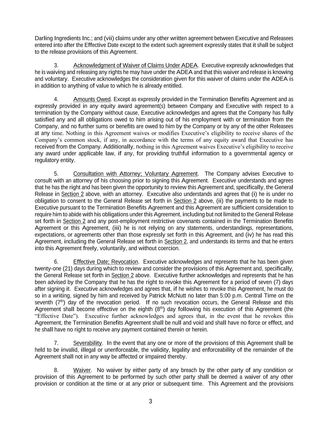 3 Darling Ingredients Inc.; and (vii) claims under any other written agreement between Executive and Releasees entered into after the Effective Date except to the extent such agreement expressly states that it shall be subject to the release provisions of this Agreement. 3. Acknowledgment of Waiver of Claims Under ADEA. Executive expressly acknowledges that he is waiving and releasing any rights he may have under the ADEA and that this waiver and release is knowing and voluntary. Executive acknowledges the consideration given for this waiver of claims under the ADEA is in addition to anything of value to which he is already entitled. 4. Amounts Owed. Except as expressly provided in the Termination Benefits Agreement and as expressly provided in any equity award agreement(s) between Company and Executive with respect to a termination by the Company without cause, Executive acknowledges and agrees that the Company has fully satisfied any and all obligations owed to him arising out of his employment with or termination from the Company, and no further sums or benefits are owed to him by the Company or by any of the other Releasees at any time. Nothing in this Agreement waives or modifies Executive’s eligibility to receive shares of the Company’s common stock, if any, in accordance with the terms of any equity award that Executive has received from the Company. Additionally, nothing in this Agreement waives Executive’s eligibility to receive any award under applicable law, if any, for providing truthful information to a governmental agency or regulatory entity. 5. Consultation with Attorney; Voluntary Agreement. The Company advises Executive to consult with an attorney of his choosing prior to signing this Agreement. Executive understands and agrees that he has the right and has been given the opportunity to review this Agreement and, specifically, the General Release in Section 2 above, with an attorney. Executive also understands and agrees that (i) he is under no obligation to consent to the General Release set forth in Section 2 above, (ii) the payments to be made to Executive pursuant to the Termination Benefits Agreement and this Agreement are sufficient consideration to require him to abide with his obligations under this Agreement, including but not limited to the General Release set forth in Section 2 and any post-employment restrictive covenants contained in the Termination Benefits Agreement or this Agreement, (iii) he is not relying on any statements, understandings, representations, expectations, or agreements other than those expressly set forth in this Agreement, and (iv) he has read this Agreement, including the General Release set forth in Section 2, and understands its terms and that he enters into this Agreement freely, voluntarily, and without coercion. 6. Effective Date; Revocation. Executive acknowledges and represents that he has been given twenty-one (21) days during which to review and consider the provisions of this Agreement and, specifically, the General Release set forth in Section 2 above. Executive further acknowledges and represents that he has been advised by the Company that he has the right to revoke this Agreement for a period of seven (7) days after signing it. Executive acknowledges and agrees that, if he wishes to revoke this Agreement, he must do so in a writing, signed by him and received by Patrick McNutt no later than 5:00 p.m. Central Time on the seventh (7th) day of the revocation period. If no such revocation occurs, the General Release and this Agreement shall become effective on the eighth (8th) day following his execution of this Agreement (the “Effective Date”). Executive further acknowledges and agrees that, in the event that he revokes this Agreement, the Termination Benefits Agreement shall be null and void and shall have no force or effect, and he shall have no right to receive any payment contained therein or herein. 7. Severability. In the event that any one or more of the provisions of this Agreement shall be held to be invalid, illegal or unenforceable, the validity, legality and enforceability of the remainder of the Agreement shall not in any way be affected or impaired thereby. 8. Waiver. No waiver by either party of any breach by the other party of any condition or provision of this Agreement to be performed by such other party shall be deemed a waiver of any other provision or condition at the time or at any prior or subsequent time. This Agreement and the provisions
