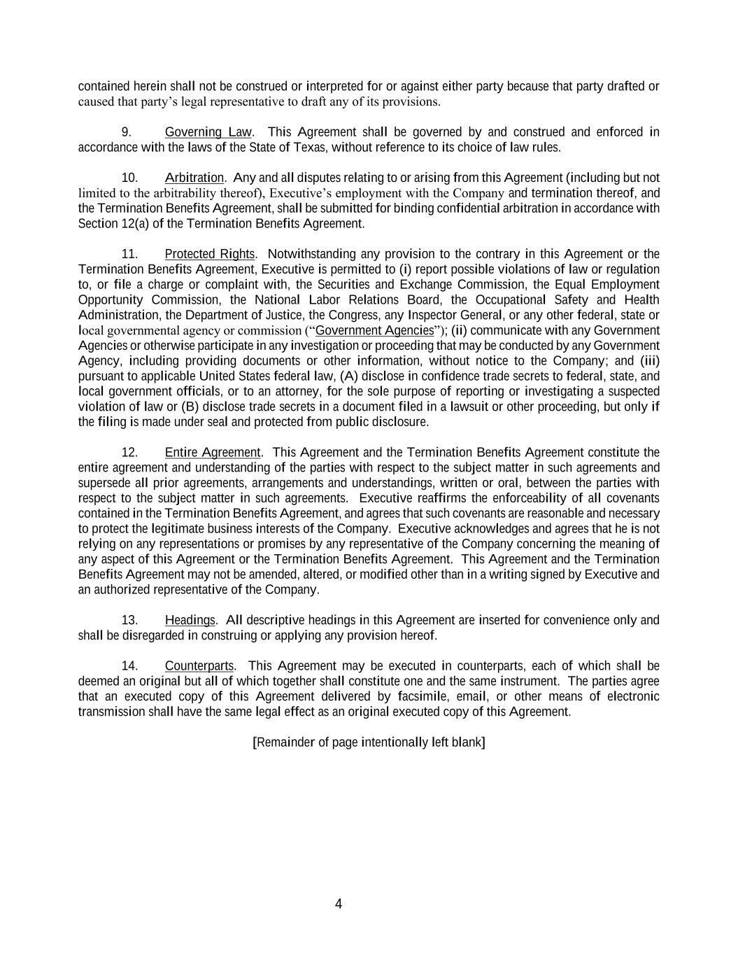 4 contained herein shall not be construed or interpreted for or against either party because that party drafted or caused that party’s legal representative to draft any of its provisions. 9. Governing Law. This Agreement shall be governed by and construed and enforced in accordance with the laws of the State of Texas, without reference to its choice of law rules. 10. Arbitration. Any and all disputes relating to or arising from this Agreement (including but not limited to the arbitrability thereof), Executive’s employment with the Company and termination thereof, and the Termination Benefits Agreement, shall be submitted for binding confidential arbitration in accordance with Section 12(a) of the Termination Benefits Agreement. 11. Protected Rights. Notwithstanding any provision to the contrary in this Agreement or the Termination Benefits Agreement, Executive is permitted to (i) report possible violations of law or regulation to, or file a charge or complaint with, the Securities and Exchange Commission, the Equal Employment Opportunity Commission, the National Labor Relations Board, the Occupational Safety and Health Administration, the Department of Justice, the Congress, any Inspector General, or any other federal, state or local governmental agency or commission (“Government Agencies”); (ii) communicate with any Government Agencies or otherwise participate in any investigation or proceeding that may be conducted by any Government Agency, including providing documents or other information, without notice to the Company; and (iii) pursuant to applicable United States federal law, (A) disclose in confidence trade secrets to federal, state, and local government officials, or to an attorney, for the sole purpose of reporting or investigating a suspected violation of law or (B) disclose trade secrets in a document filed in a lawsuit or other proceeding, but only if the filing is made under seal and protected from public disclosure. 12. Entire Agreement. This Agreement and the Termination Benefits Agreement constitute the entire agreement and understanding of the parties with respect to the subject matter in such agreements and supersede all prior agreements, arrangements and understandings, written or oral, between the parties with respect to the subject matter in such agreements. Executive reaffirms the enforceability of all covenants contained in the Termination Benefits Agreement, and agrees that such covenants are reasonable and necessary to protect the legitimate business interests of the Company. Executive acknowledges and agrees that he is not relying on any representations or promises by any representative of the Company concerning the meaning of any aspect of this Agreement or the Termination Benefits Agreement. This Agreement and the Termination Benefits Agreement may not be amended, altered, or modified other than in a writing signed by Executive and an authorized representative of the Company. 13. Headings. All descriptive headings in this Agreement are inserted for convenience only and shall be disregarded in construing or applying any provision hereof. 14. Counterparts. This Agreement may be executed in counterparts, each of which shall be deemed an original but all of which together shall constitute one and the same instrument. The parties agree that an executed copy of this Agreement delivered by facsimile, email, or other means of electronic transmission shall have the same legal effect as an original executed copy of this Agreement. [Remainder of page intentionally left blank]
