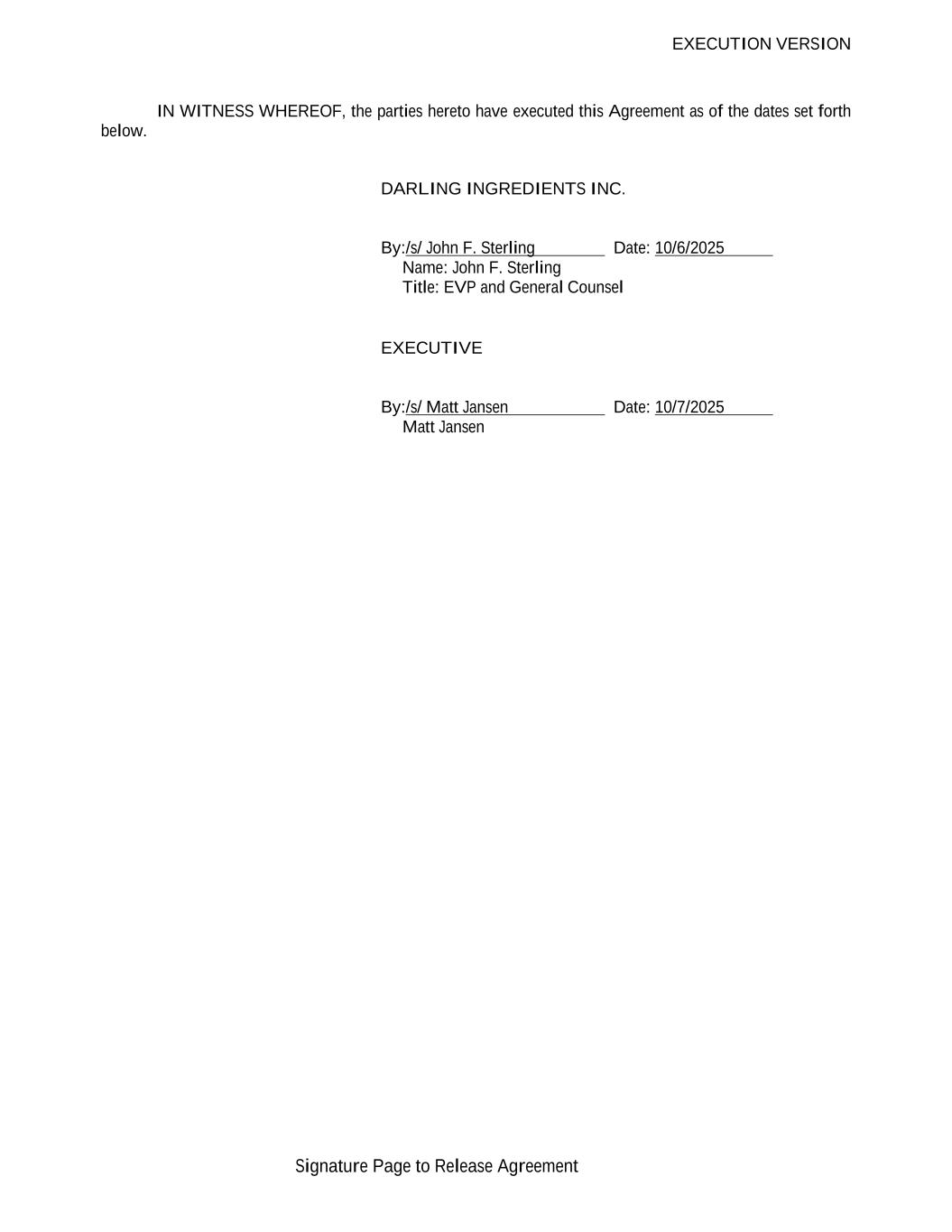 EXECUTION VERSION Signature Page to Release Agreement IN WITNESS WHEREOF, the parties hereto have executed this Agreement as of the dates set forth below. DARLING INGREDIENTS INC. By:/s/ John F. Sterling Date: 10/6/2025 Name: John F. Sterling Title: EVP and General Counsel EXECUTIVE By:/s/ Matt Jansen Date: 10/7/2025 Matt Jansen