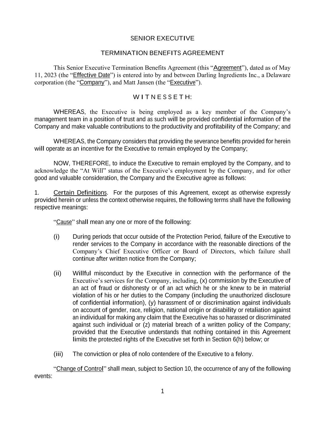 1 SENIOR EXECUTIVE TERMINATION BENEFITS AGREEMENT This Senior Executive Termination Benefits Agreement (this “Agreement”), dated as of May 11, 2023 (the “Effective Date”) is entered into by and between Darling Ingredients Inc., a Delaware corporation (the “Company”), and Matt Jansen (the “Executive”). W I T N E S S E T H: WHEREAS, the Executive is being employed as a key member of the Company’s management team in a position of trust and as such will be provided confidential information of the Company and make valuable contributions to the productivity and profitability of the Company; and WHEREAS, the Company considers that providing the severance benefits provided for herein will operate as an incentive for the Executive to remain employed by the Company; NOW, THEREFORE, to induce the Executive to remain employed by the Company, and to acknowledge the “At Will” status of the Executive’s employment by the Company, and for other good and valuable consideration, the Company and the Executive agree as follows: 1. Certain Definitions. For the purposes of this Agreement, except as otherwise expressly provided herein or unless the context otherwise requires, the following terms shall have the following respective meanings: “Cause” shall mean any one or more of the following: (i) During periods that occur outside of the Protection Period, failure of the Executive to render services to the Company in accordance with the reasonable directions of the Company’s Chief Executive Officer or Board of Directors, which failure shall continue after written notice from the Company; (ii) Willful misconduct by the Executive in connection with the performance of the Executive’s services for the Company, including, (x) commission by the Executive of an act of fraud or dishonesty or of an act which he or she knew to be in material violation of his or her duties to the Company (including the unauthorized disclosure of confidential information), (y) harassment of or discrimination against individuals on account of gender, race, religion, national origin or disability or retaliation against an individual for making any claim that the Executive has so harassed or discriminated against such individual or (z) material breach of a written policy of the Company; provided that the Executive understands that nothing contained in this Agreement limits the protected rights of the Executive set forth in Section 6(h) below; or (iii) The conviction or plea of nolo contendere of the Executive to a felony. “Change of Control” shall mean, subject to Section 10, the occurrence of any of the following events: