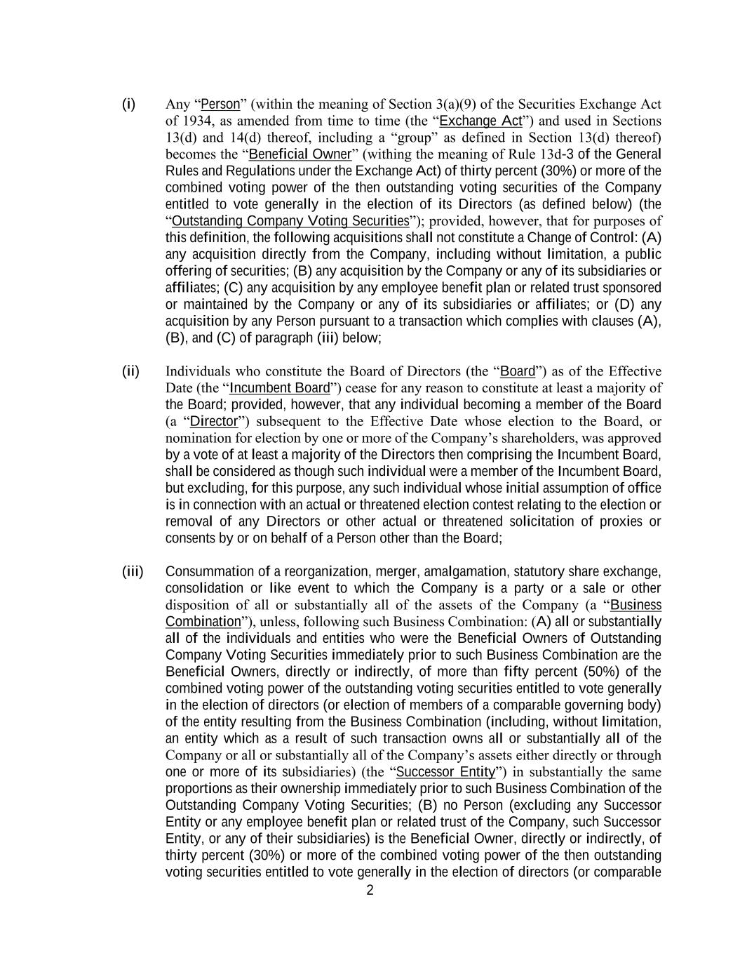 2 (i) Any “Person” (within the meaning of Section 3(a)(9) of the Securities Exchange Act of 1934, as amended from time to time (the “Exchange Act”) and used in Sections 13(d) and 14(d) thereof, including a “group” as defined in Section 13(d) thereof) becomes the “Beneficial Owner” (withing the meaning of Rule 13d-3 of the General Rules and Regulations under the Exchange Act) of thirty percent (30%) or more of the combined voting power of the then outstanding voting securities of the Company entitled to vote generally in the election of its Directors (as defined below) (the “Outstanding Company Voting Securities”); provided, however, that for purposes of this definition, the following acquisitions shall not constitute a Change of Control: (A) any acquisition directly from the Company, including without limitation, a public offering of securities; (B) any acquisition by the Company or any of its subsidiaries or affiliates; (C) any acquisition by any employee benefit plan or related trust sponsored or maintained by the Company or any of its subsidiaries or affiliates; or (D) any acquisition by any Person pursuant to a transaction which complies with clauses (A), (B), and (C) of paragraph (iii) below; (ii) Individuals who constitute the Board of Directors (the “Board”) as of the Effective Date (the “Incumbent Board”) cease for any reason to constitute at least a majority of the Board; provided, however, that any individual becoming a member of the Board (a “Director”) subsequent to the Effective Date whose election to the Board, or nomination for election by one or more of the Company’s shareholders, was approved by a vote of at least a majority of the Directors then comprising the Incumbent Board, shall be considered as though such individual were a member of the Incumbent Board, but excluding, for this purpose, any such individual whose initial assumption of office is in connection with an actual or threatened election contest relating to the election or removal of any Directors or other actual or threatened solicitation of proxies or consents by or on behalf of a Person other than the Board; (iii) Consummation of a reorganization, merger, amalgamation, statutory share exchange, consolidation or like event to which the Company is a party or a sale or other disposition of all or substantially all of the assets of the Company (a “Business Combination”), unless, following such Business Combination: (A) all or substantially all of the individuals and entities who were the Beneficial Owners of Outstanding Company Voting Securities immediately prior to such Business Combination are the Beneficial Owners, directly or indirectly, of more than fifty percent (50%) of the combined voting power of the outstanding voting securities entitled to vote generally in the election of directors (or election of members of a comparable governing body) of the entity resulting from the Business Combination (including, without limitation, an entity which as a result of such transaction owns all or substantially all of the Company or all or substantially all of the Company’s assets either directly or through one or more of its subsidiaries) (the “Successor Entity”) in substantially the same proportions as their ownership immediately prior to such Business Combination of the Outstanding Company Voting Securities; (B) no Person (excluding any Successor Entity or any employee benefit plan or related trust of the Company, such Successor Entity, or any of their subsidiaries) is the Beneficial Owner, directly or indirectly, of thirty percent (30%) or more of the combined voting power of the then outstanding voting securities entitled to vote generally in the election of directors (or comparable