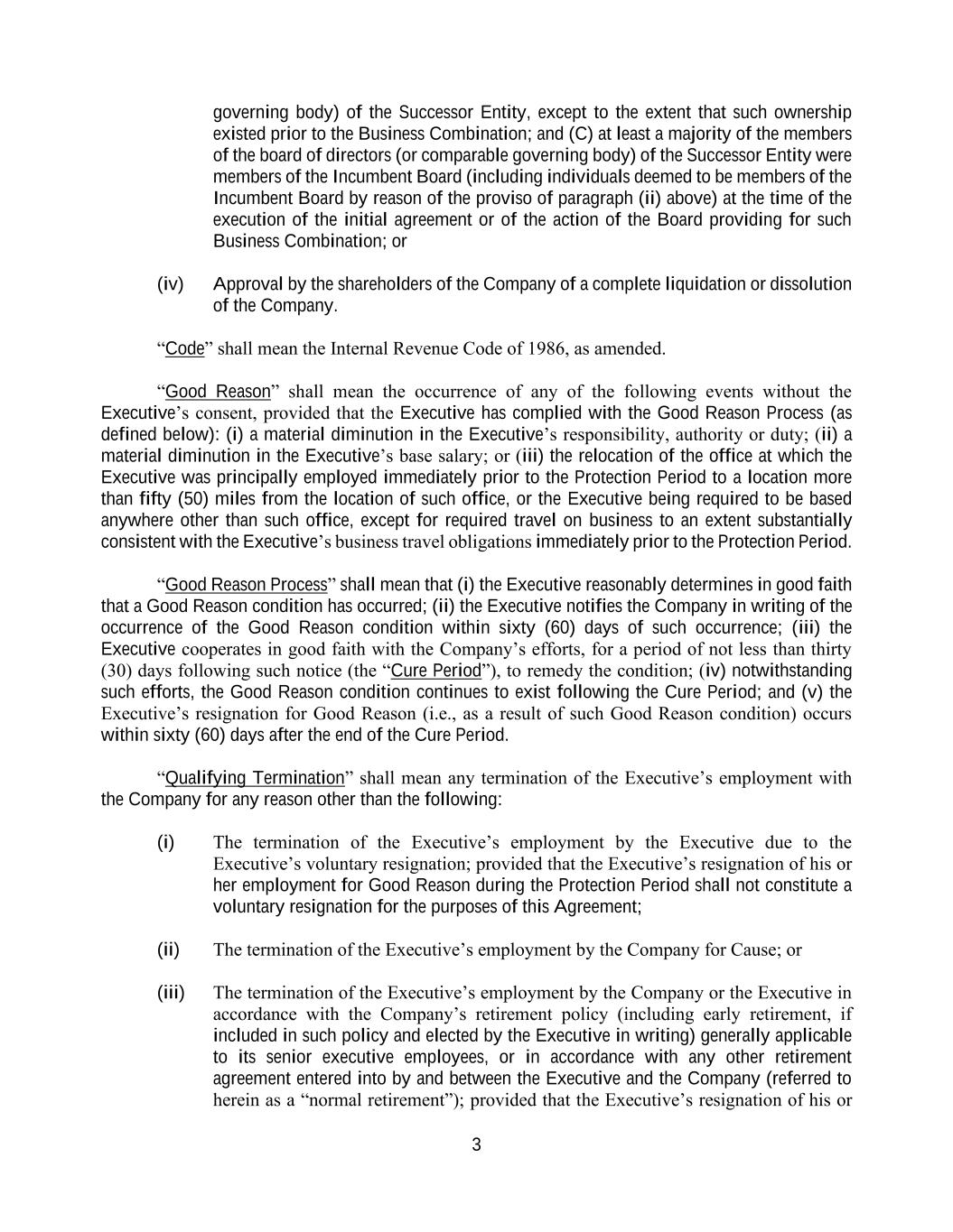 3 governing body) of the Successor Entity, except to the extent that such ownership existed prior to the Business Combination; and (C) at least a majority of the members of the board of directors (or comparable governing body) of the Successor Entity were members of the Incumbent Board (including individuals deemed to be members of the Incumbent Board by reason of the proviso of paragraph (ii) above) at the time of the execution of the initial agreement or of the action of the Board providing for such Business Combination; or (iv) Approval by the shareholders of the Company of a complete liquidation or dissolution of the Company. “Code” shall mean the Internal Revenue Code of 1986, as amended. “Good Reason” shall mean the occurrence of any of the following events without the Executive’s consent, provided that the Executive has complied with the Good Reason Process (as defined below): (i) a material diminution in the Executive’s responsibility, authority or duty; (ii) a material diminution in the Executive’s base salary; or (iii) the relocation of the office at which the Executive was principally employed immediately prior to the Protection Period to a location more than fifty (50) miles from the location of such office, or the Executive being required to be based anywhere other than such office, except for required travel on business to an extent substantially consistent with the Executive’s business travel obligations immediately prior to the Protection Period. “Good Reason Process” shall mean that (i) the Executive reasonably determines in good faith that a Good Reason condition has occurred; (ii) the Executive notifies the Company in writing of the occurrence of the Good Reason condition within sixty (60) days of such occurrence; (iii) the Executive cooperates in good faith with the Company’s efforts, for a period of not less than thirty (30) days following such notice (the “Cure Period”), to remedy the condition; (iv) notwithstanding such efforts, the Good Reason condition continues to exist following the Cure Period; and (v) the Executive’s resignation for Good Reason (i.e., as a result of such Good Reason condition) occurs within sixty (60) days after the end of the Cure Period. “Qualifying Termination” shall mean any termination of the Executive’s employment with the Company for any reason other than the following: (i) The termination of the Executive’s employment by the Executive due to the Executive’s voluntary resignation; provided that the Executive’s resignation of his or her employment for Good Reason during the Protection Period shall not constitute a voluntary resignation for the purposes of this Agreement; (ii) The termination of the Executive’s employment by the Company for Cause; or (iii) The termination of the Executive’s employment by the Company or the Executive in accordance with the Company’s retirement policy (including early retirement, if included in such policy and elected by the Executive in writing) generally applicable to its senior executive employees, or in accordance with any other retirement agreement entered into by and between the Executive and the Company (referred to herein as a “normal retirement”); provided that the Executive’s resignation of his or