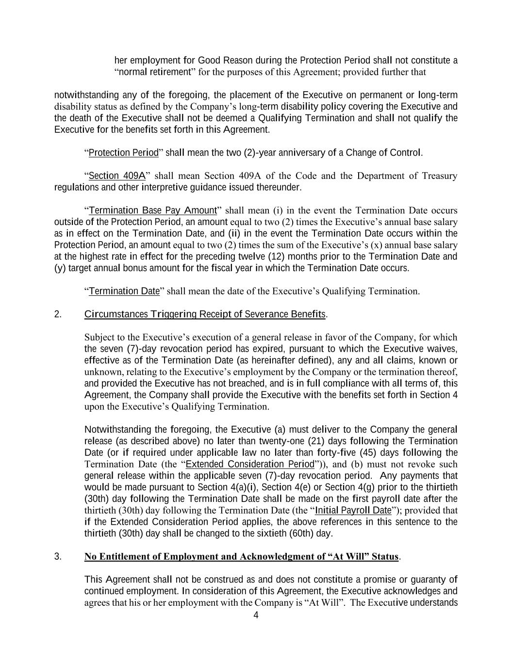 4 her employment for Good Reason during the Protection Period shall not constitute a “normal retirement” for the purposes of this Agreement; provided further that notwithstanding any of the foregoing, the placement of the Executive on permanent or long-term disability status as defined by the Company’s long-term disability policy covering the Executive and the death of the Executive shall not be deemed a Qualifying Termination and shall not qualify the Executive for the benefits set forth in this Agreement. “Protection Period” shall mean the two (2)-year anniversary of a Change of Control. “Section 409A” shall mean Section 409A of the Code and the Department of Treasury regulations and other interpretive guidance issued thereunder. “Termination Base Pay Amount” shall mean (i) in the event the Termination Date occurs outside of the Protection Period, an amount equal to two (2) times the Executive’s annual base salary as in effect on the Termination Date, and (ii) in the event the Termination Date occurs within the Protection Period, an amount equal to two (2) times the sum of the Executive’s (x) annual base salary at the highest rate in effect for the preceding twelve (12) months prior to the Termination Date and (y) target annual bonus amount for the fiscal year in which the Termination Date occurs. “Termination Date” shall mean the date of the Executive’s Qualifying Termination. 2. Circumstances Triggering Receipt of Severance Benefits. Subject to the Executive’s execution of a general release in favor of the Company, for which the seven (7)-day revocation period has expired, pursuant to which the Executive waives, effective as of the Termination Date (as hereinafter defined), any and all claims, known or unknown, relating to the Executive’s employment by the Company or the termination thereof, and provided the Executive has not breached, and is in full compliance with all terms of, this Agreement, the Company shall provide the Executive with the benefits set forth in Section 4 upon the Executive’s Qualifying Termination. Notwithstanding the foregoing, the Executive (a) must deliver to the Company the general release (as described above) no later than twenty-one (21) days following the Termination Date (or if required under applicable law no later than forty-five (45) days following the Termination Date (the “Extended Consideration Period”)), and (b) must not revoke such general release within the applicable seven (7)-day revocation period. Any payments that would be made pursuant to Section 4(a)(i), Section 4(e) or Section 4(g) prior to the thirtieth (30th) day following the Termination Date shall be made on the first payroll date after the thirtieth (30th) day following the Termination Date (the “Initial Payroll Date”); provided that if the Extended Consideration Period applies, the above references in this sentence to the thirtieth (30th) day shall be changed to the sixtieth (60th) day. 3. No Entitlement of Employment and Acknowledgment of “At Will” Status. This Agreement shall not be construed as and does not constitute a promise or guaranty of continued employment. In consideration of this Agreement, the Executive acknowledges and agrees that his or her employment with the Company is “At Will”. The Executive understands
