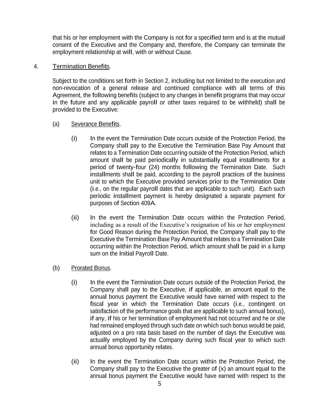 5 that his or her employment with the Company is not for a specified term and is at the mutual consent of the Executive and the Company and, therefore, the Company can terminate the employment relationship at will, with or without Cause. 4. Termination Benefits. Subject to the conditions set forth in Section 2, including but not limited to the execution and non-revocation of a general release and continued compliance with all terms of this Agreement, the following benefits (subject to any changes in benefit programs that may occur in the future and any applicable payroll or other taxes required to be withheld) shall be provided to the Executive: (a) Severance Benefits. (i) In the event the Termination Date occurs outside of the Protection Period, the Company shall pay to the Executive the Termination Base Pay Amount that relates to a Termination Date occurring outside of the Protection Period, which amount shall be paid periodically in substantially equal installments for a period of twenty-four (24) months following the Termination Date. Such installments shall be paid, according to the payroll practices of the business unit to which the Executive provided services prior to the Termination Date (i.e., on the regular payroll dates that are applicable to such unit). Each such periodic installment payment is hereby designated a separate payment for purposes of Section 409A. (ii) In the event the Termination Date occurs within the Protection Period, including as a result of the Executive’s resignation of his or her employment for Good Reason during the Protection Period, the Company shall pay to the Executive the Termination Base Pay Amount that relates to a Termination Date occurring within the Protection Period, which amount shall be paid in a lump sum on the Initial Payroll Date. (b) Prorated Bonus. (i) In the event the Termination Date occurs outside of the Protection Period, the Company shall pay to the Executive, if applicable, an amount equal to the annual bonus payment the Executive would have earned with respect to the fiscal year in which the Termination Date occurs (i.e., contingent on satisfaction of the performance goals that are applicable to such annual bonus), if any, if his or her termination of employment had not occurred and he or she had remained employed through such date on which such bonus would be paid, adjusted on a pro rata basis based on the number of days the Executive was actually employed by the Company during such fiscal year to which such annual bonus opportunity relates. (ii) In the event the Termination Date occurs within the Protection Period, the Company shall pay to the Executive the greater of (x) an amount equal to the annual bonus payment the Executive would have earned with respect to the