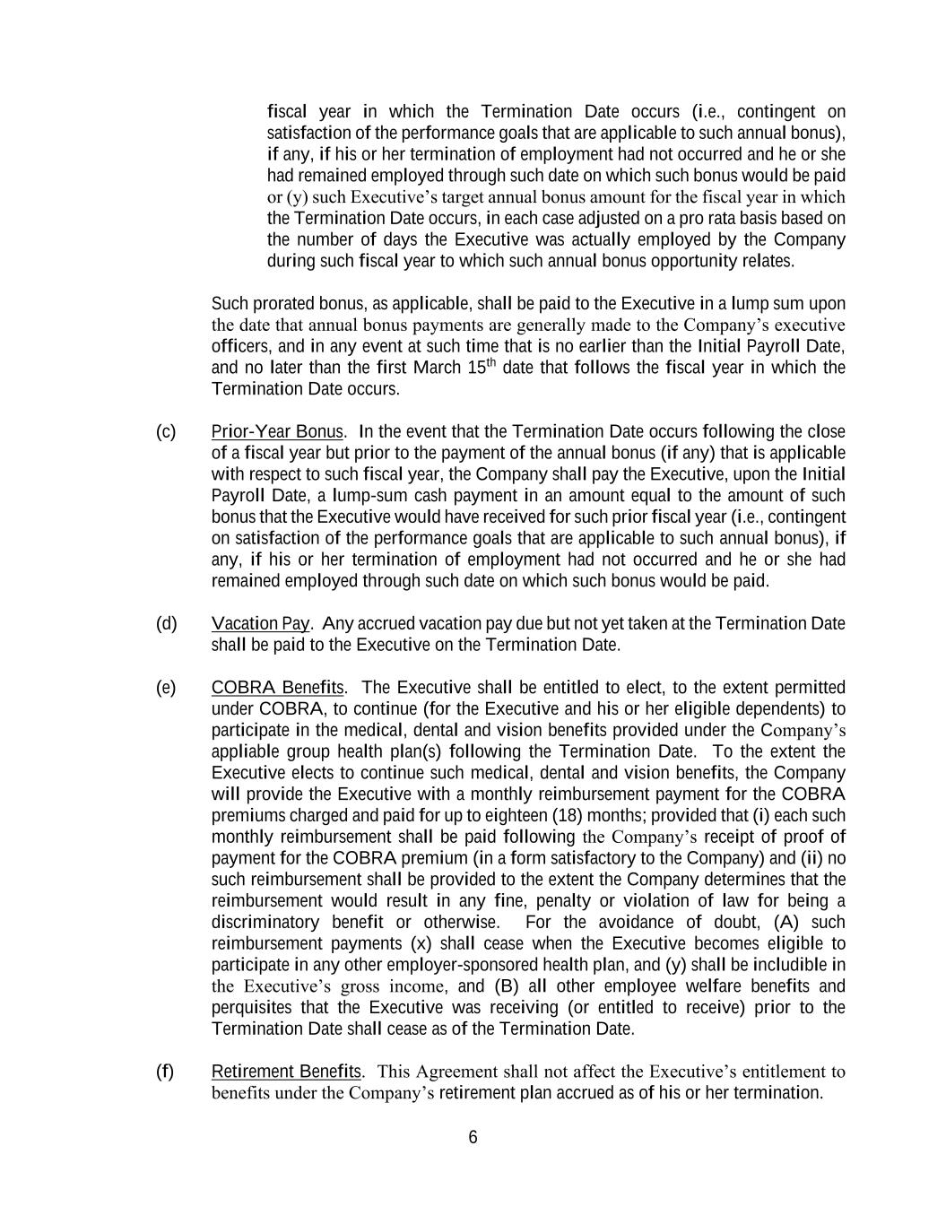 6 fiscal year in which the Termination Date occurs (i.e., contingent on satisfaction of the performance goals that are applicable to such annual bonus), if any, if his or her termination of employment had not occurred and he or she had remained employed through such date on which such bonus would be paid or (y) such Executive’s target annual bonus amount for the fiscal year in which the Termination Date occurs, in each case adjusted on a pro rata basis based on the number of days the Executive was actually employed by the Company during such fiscal year to which such annual bonus opportunity relates. Such prorated bonus, as applicable, shall be paid to the Executive in a lump sum upon the date that annual bonus payments are generally made to the Company’s executive officers, and in any event at such time that is no earlier than the Initial Payroll Date, and no later than the first March 15th date that follows the fiscal year in which the Termination Date occurs. (c) Prior-Year Bonus. In the event that the Termination Date occurs following the close of a fiscal year but prior to the payment of the annual bonus (if any) that is applicable with respect to such fiscal year, the Company shall pay the Executive, upon the Initial Payroll Date, a lump-sum cash payment in an amount equal to the amount of such bonus that the Executive would have received for such prior fiscal year (i.e., contingent on satisfaction of the performance goals that are applicable to such annual bonus), if any, if his or her termination of employment had not occurred and he or she had remained employed through such date on which such bonus would be paid. (d) Vacation Pay. Any accrued vacation pay due but not yet taken at the Termination Date shall be paid to the Executive on the Termination Date. (e) COBRA Benefits. The Executive shall be entitled to elect, to the extent permitted under COBRA, to continue (for the Executive and his or her eligible dependents) to participate in the medical, dental and vision benefits provided under the Company’s appliable group health plan(s) following the Termination Date. To the extent the Executive elects to continue such medical, dental and vision benefits, the Company will provide the Executive with a monthly reimbursement payment for the COBRA premiums charged and paid for up to eighteen (18) months; provided that (i) each such monthly reimbursement shall be paid following the Company’s receipt of proof of payment for the COBRA premium (in a form satisfactory to the Company) and (ii) no such reimbursement shall be provided to the extent the Company determines that the reimbursement would result in any fine, penalty or violation of law for being a discriminatory benefit or otherwise. For the avoidance of doubt, (A) such reimbursement payments (x) shall cease when the Executive becomes eligible to participate in any other employer-sponsored health plan, and (y) shall be includible in the Executive’s gross income, and (B) all other employee welfare benefits and perquisites that the Executive was receiving (or entitled to receive) prior to the Termination Date shall cease as of the Termination Date. (f) Retirement Benefits. This Agreement shall not affect the Executive’s entitlement to benefits under the Company’s retirement plan accrued as of his or her termination.