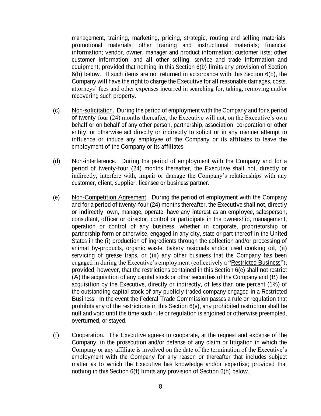 8 management, training, marketing, pricing, strategic, routing and selling materials; promotional materials; other training and instructional materials; financial information; vendor, owner, manager and product information; customer lists; other customer information; and all other selling, service and trade information and equipment; provided that nothing in this Section 6(b) limits any provision of Section 6(h) below. If such items are not returned in accordance with this Section 6(b), the Company will have the right to charge the Executive for all reasonable damages, costs, attorneys’ fees and other expenses incurred in searching for, taking, removing and/or recovering such property. (c) Non-solicitation. During the period of employment with the Company and for a period of twenty-four (24) months thereafter, the Executive will not, on the Executive’s own behalf or on behalf of any other person, partnership, association, corporation or other entity, or otherwise act directly or indirectly to solicit or in any manner attempt to influence or induce any employee of the Company or its affiliates to leave the employment of the Company or its affiliates. (d) Non-interference. During the period of employment with the Company and for a period of twenty-four (24) months thereafter, the Executive shall not, directly or indirectly, interfere with, impair or damage the Company’s relationships with any customer, client, supplier, licensee or business partner. (e) Non-Competition Agreement. During the period of employment with the Company and for a period of twenty-four (24) months thereafter, the Executive shall not, directly or indirectly, own, manage, operate, have any interest as an employee, salesperson, consultant, officer or director, control or participate in the ownership, management, operation or control of any business, whether in corporate, proprietorship or partnership form or otherwise, engaged in any city, state or part thereof in the United States in the (i) production of ingredients through the collection and/or processing of animal by-products, organic waste, bakery residuals and/or used cooking oil, (ii) servicing of grease traps, or (iii) any other business that the Company has been engaged in during the Executive’s employment (collectively a “Restricted Business”); provided, however, that the restrictions contained in this Section 6(e) shall not restrict (A) the acquisition of any capital stock or other securities of the Company and (B) the acquisition by the Executive, directly or indirectly, of less than one percent (1%) of the outstanding capital stock of any publicly traded company engaged in a Restricted Business. In the event the Federal Trade Commission passes a rule or regulation that prohibits any of the restrictions in this Section 6(e), any prohibited restriction shall be null and void until the time such rule or regulation is enjoined or otherwise preempted, overturned, or stayed. (f) Cooperation. The Executive agrees to cooperate, at the request and expense of the Company, in the prosecution and/or defense of any claim or litigation in which the Company or any affiliate is involved on the date of the termination of the Executive’s employment with the Company for any reason or thereafter that includes subject matter as to which the Executive has knowledge and/or expertise; provided that nothing in this Section 6(f) limits any provision of Section 6(h) below.