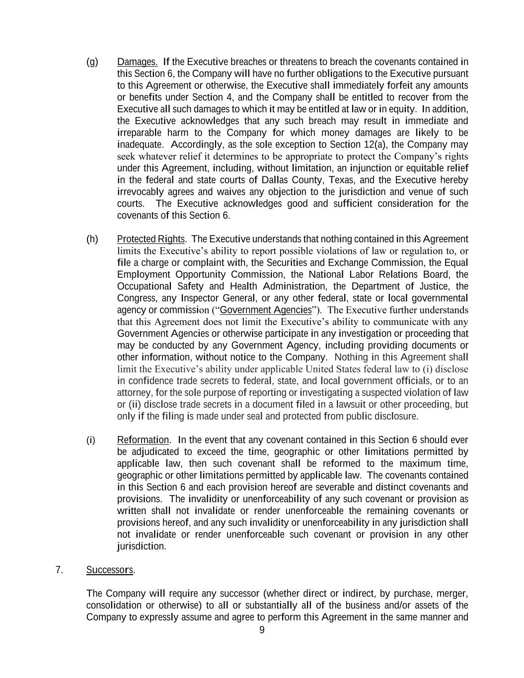 9 (g) Damages. If the Executive breaches or threatens to breach the covenants contained in this Section 6, the Company will have no further obligations to the Executive pursuant to this Agreement or otherwise, the Executive shall immediately forfeit any amounts or benefits under Section 4, and the Company shall be entitled to recover from the Executive all such damages to which it may be entitled at law or in equity. In addition, the Executive acknowledges that any such breach may result in immediate and irreparable harm to the Company for which money damages are likely to be inadequate. Accordingly, as the sole exception to Section 12(a), the Company may seek whatever relief it determines to be appropriate to protect the Company’s rights under this Agreement, including, without limitation, an injunction or equitable relief in the federal and state courts of Dallas County, Texas, and the Executive hereby irrevocably agrees and waives any objection to the jurisdiction and venue of such courts. The Executive acknowledges good and sufficient consideration for the covenants of this Section 6. (h) Protected Rights. The Executive understands that nothing contained in this Agreement limits the Executive’s ability to report possible violations of law or regulation to, or file a charge or complaint with, the Securities and Exchange Commission, the Equal Employment Opportunity Commission, the National Labor Relations Board, the Occupational Safety and Health Administration, the Department of Justice, the Congress, any Inspector General, or any other federal, state or local governmental agency or commission (“Government Agencies”). The Executive further understands that this Agreement does not limit the Executive’s ability to communicate with any Government Agencies or otherwise participate in any investigation or proceeding that may be conducted by any Government Agency, including providing documents or other information, without notice to the Company. Nothing in this Agreement shall limit the Executive’s ability under applicable United States federal law to (i) disclose in confidence trade secrets to federal, state, and local government officials, or to an attorney, for the sole purpose of reporting or investigating a suspected violation of law or (ii) disclose trade secrets in a document filed in a lawsuit or other proceeding, but only if the filing is made under seal and protected from public disclosure. (i) Reformation. In the event that any covenant contained in this Section 6 should ever be adjudicated to exceed the time, geographic or other limitations permitted by applicable law, then such covenant shall be reformed to the maximum time, geographic or other limitations permitted by applicable law. The covenants contained in this Section 6 and each provision hereof are severable and distinct covenants and provisions. The invalidity or unenforceability of any such covenant or provision as written shall not invalidate or render unenforceable the remaining covenants or provisions hereof, and any such invalidity or unenforceability in any jurisdiction shall not invalidate or render unenforceable such covenant or provision in any other jurisdiction. 7. Successors. The Company will require any successor (whether direct or indirect, by purchase, merger, consolidation or otherwise) to all or substantially all of the business and/or assets of the Company to expressly assume and agree to perform this Agreement in the same manner and