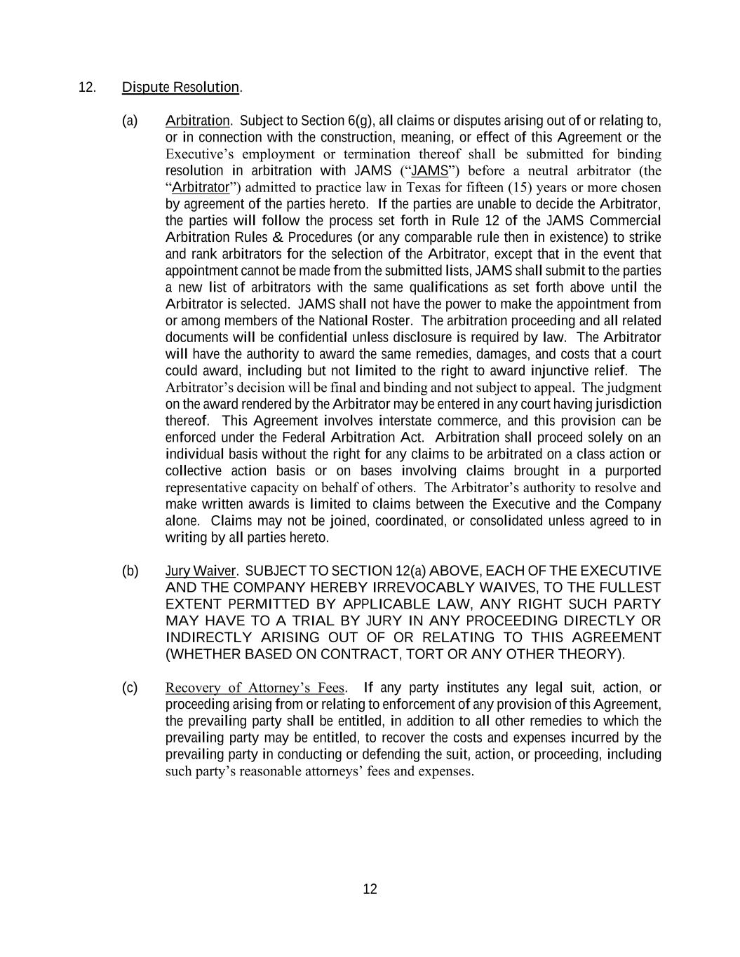 12 12. Dispute Resolution. (a) Arbitration. Subject to Section 6(g), all claims or disputes arising out of or relating to, or in connection with the construction, meaning, or effect of this Agreement or the Executive’s employment or termination thereof shall be submitted for binding resolution in arbitration with JAMS (“JAMS”) before a neutral arbitrator (the “Arbitrator”) admitted to practice law in Texas for fifteen (15) years or more chosen by agreement of the parties hereto. If the parties are unable to decide the Arbitrator, the parties will follow the process set forth in Rule 12 of the JAMS Commercial Arbitration Rules & Procedures (or any comparable rule then in existence) to strike and rank arbitrators for the selection of the Arbitrator, except that in the event that appointment cannot be made from the submitted lists, JAMS shall submit to the parties a new list of arbitrators with the same qualifications as set forth above until the Arbitrator is selected. JAMS shall not have the power to make the appointment from or among members of the National Roster. The arbitration proceeding and all related documents will be confidential unless disclosure is required by law. The Arbitrator will have the authority to award the same remedies, damages, and costs that a court could award, including but not limited to the right to award injunctive relief. The Arbitrator’s decision will be final and binding and not subject to appeal. The judgment on the award rendered by the Arbitrator may be entered in any court having jurisdiction thereof. This Agreement involves interstate commerce, and this provision can be enforced under the Federal Arbitration Act. Arbitration shall proceed solely on an individual basis without the right for any claims to be arbitrated on a class action or collective action basis or on bases involving claims brought in a purported representative capacity on behalf of others. The Arbitrator’s authority to resolve and make written awards is limited to claims between the Executive and the Company alone. Claims may not be joined, coordinated, or consolidated unless agreed to in writing by all parties hereto. (b) Jury Waiver. SUBJECT TO SECTION 12(a) ABOVE, EACH OF THE EXECUTIVE AND THE COMPANY HEREBY IRREVOCABLY WAIVES, TO THE FULLEST EXTENT PERMITTED BY APPLICABLE LAW, ANY RIGHT SUCH PARTY MAY HAVE TO A TRIAL BY JURY IN ANY PROCEEDING DIRECTLY OR INDIRECTLY ARISING OUT OF OR RELATING TO THIS AGREEMENT (WHETHER BASED ON CONTRACT, TORT OR ANY OTHER THEORY). (c) Recovery of Attorney’s Fees. If any party institutes any legal suit, action, or proceeding arising from or relating to enforcement of any provision of this Agreement, the prevailing party shall be entitled, in addition to all other remedies to which the prevailing party may be entitled, to recover the costs and expenses incurred by the prevailing party in conducting or defending the suit, action, or proceeding, including such party’s reasonable attorneys’ fees and expenses.