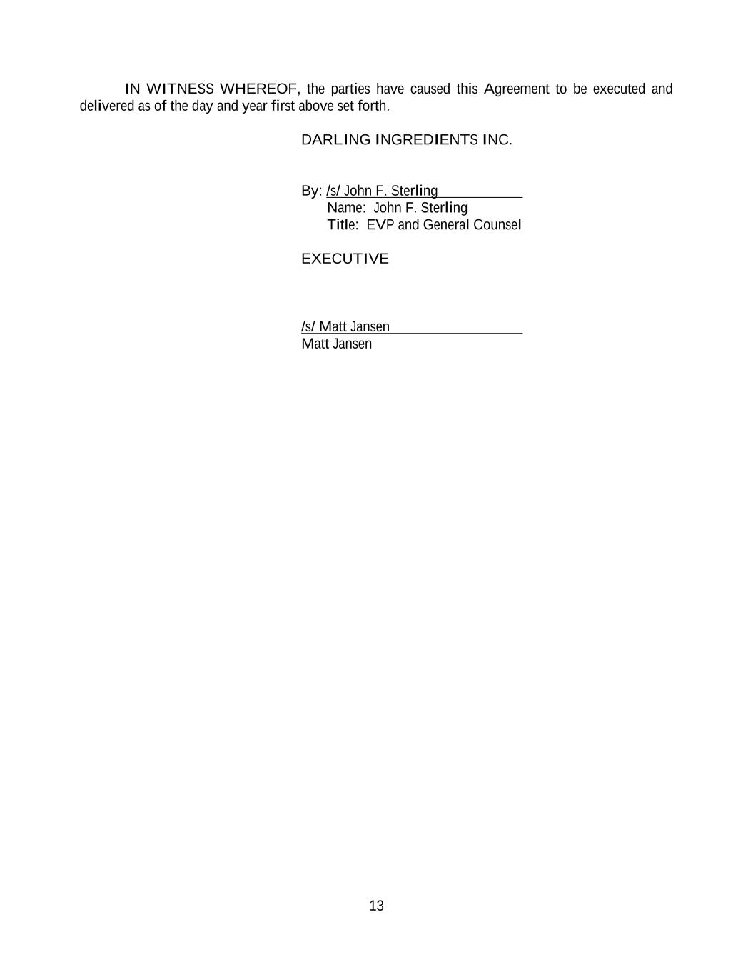 13 IN WITNESS WHEREOF, the parties have caused this Agreement to be executed and delivered as of the day and year first above set forth. DARLING INGREDIENTS INC. By: /s/ John F. Sterling Name: John F. Sterling Title: EVP and General Counsel EXECUTIVE /s/ Matt Jansen Matt Jansen