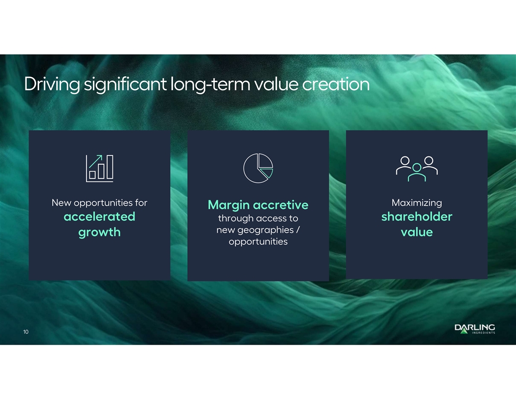 Key transaction terms Financial structure Closing Finalizing agreement terms, with transaction Darling Ingredients will hold a majority 85% ownership expected to close in 2026 stake and Tessenderlo Group the remaining 15% Non-cash transaction, combining assets and The term sheet has been unanimously approved capabilities by the board of directors of both companies Consolidated on the Darling Ingredients Subject to regulatory approvals and other financial statements customary closing considerations 9