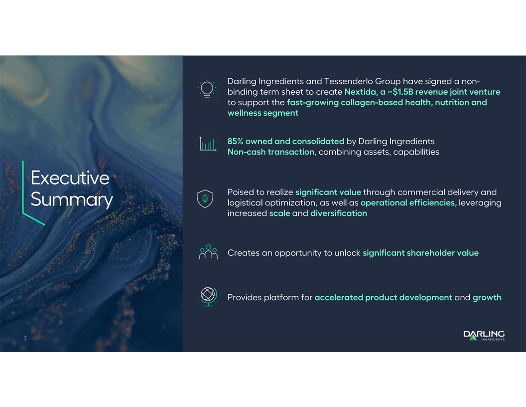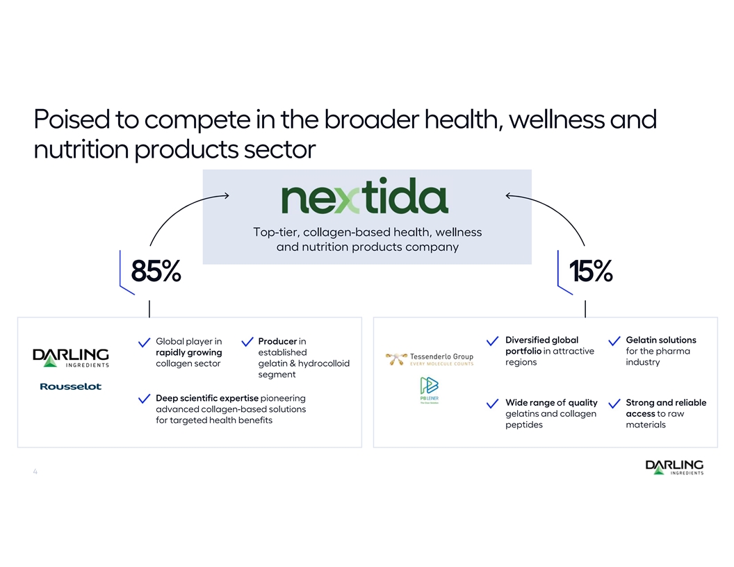 Darling Ingredients and Tessenderlo Group have signed a non- binding term sheet to create Nextida, a ~$1.5B revenue joint venture to support the fast-growing collagen-based health, nutrition and wellness segment 85% owned and consolidated by Darling Ingredients Non-cash transaction, combining assets, capabilities Executive Poised to realize significant value through commercial delivery and Summary logistical optimization, as well as operational efficiencies, leveraging increased scale and diversification Creates an opportunity to unlock significant shareholder value Provides platform for accelerated product development and growth 3