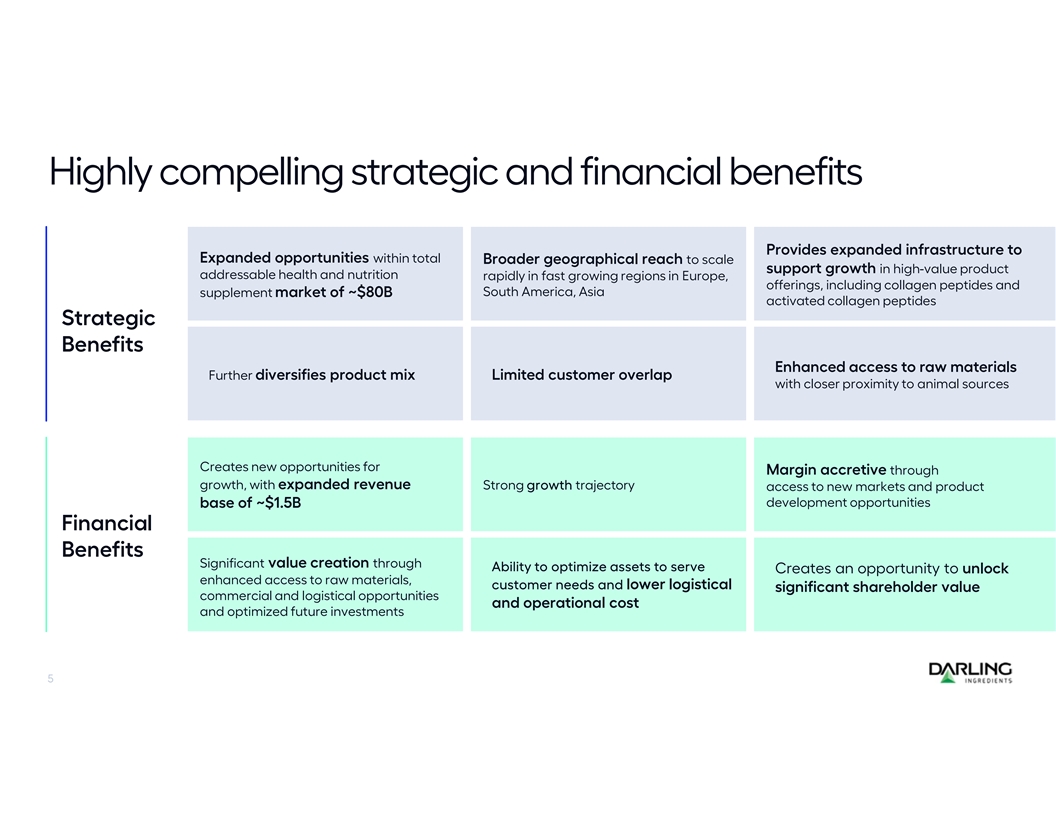 Poised to compete in the broader health, wellness and nutrition products sector Top-tier, collagen-based health, wellness and nutrition products company 85% 15% Diversified global Gelatin solutions Global player in Producer in portfolio in attractive for the pharma rapidly growing established regions industry collagen sector gelatin & hydrocolloid segment Deep scientific expertise pioneering Wide range of quality Strong and reliable advanced collagen-based solutions gelatins and collagen access to raw for targeted health benefits peptides materials 4