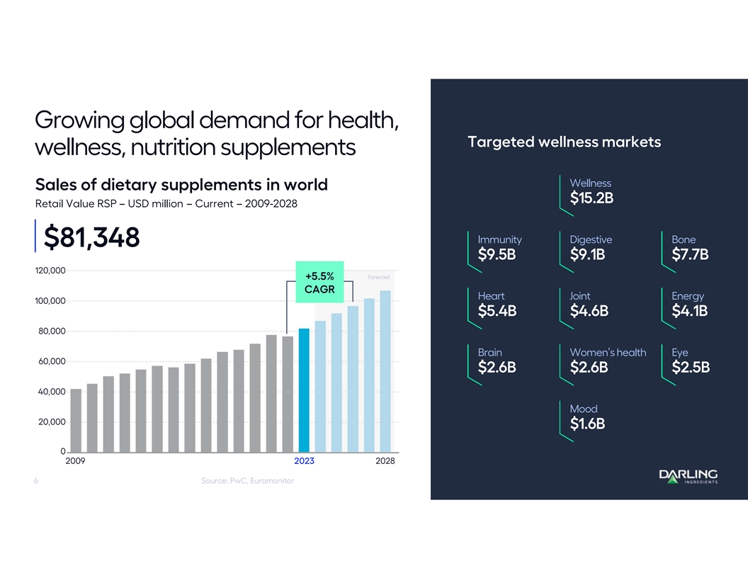 Highly compelling strategic and financial benefits Provides expanded infrastructure to Expanded opportunities within total Broader geographical reach to scale support growth in high-value product addressable health and nutrition rapidly in fast growing regions in Europe, offerings, including collagen peptides and South America, Asia supplement market of ~$80B activated collagen peptides Strategic Benefits Enhanced access to raw materials Further diversifies product mix Limited customer overlap with closer proximity to animal sources Creates new opportunities for Margin accretive through growth, with expanded revenue Strong growth trajectory access to new markets and product development opportunities base of ~$1.5B Financial Benefits Significant value creation through Ability to optimize assets to serve Creates an opportunity to unlock enhanced access to raw materials, customer needs and lower logistical significant shareholder value commercial and logistical opportunities and operational cost and optimized future investments 5
