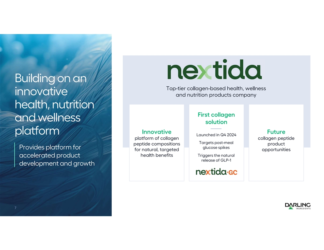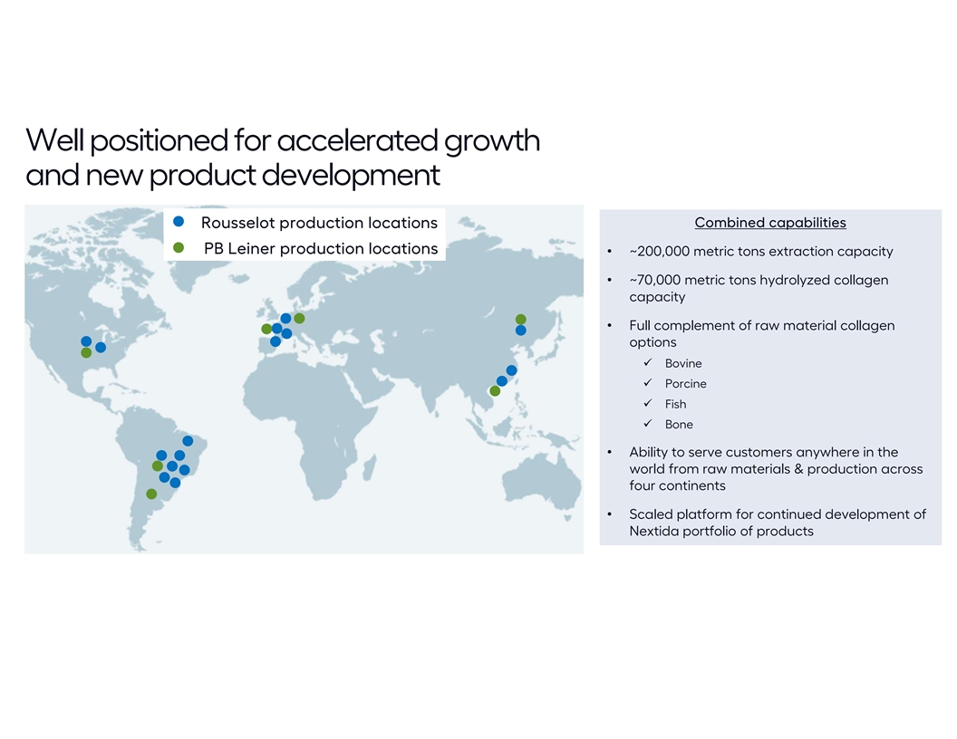 Well positioned for accelerated growth and new product development Combined capabilities Rousselot production locations PB Leiner production locations • ~200,000 metric tons extraction capacity • ~70,000 metric tons hydrolyzed collagen capacity • Full complement of raw material collagen options ü Bovine ü Porcine ü Fish ü Bone • Ability to serve customers anywhere in the world from raw materials & production across four continents • Scaled platform for continued development of Nextida portfolio of products