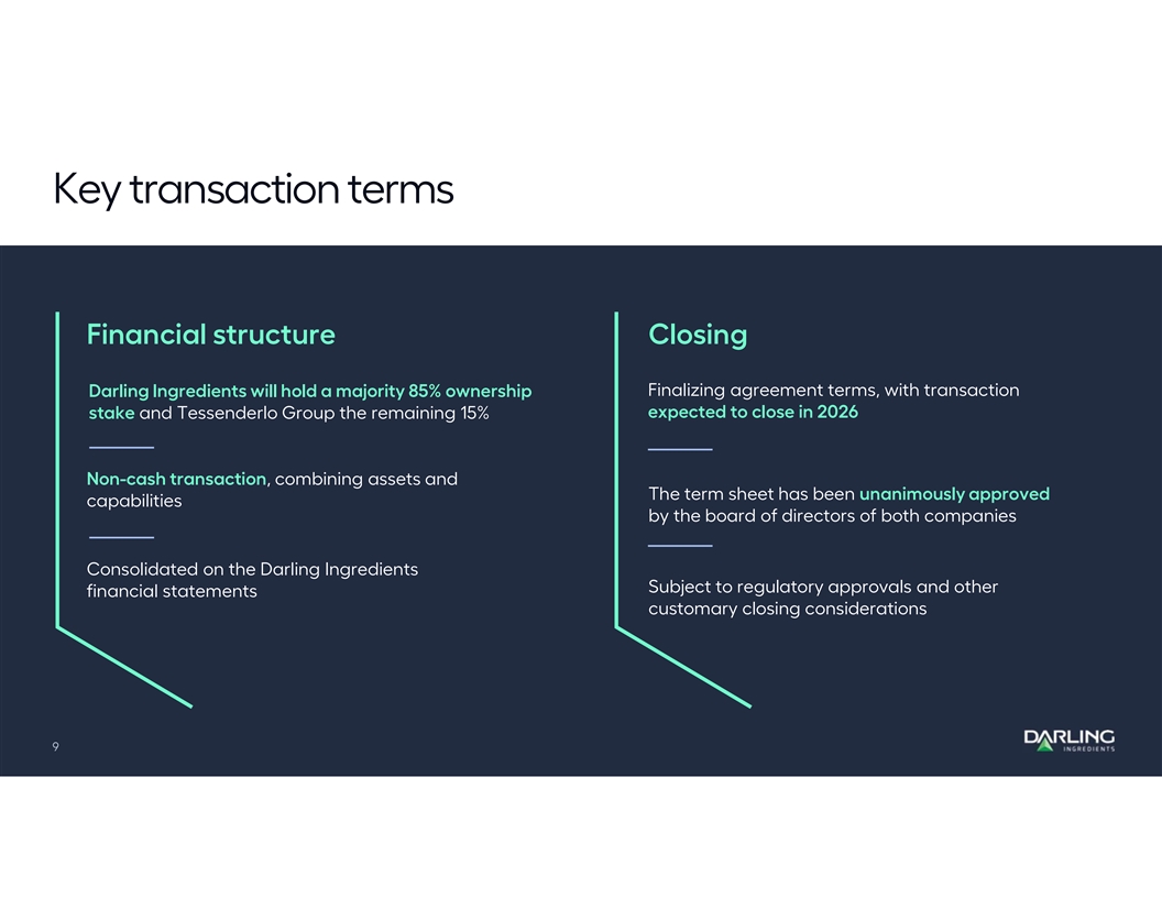 This presentation includes “forward-looking” statements that are subject to risks and uncertainties that could cause actual results to differ materially from those expressed or implied in the statements. Statements that are not statements of historical facts are forward-looking statements and are made pursuant to the safe harbor provisions of the Private SecuritiesLitigation Reform Act of 1995. Words such as “estimate,” “guidance,” “outlook,” “project,” “planned,” “contemplate,” “potential,” “possible,” “proposed,” “intend,” “believe,” “anticipate,” “expect,” “may,” “will,” “would,” “should,” “could,” and similar expressions are intended to identify forward-looking statements. All statements other than statements of historical facts included in this presentation are forward-looking statements. Forward-looking statements are based on the Company's current expectations and assumptions regarding its business, the economy and other future conditions. The Company cautions readers that any such forward-looking statements it makes are not guarantees of future performance and that actual results may differ materially from anticipated results or expectations expressed in its forward-looking statements as a result of a variety of factors, including many that are beyond the Company's control. Important factors that could cause actual results to differ materially from the Company’s expectations include: factors which could preclude the Company from closing the proposed transaction or realizing the anticipated benefits of the proposed transaction; existing and unknown future limitations on the ability of the Company's direct and indirect subsidiaries to make their cash flow available to the Company for payments on the Company's indebtedness or other purposes; reduced demands or prices for biofuels, biogases or renewable electricity; global demands for grain and oilseed commodities, which have exhibited volatility, and can impact the cost of feed for cattle, hogs and poultry, thus affecting available rendering feedstock and selling prices for the Company’s products; reductions in raw material volumes available to the Company due to weak margins in the meat production industry as a result of higher feed costs, reduced consumer demand, reduced volume due to government regulations affecting animal production or other factors, reduced volume from food service establishments, or otherwise; reduced demand for animal feed; reduced finished product prices, including a decline in fat, used cooking oil, protein or collagen (including, without limitation, collagen peptides and gelatin) finished product prices; changes to government policies around the world relating to renewable fuels and greenhouse gas (“GHG”) emissions that adversely affect prices, margins or markets (including for the DGD Joint Venture), including programs like renewable fuel standards, low carbon fuel standards (“LCFS”), renewable fuel mandates and tax credits for biofuels, or loss or diminishment of tax credits due to failure to satisfy any eligibility requirements, including, without limitation, in relation to the blender tax credit or the Clean Fuels Production Credit (“CFPC”); climate related adverse results, including with respect to the Company’s climate goals, targets or commitments;possible product recall resulting from developments relating to the discovery of unauthorized adulterations to food or food additives or products which do not meet specifications, contract requirements or regulatory standards; the occurrence of 2009 H1N1 flu (initially known as “Swine Flu”), highly pathogenic strains of avian influenza (collectively known as “Bird Flu”), severe acute respiratory syndrome (“SARS”), bovine spongiform encephalopathy (or “BSE”), porcine epidemic diarrhea (“PED”) or other diseases associated with animal origin in the U.S. or elsewhere, such as the outbreak of African Swine Fever in China and elsewhere; the occurrence of pandemics, epidemics or disease outbreaks, such as theCOVID-19 outbreak; unanticipated costs and/or reductions in raw material volumes related to the Company’s compliance with the existing or unforeseen new U.S. or foreign (including, without limitation, China) regulations (including new or modified animal feed, Bird Flu, SARS, PED, BSE or ASF or similar or unanticipated regulations) affecting the industries in which the Company operates or its value added products; risks associated with the DGD Joint Venture,including possible unanticipated operating disruptions, a decline in margins on the products produced by the DGD Joint Venture and issues relating to the announced SAF upgrade project (including, without limitation, operational, mechanical, product quality, market based or other such issues); risks and uncertainties relating to international sales and operations, including imposition of tariffs, quotas, trade barriers and other trade protections by foreign countries; tax changes, such as global minimum tax measures, or issues related to administration, guidance and/or regulations associated with biofuel policies, including CFPC, and risks associated with the qualification and sale of such credits; difficulties or a significant disruption (including, without limitation, due to cyber-attack) in the Company’s information systems, networks or the confidentiality, availability or integrity of our data or failure to implement new systems and software successfully; risks relating to possible third-party claims of intellectual property infringement; increased contributions to the Company’s pension and benefit plans, including multiemployer and employer-sponsored defined benefit pension plans as required by legislation, regulation or other applicable U.S. or foreign law or resulting from a U.S. mass withdrawal event; bad debt write-offs; loss of or failure to obtain necessary permits and registrati