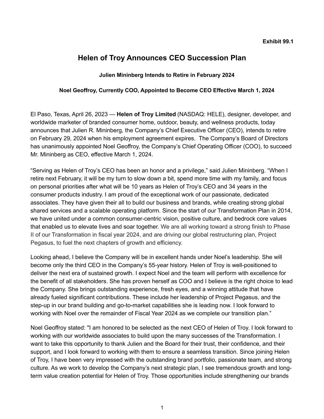 1 Exhibit 99.1 Helen of Troy Announces CEO Succession Plan Julien Mininberg Intends to Retire in February 2024 Noel Geoffroy, Currently COO, Appointed to Become CEO Effective March 1, 2024 El Paso, Texas, April 26, 2023 — Helen of Troy Limited (NASDAQ: HELE), designer, developer, and worldwide marketer of branded consumer home, outdoor, beauty, and wellness products, today announces that Julien R. Mininberg, the Company’s Chief Executive Officer (CEO), intends to retire on February 29, 2024 when his employment agreement expires. The Company’s Board of Directors has unanimously appointed Noel Geoffroy, the Company’s Chief Operating Officer (COO), to succeed Mr. Mininberg as CEO, effective March 1, 2024. “Serving as Helen of Troy’s CEO has been an honor and a privilege,” said Julien Mininberg. “When I retire next February, it will be my turn to slow down a bit, spend more time with my family, and focus on personal priorities after what will be 10 years as Helen of Troy’s CEO and 34 years in the consumer products industry. I am proud of the exceptional work of our passionate, dedicated associates. They have given their all to build our business and brands, while creating strong global shared services and a scalable operating platform. Since the start of our Transformation Plan in 2014, we have united under a common consumer-centric vision, positive culture, and bedrock core values that enabled us to elevate lives and soar together. We are all working toward a strong finish to Phase II of our Transformation in fiscal year 2024, and are driving our global restructuring plan, Project Pegasus, to fuel the next chapters of growth and efficiency. Looking ahead, I believe the Company will be in excellent hands under Noel’s leadership. She will become only the third CEO in the Company’s 55-year history. Helen of Troy is well-positioned to deliver the next era of sustained growth. I expect Noel and the team will perform with excellence for the benefit of all stakeholders. She has proven herself as COO and I believe is the right choice to lead the Company. She brings outstanding experience, fresh eyes, and a winning attitude that have already fueled significant contributions. These include her leadership of Project Pegasus, and the step-up in our brand building and go-to-market capabilities she is leading now. I look forward to working with Noel over the remainder of Fiscal Year 2024 as we complete our transition plan.” Noel Geoffroy stated: "I am honored to be selected as the next CEO of Helen of Troy. I look forward to working with our worldwide associates to build upon the many successes of the Transformation. I want to take this opportunity to thank Julien and the Board for their trust, their confidence, and their support, and I look forward to working with them to ensure a seamless transition. Since joining Helen of Troy, I have been very impressed with the outstanding brand portfolio, passionate team, and strong culture. As we work to develop the Company’s next strategic plan, I see tremendous growth and long- term value creation potential for Helen of Troy. Those opportunities include strengthening our brands