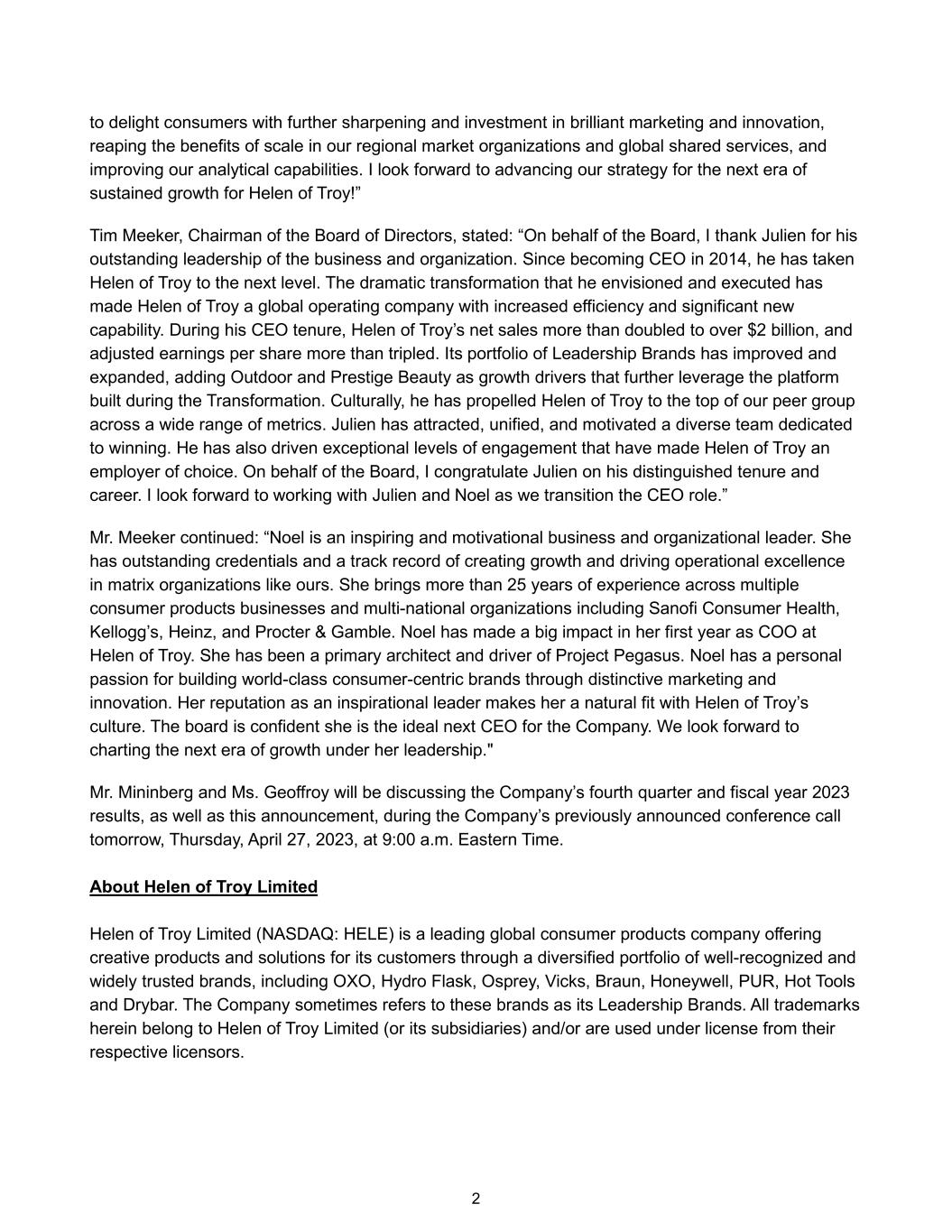 2 to delight consumers with further sharpening and investment in brilliant marketing and innovation, reaping the benefits of scale in our regional market organizations and global shared services, and improving our analytical capabilities. I look forward to advancing our strategy for the next era of sustained growth for Helen of Troy!” Tim Meeker, Chairman of the Board of Directors, stated: “On behalf of the Board, I thank Julien for his outstanding leadership of the business and organization. Since becoming CEO in 2014, he has taken Helen of Troy to the next level. The dramatic transformation that he envisioned and executed has made Helen of Troy a global operating company with increased efficiency and significant new capability. During his CEO tenure, Helen of Troy’s net sales more than doubled to over $2 billion, and adjusted earnings per share more than tripled. Its portfolio of Leadership Brands has improved and expanded, adding Outdoor and Prestige Beauty as growth drivers that further leverage the platform built during the Transformation. Culturally, he has propelled Helen of Troy to the top of our peer group across a wide range of metrics. Julien has attracted, unified, and motivated a diverse team dedicated to winning. He has also driven exceptional levels of engagement that have made Helen of Troy an employer of choice. On behalf of the Board, I congratulate Julien on his distinguished tenure and career. I look forward to working with Julien and Noel as we transition the CEO role.” Mr. Meeker continued: “Noel is an inspiring and motivational business and organizational leader. She has outstanding credentials and a track record of creating growth and driving operational excellence in matrix organizations like ours. She brings more than 25 years of experience across multiple consumer products businesses and multi-national organizations including Sanofi Consumer Health, Kellogg’s, Heinz, and Procter & Gamble. Noel has made a big impact in her first year as COO at Helen of Troy. She has been a primary architect and driver of Project Pegasus. Noel has a personal passion for building world-class consumer-centric brands through distinctive marketing and innovation. Her reputation as an inspirational leader makes her a natural fit with Helen of Troy’s culture. The board is confident she is the ideal next CEO for the Company. We look forward to charting the next era of growth under her leadership." Mr. Mininberg and Ms. Geoffroy will be discussing the Company’s fourth quarter and fiscal year 2023 results, as well as this announcement, during the Company’s previously announced conference call tomorrow, Thursday, April 27, 2023, at 9:00 a.m. Eastern Time. About Helen of Troy Limited Helen of Troy Limited (NASDAQ: HELE) is a leading global consumer products company offering creative products and solutions for its customers through a diversified portfolio of well-recognized and widely trusted brands, including OXO, Hydro Flask, Osprey, Vicks, Braun, Honeywell, PUR, Hot Tools and Drybar. The Company sometimes refers to these brands as its Leadership Brands. All trademarks herein belong to Helen of Troy Limited (or its subsidiaries) and/or are used under license from their respective licensors.