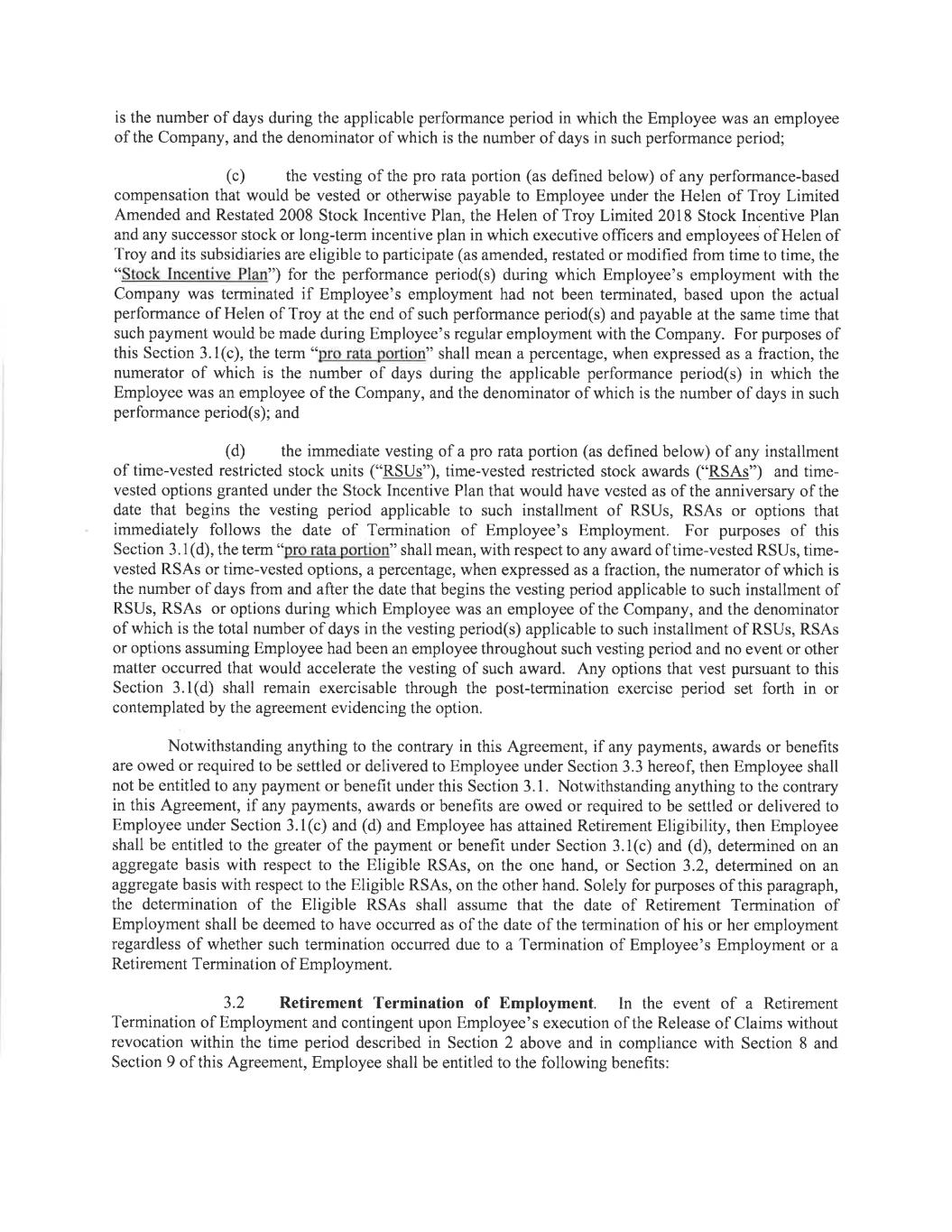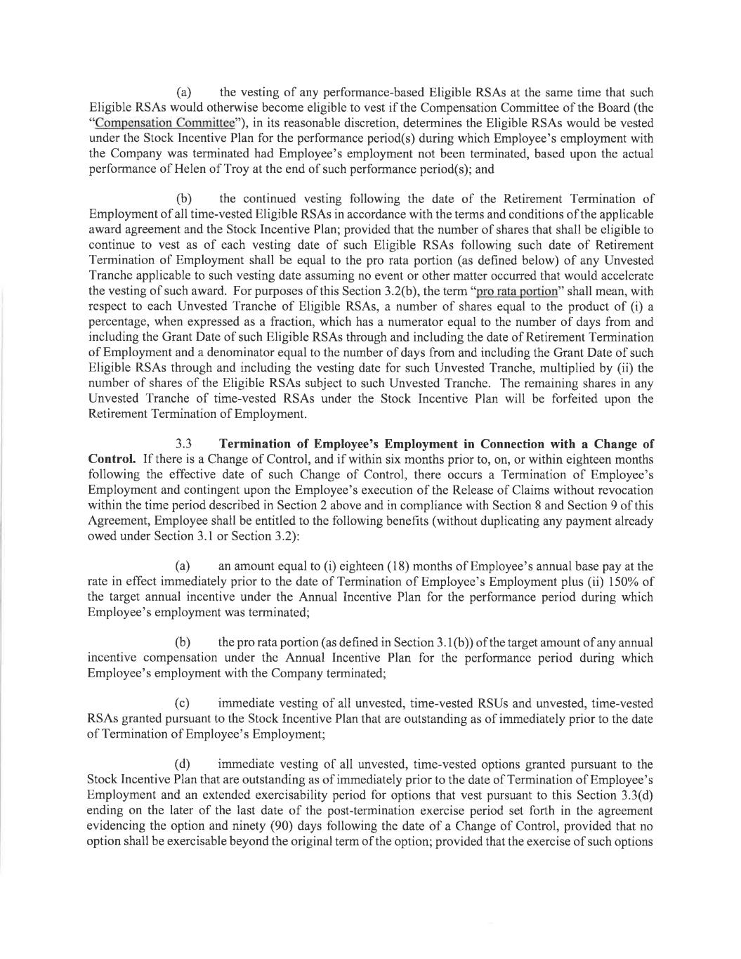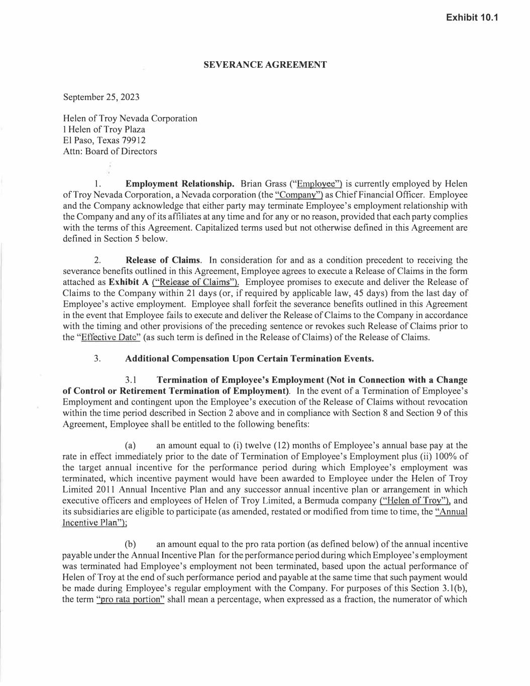 September 25, 2023 Helen of Troy Nevada Corporation 1 Helen of Troy Plaza El Paso, Texas 79912 Attn: Board of Directors SEVERANCE AGREEMENT 1. Employment Relationship. Brian Grass (" ·mployee") is currently employed by Helen of Troy Nevada Corporation, a Nevada corporation (the "Company") as Chief Financial Officer. Employee and the Company acknowledge that either party may terminate Employee's employment relationship with the Company and any of its affiliates at any time and for any or no reason, provided that each party complies with the terms of this Agreement. Capitalized terms used but not otherwise defined in this Agreement are defined in Section 5 below. 2. Release of Claims. In consideration for and as a condition precedent to receiving the severance benefits outlined in this Agreement, Employee agrees to execute a Release of Claims in the form attached as Exhibit A ("Release of !aims"). Employee promises to execute and deliver the Release of Claims to the Company within 21 days (or, if required by applicable law, 45 days) from the last day of Employee's active employment. Employee shall forfeit the severance benefits outlined in this Agreement in the event that Employee fails to execute and deliver the Release of Claims to the Company in accordance with the timing and other provisions of the preceding sentence or revokes such Release of Claims prior to the " ffecti ve Date" ( as such term is defined in the Release of Claims) of the Release of Claims. 3. Additional Compensation Upon Certain Termination Events. 3.1 Termination of Employee's Employment (Not in Connection with a Change of Control or Retirement Termination of Employment). In the event of a Termination of Employee's Employment and contingent upon the Employee's execution of the Release of Claims without revocation within the time period described in Section 2 above and in compliance with Section 8 and Section 9 of this Agreement, Employee shall be entitled to the following benefits: (a) an amount equal to (i) twelve (12) months of Employee's annual base pay at the rate in effect immediately prior to the date of Termination of Employee's Employment plus (ii) 100% of the target annual incentive for the performance period during which Employee's employment was terminated, which incentive payment would have been awarded to Employee under the Helen of Troy Limited 2011 Annual Incentive Plan and any successor annual incentive plan or arrangement in which executive officers and employees of Helen of Troy Limited, a Bermuda company ("Helen of Troy"), and its subsidiaries are eligible to participate (as amended, restated or modified from time to time, the "Annual I ocentive Plan"); (b) an amount equal to the pro rata portion (as defined below) of the annual incentive payable under the Annual Incentive Plan for the performance period during which Employee's employment was terminated had Employee's employment not been terminated, based upon the actual performance of Helen of Troy at the end of such performance period and payable at the same time that such payment would be made during Employee's regular employment with the Company. For purposes of this Section 3.l(b), the term "pro rata portion" shall mean a percentage, when expressed as a fraction, the numerator of which Exhibit 10.1