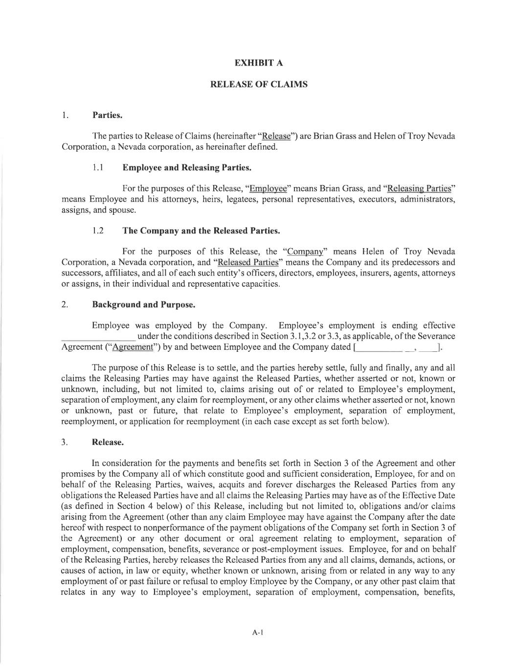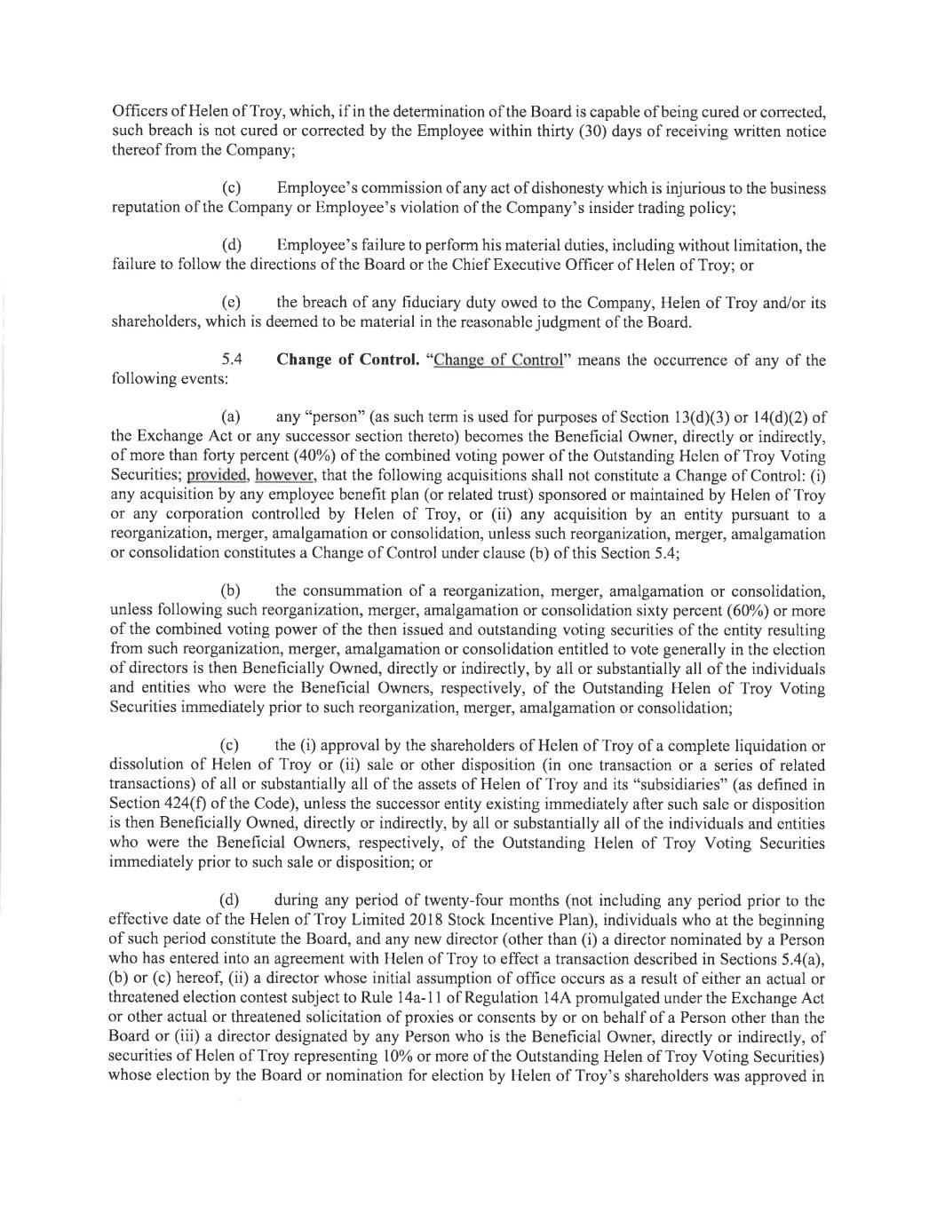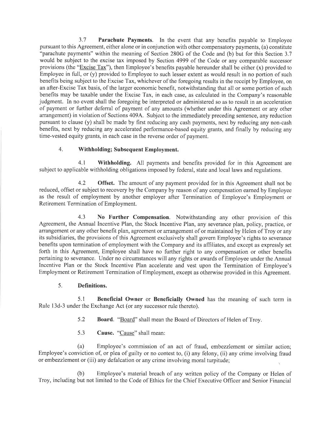 September 25, 2023 Helen of Troy Nevada Corporation 1 Helen of Troy Plaza El Paso, Texas 79912 Attn: Board of Directors SEVERANCE AGREEMENT 1. Employment Relationship. Brian Grass (" ·mployee") is currently employed by Helen of Troy Nevada Corporation, a Nevada corporation (the "Company") as Chief Financial Officer. Employee and the Company acknowledge that either party may terminate Employee's employment relationship with the Company and any of its affiliates at any time and for any or no reason, provided that each party complies with the terms of this Agreement. Capitalized terms used but not otherwise defined in this Agreement are defined in Section 5 below. 2. Release of Claims. In consideration for and as a condition precedent to receiving the severance benefits outlined in this Agreement, Employee agrees to execute a Release of Claims in the form attached as Exhibit A ("Release of !aims"). Employee promises to execute and deliver the Release of Claims to the Company within 21 days (or, if required by applicable law, 45 days) from the last day of Employee's active employment. Employee shall forfeit the severance benefits outlined in this Agreement in the event that Employee fails to execute and deliver the Release of Claims to the Company in accordance with the timing and other provisions of the preceding sentence or revokes such Release of Claims prior to the " ffecti ve Date" ( as such term is defined in the Release of Claims) of the Release of Claims. 3. Additional Compensation Upon Certain Termination Events. 3.1 Termination of Employee's Employment (Not in Connection with a Change of Control or Retirement Termination of Employment). In the event of a Termination of Employee's Employment and contingent upon the Employee's execution of the Release of Claims without revocation within the time period described in Section 2 above and in compliance with Section 8 and Section 9 of this Agreement, Employee shall be entitled to the following benefits: (a) an amount equal to (i) twelve (12) months of Employee's annual base pay at the rate in effect immediately prior to the date of Termination of Employee's Employment plus (ii) 100% of the target annual incentive for the performance period during which Employee's employment was terminated, which incentive payment would have been awarded to Employee under the Helen of Troy Limited 2011 Annual Incentive Plan and any successor annual incentive plan or arrangement in which executive officers and employees of Helen of Troy Limited, a Bermuda company ("Helen of Troy"), and its subsidiaries are eligible to participate (as amended, restated or modified from time to time, the "Annual I ocentive Plan"); (b) an amount equal to the pro rata portion (as defined below) of the annual incentive payable under the Annual Incentive Plan for the performance period during which Employee's employment was terminated had Employee's employment not been terminated, based upon the actual performance of Helen of Troy at the end of such performance period and payable at the same time that such payment would be made during Employee's regular employment with the Company. For purposes of this Section 3.l(b), the term "pro rata portion" shall mean a percentage, when expressed as a fraction, the numerator of which Exhibit 10.1