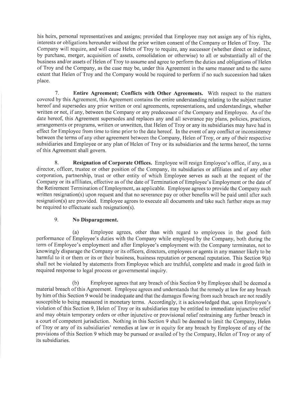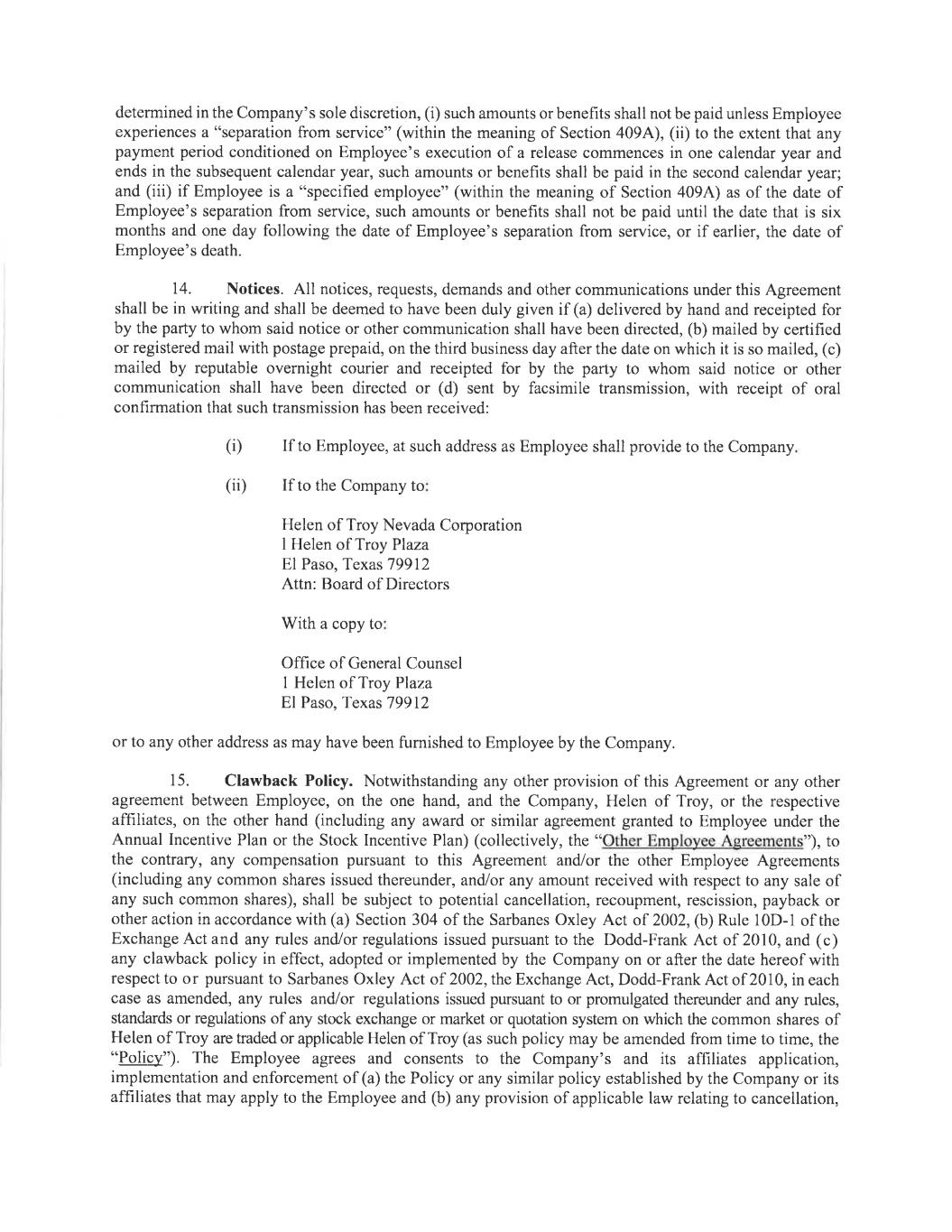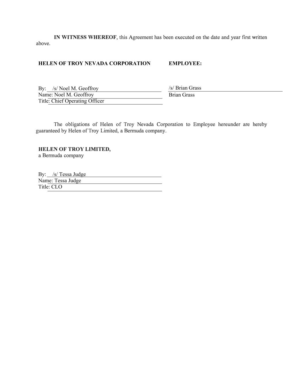 IN WITNESS WHEREOF, this Agreement has been executed on the date and year first written above. The obligations of Helen of Troy Nevada Corporation to Employee hereunder are hereby guaranteed by Helen of Troy Limited, a Bermuda company. HELEN OF TROY NEVADA CORPORATION By: /s/ Noel M. Geoffroy Name: Noel M. Geoffroy Title: Chief Operating Officer EMPLOYEE: /s/ Brian Grass Brian Grass HELEN OF TROY LIMITED, a Bermuda company By: /s/ Tessa Judge Name: Tessa Judge Title: CLO