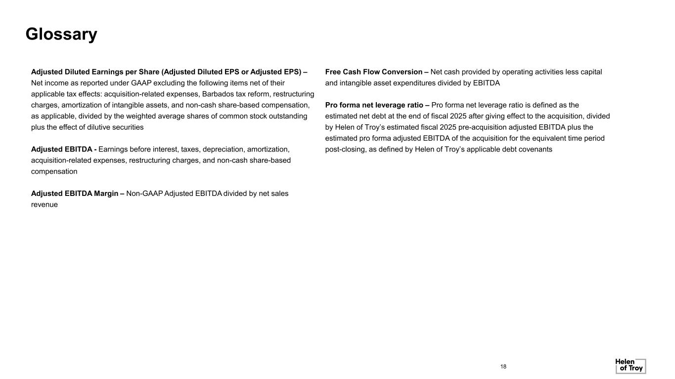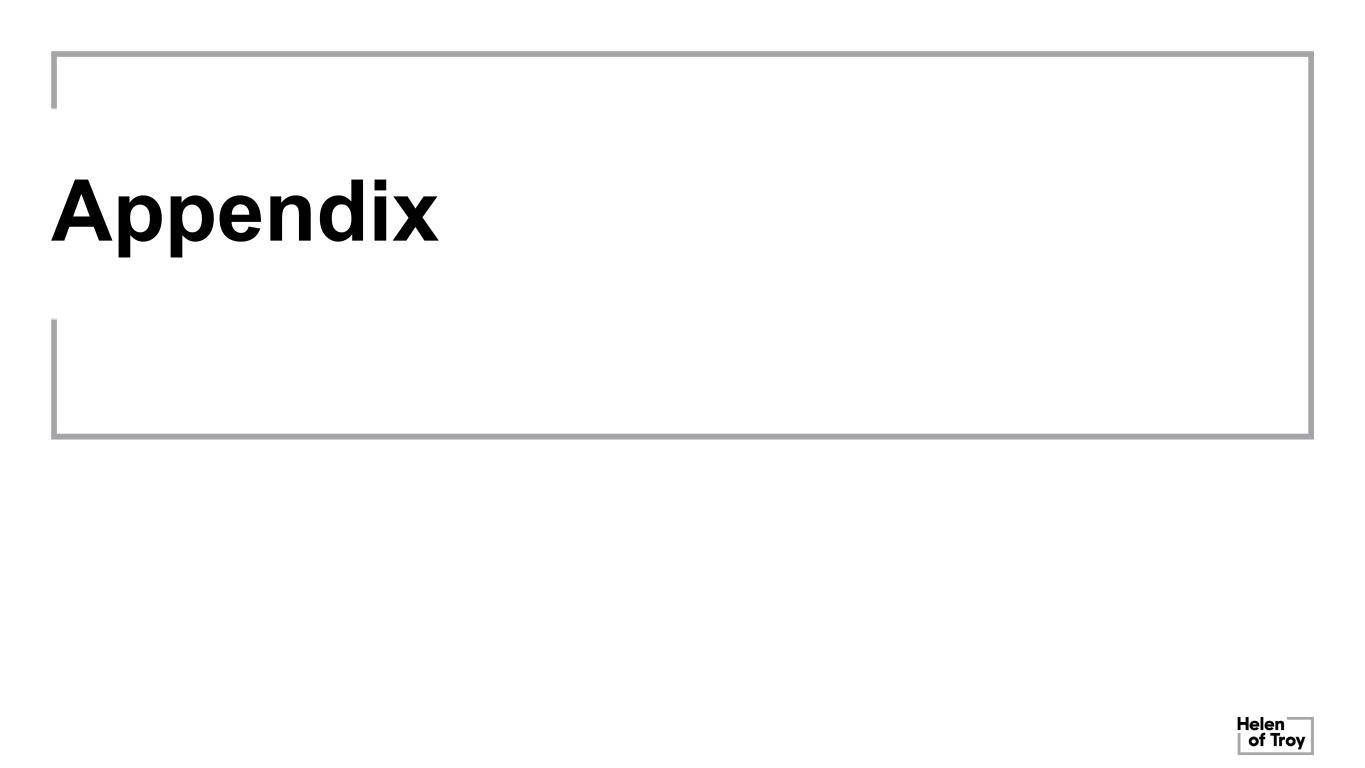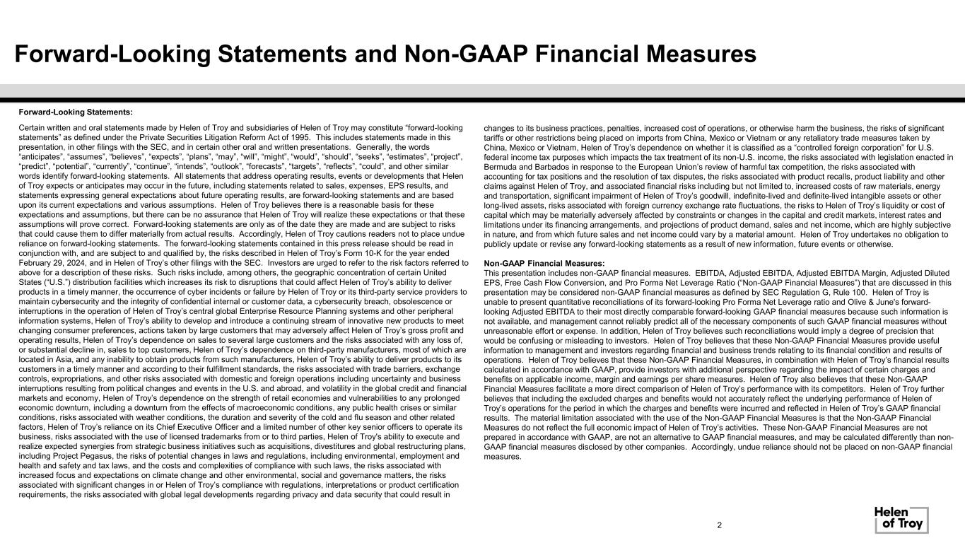 changes to its business practices, penalties, increased cost of operations, or otherwise harm the business, the risks of significant tariffs or other restrictions being placed on imports from China, Mexico or Vietnam or any retaliatory trade measures taken by China, Mexico or Vietnam, Helen of Troy’s dependence on whether it is classified as a “controlled foreign corporation” for U.S. federal income tax purposes which impacts the tax treatment of its non-U.S. income, the risks associated with legislation enacted in Bermuda and Barbados in response to the European Union’s review of harmful tax competition, the risks associated with accounting for tax positions and the resolution of tax disputes, the risks associated with product recalls, product liability and other claims against Helen of Troy, and associated financial risks including but not limited to, increased costs of raw materials, energy and transportation, significant impairment of Helen of Troy’s goodwill, indefinite-lived and definite-lived intangible assets or other long-lived assets, risks associated with foreign currency exchange rate fluctuations, the risks to Helen of Troy’s liquidity or cost of capital which may be materially adversely affected by constraints or changes in the capital and credit markets, interest rates and limitations under its financing arrangements, and projections of product demand, sales and net income, which are highly subjective in nature, and from which future sales and net income could vary by a material amount. Helen of Troy undertakes no obligation to publicly update or revise any forward-looking statements as a result of new information, future events or otherwise. Non-GAAP Financial Measures: This presentation includes non-GAAP financial measures. EBITDA, Adjusted EBITDA, Adjusted EBITDA Margin, Adjusted Diluted EPS, Free Cash Flow Conversion, and Pro Forma Net Leverage Ratio (“Non-GAAP Financial Measures”) that are discussed in this presentation may be considered non-GAAP financial measures as defined by SEC Regulation G, Rule 100. Helen of Troy is unable to present quantitative reconciliations of its forward-looking Pro Forma Net Leverage ratio and Olive & June's forward- looking Adjusted EBITDA to their most directly comparable forward-looking GAAP financial measures because such information is not available, and management cannot reliably predict all of the necessary components of such GAAP financial measures without unreasonable effort or expense. In addition, Helen of Troy believes such reconciliations would imply a degree of precision that would be confusing or misleading to investors. Helen of Troy believes that these Non-GAAP Financial Measures provide useful information to management and investors regarding financial and business trends relating to its financial condition and results of operations. Helen of Troy believes that these Non-GAAP Financial Measures, in combination with Helen of Troy’s financial results calculated in accordance with GAAP, provide investors with additional perspective regarding the impact of certain charges and benefits on applicable income, margin and earnings per share measures. Helen of Troy also believes that these Non-GAAP Financial Measures facilitate a more direct comparison of Helen of Troy’s performance with its competitors. Helen of Troy further believes that including the excluded charges and benefits would not accurately reflect the underlying performance of Helen of Troy’s operations for the period in which the charges and benefits were incurred and reflected in Helen of Troy’s GAAP financial results. The material limitation associated with the use of the Non-GAAP Financial Measures is that the Non-GAAP Financial Measures do not reflect the full economic impact of Helen of Troy’s activities. These Non-GAAP Financial Measures are not prepared in accordance with GAAP, are not an alternative to GAAP financial measures, and may be calculated differently than non- GAAP financial measures disclosed by other companies. Accordingly, undue reliance should not be placed on non-GAAP financial measures. Forward-Looking Statements and Non-GAAP Financial Measures Forward-Looking Statements: Certain written and oral statements made by Helen of Troy and subsidiaries of Helen of Troy may constitute “forward-looking statements” as defined under the Private Securities Litigation Reform Act of 1995. This includes statements made in this presentation, in other filings with the SEC, and in certain other oral and written presentations. Generally, the words “anticipates”, “assumes”, “believes”, “expects”, “plans”, “may”, “will”, “might”, “would”, “should”, “seeks”, “estimates”, “project”, “predict”, “potential”, “currently”, “continue”, “intends”, “outlook”, “forecasts”, “targets”, “reflects”, “could”, and other similar words identify forward-looking statements. All statements that address operating results, events or developments that Helen of Troy expects or anticipates may occur in the future, including statements related to sales, expenses, EPS results, and statements expressing general expectations about future operating results, are forward-looking statements and are based upon its current expectations and various assumptions. Helen of Troy believes there is a reasonable basis for these expectations and assumptions, but there can be no assurance that Helen of Troy will realize these expectations or that these assumptions will prove correct. Forward-looking statements are only as of the date they are made and are subject to risks that could cause them to differ materially from actual results. Accordingly, Helen of Troy cautions readers not to place undue reliance on forward-looking statements. The forward-looking statements contained in this press release should be read in conjunction with, and are subject to and qualified by, the risks describe