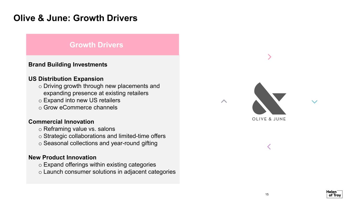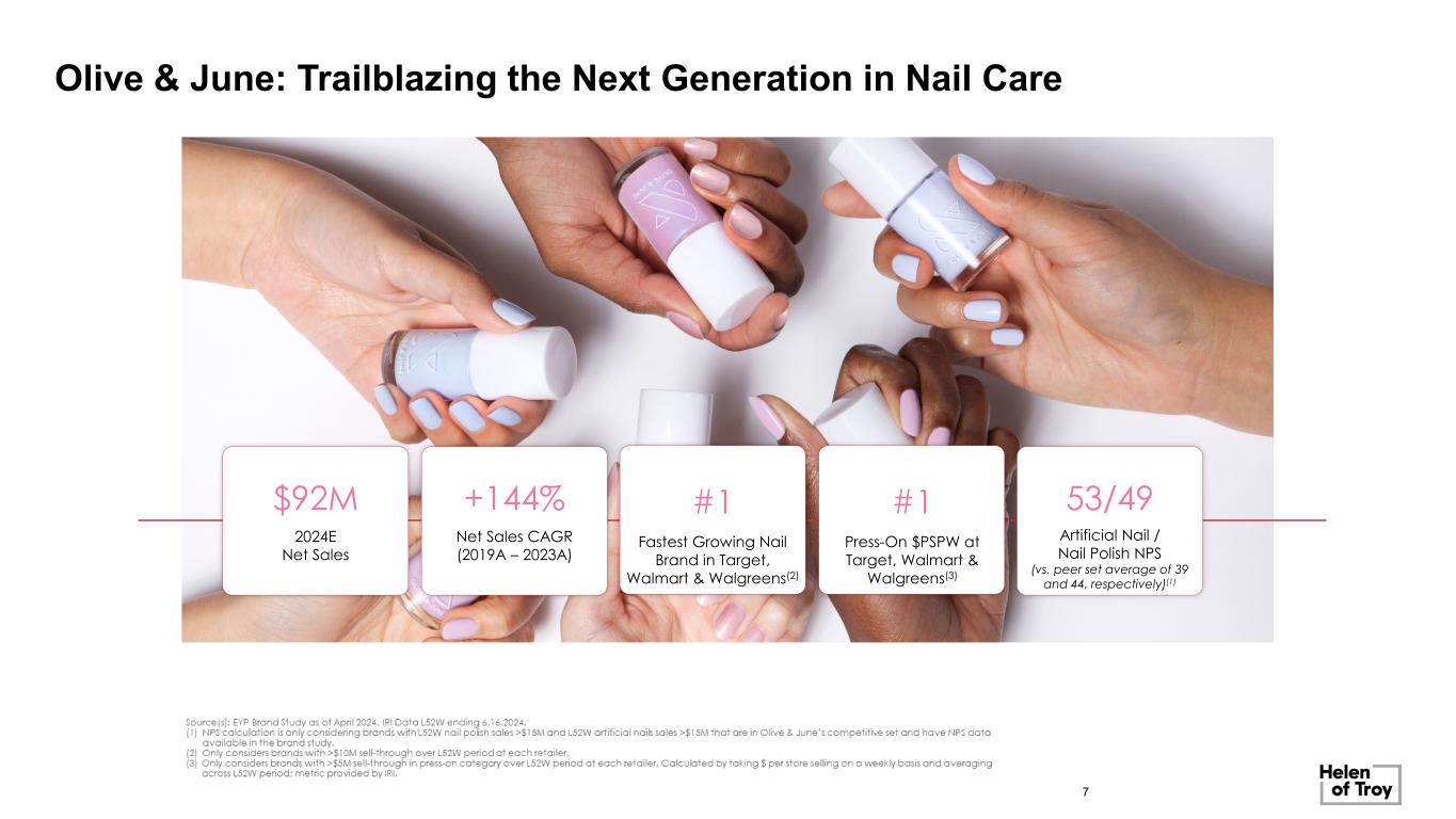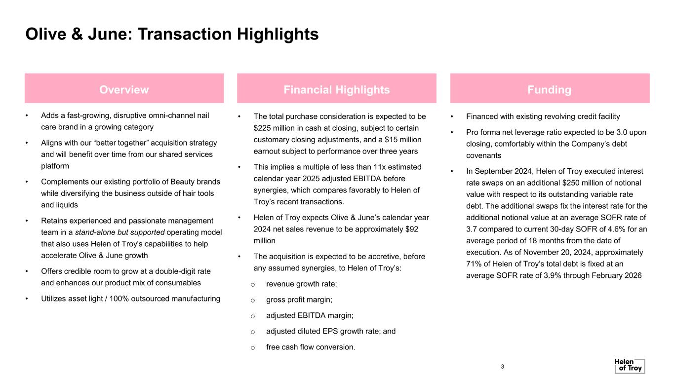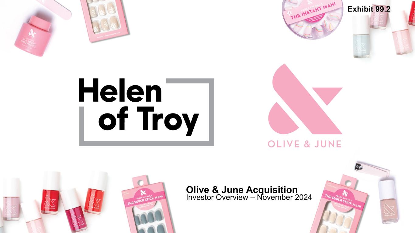 changes to its business practices, penalties, increased cost of operations, or otherwise harm the business, the risks of significant tariffs or other restrictions being placed on imports from China, Mexico or Vietnam or any retaliatory trade measures taken by China, Mexico or Vietnam, Helen of Troy’s dependence on whether it is classified as a “controlled foreign corporation” for U.S. federal income tax purposes which impacts the tax treatment of its non-U.S. income, the risks associated with legislation enacted in Bermuda and Barbados in response to the European Union’s review of harmful tax competition, the risks associated with accounting for tax positions and the resolution of tax disputes, the risks associated with product recalls, product liability and other claims against Helen of Troy, and associated financial risks including but not limited to, increased costs of raw materials, energy and transportation, significant impairment of Helen of Troy’s goodwill, indefinite-lived and definite-lived intangible assets or other long-lived assets, risks associated with foreign currency exchange rate fluctuations, the risks to Helen of Troy’s liquidity or cost of capital which may be materially adversely affected by constraints or changes in the capital and credit markets, interest rates and limitations under its financing arrangements, and projections of product demand, sales and net income, which are highly subjective in nature, and from which future sales and net income could vary by a material amount. Helen of Troy undertakes no obligation to publicly update or revise any forward-looking statements as a result of new information, future events or otherwise. Non-GAAP Financial Measures: This presentation includes non-GAAP financial measures. EBITDA, Adjusted EBITDA, Adjusted EBITDA Margin, Adjusted Diluted EPS, Free Cash Flow Conversion, and Pro Forma Net Leverage Ratio (“Non-GAAP Financial Measures”) that are discussed in this presentation may be considered non-GAAP financial measures as defined by SEC Regulation G, Rule 100. Helen of Troy is unable to present quantitative reconciliations of its forward-looking Pro Forma Net Leverage ratio and Olive & June's forward- looking Adjusted EBITDA to their most directly comparable forward-looking GAAP financial measures because such information is not available, and management cannot reliably predict all of the necessary components of such GAAP financial measures without unreasonable effort or expense. In addition, Helen of Troy believes such reconciliations would imply a degree of precision that would be confusing or misleading to investors. Helen of Troy believes that these Non-GAAP Financial Measures provide useful information to management and investors regarding financial and business trends relating to its financial condition and results of operations. Helen of Troy believes that these Non-GAAP Financial Measures, in combination with Helen of Troy’s financial results calculated in accordance with GAAP, provide investors with additional perspective regarding the impact of certain charges and benefits on applicable income, margin and earnings per share measures. Helen of Troy also believes that these Non-GAAP Financial Measures facilitate a more direct comparison of Helen of Troy’s performance with its competitors. Helen of Troy further believes that including the excluded charges and benefits would not accurately reflect the underlying performance of Helen of Troy’s operations for the period in which the charges and benefits were incurred and reflected in Helen of Troy’s GAAP financial results. The material limitation associated with the use of the Non-GAAP Financial Measures is that the Non-GAAP Financial Measures do not reflect the full economic impact of Helen of Troy’s activities. These Non-GAAP Financial Measures are not prepared in accordance with GAAP, are not an alternative to GAAP financial measures, and may be calculated differently than non- GAAP financial measures disclosed by other companies. Accordingly, undue reliance should not be placed on non-GAAP financial measures. Forward-Looking Statements and Non-GAAP Financial Measures Forward-Looking Statements: Certain written and oral statements made by Helen of Troy and subsidiaries of Helen of Troy may constitute “forward-looking statements” as defined under the Private Securities Litigation Reform Act of 1995. This includes statements made in this presentation, in other filings with the SEC, and in certain other oral and written presentations. Generally, the words “anticipates”, “assumes”, “believes”, “expects”, “plans”, “may”, “will”, “might”, “would”, “should”, “seeks”, “estimates”, “project”, “predict”, “potential”, “currently”, “continue”, “intends”, “outlook”, “forecasts”, “targets”, “reflects”, “could”, and other similar words identify forward-looking statements. All statements that address operating results, events or developments that Helen of Troy expects or anticipates may occur in the future, including statements related to sales, expenses, EPS results, and statements expressing general expectations about future operating results, are forward-looking statements and are based upon its current expectations and various assumptions. Helen of Troy believes there is a reasonable basis for these expectations and assumptions, but there can be no assurance that Helen of Troy will realize these expectations or that these assumptions will prove correct. Forward-looking statements are only as of the date they are made and are subject to risks that could cause them to differ materially from actual results. Accordingly, Helen of Troy cautions readers not to place undue reliance on forward-looking statements. The forward-looking statements contained in this press release should be read in conjunction with, and are subject to and qualified by, the risks describe