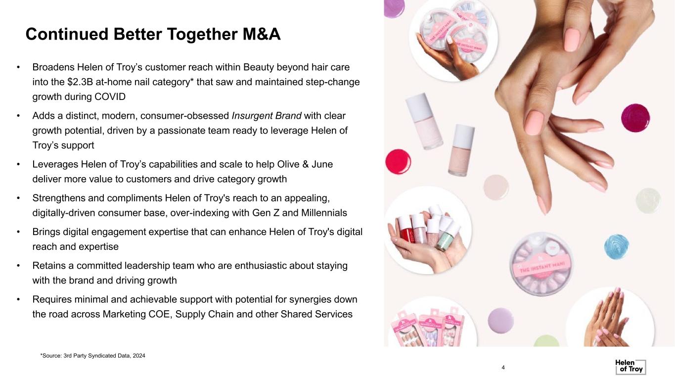 Overview • Adds a fast-growing, disruptive omni-channel nail care brand in a growing category • Aligns with our “better together” acquisition strategy and will benefit over time from our shared services platform • Complements our existing portfolio of Beauty brands while diversifying the business outside of hair tools and liquids • Retains experienced and passionate management team in a stand-alone but supported operating model that also uses Helen of Troy's capabilities to help accelerate Olive & June growth • Offers credible room to grow at a double-digit rate and enhances our product mix of consumables • Utilizes asset light / 100% outsourced manufacturing Financial Highlights • The total purchase consideration is expected to be $225 million in cash at closing, subject to certain customary closing adjustments, and a $15 million earnout subject to performance over three years • This implies a multiple of less than 11x estimated calendar year 2025 adjusted EBITDA before synergies, which compares favorably to Helen of Troy’s recent transactions. • Helen of Troy expects Olive & June’s calendar year 2024 net sales revenue to be approximately $92 million • The acquisition is expected to be accretive, before any assumed synergies, to Helen of Troy’s: o revenue growth rate; o gross profit margin; o adjusted EBITDA margin; o adjusted diluted EPS growth rate; and o free cash flow conversion. Funding • Financed with existing revolving credit facility • Pro forma net leverage ratio expected to be 3.0 upon closing, comfortably within the Company’s debt covenants • In September 2024, Helen of Troy executed interest rate swaps on an additional $250 million of notional value with respect to its outstanding variable rate debt. The additional swaps fix the interest rate for the additional notional value at an average SOFR rate of 3.7 compared to current 30-day SOFR of 4.6% for an average period of 18 months from the date of execution. As of November 20, 2024, approximately 71% of Helen of Troy’s total debt is fixed at an average SOFR rate of 3.9% through February 2026 Olive & June: Transaction Highlights 3