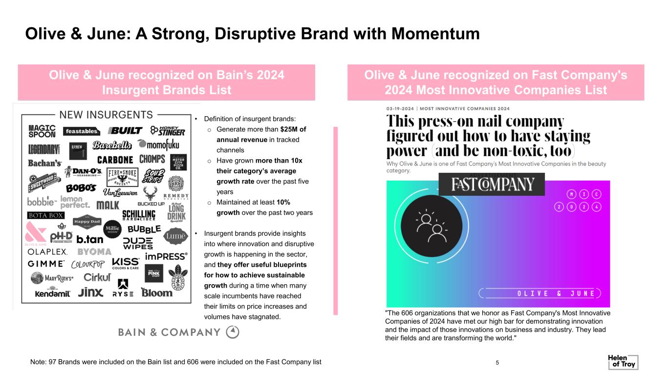 Continued Better Together M&A • Broadens Helen of Troy’s customer reach within Beauty beyond hair care into the $2.3B at-home nail category* that saw and maintained step-change growth during COVID • Adds a distinct, modern, consumer-obsessed Insurgent Brand with clear growth potential, driven by a passionate team ready to leverage Helen of Troy’s support • Leverages Helen of Troy’s capabilities and scale to help Olive & June deliver more value to customers and drive category growth • Strengthens and compliments Helen of Troy's reach to an appealing, digitally-driven consumer base, over-indexing with Gen Z and Millennials • Brings digital engagement expertise that can enhance Helen of Troy's digital reach and expertise • Retains a committed leadership team who are enthusiastic about staying with the brand and driving growth • Requires minimal and achievable support with potential for synergies down the road across Marketing COE, Supply Chain and other Shared Services 4 *Source: 3rd Party Syndicated Data, 2024