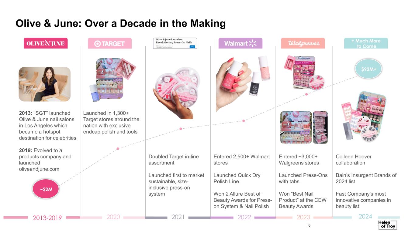 Olive & June: A Strong, Disruptive Brand with Momentum • Definition of insurgent brands: o Generate more than $25M of annual revenue in tracked channels o Have grown more than 10x their category’s average growth rate over the past five years o Maintained at least 10% growth over the past two years • Insurgent brands provide insights into where innovation and disruptive growth is happening in the sector, and they offer useful blueprints for how to achieve sustainable growth during a time when many scale incumbents have reached their limits on price increases and volumes have stagnated. 5Note: 97 Brands were included on the Bain list and 606 were included on the Fast Company list Olive & June recognized on Bain’s 2024 Insurgent Brands List Olive & June recognized on Fast Company's 2024 Most Innovative Companies List "The 606 organizations that we honor as Fast Company's Most Innovative Companies of 2024 have met our high bar for demonstrating innovation and the impact of those innovations on business and industry. They lead their fields and are transforming the world."