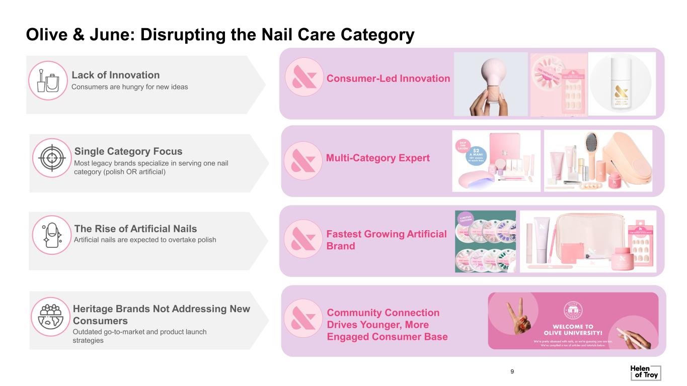 Digitally Transforming Digitally savvy customers are driving new interest to the category and helping to drive the category adoption and expansion. Highly Resilient & Robust Nail Care is a resilient sector that has shown YoY growth in all recent economic recessions. Both time and money savings vs. going to the salon are particularly relevant to today's stretched consumer. Exciting Growth Driver Nail Care has been a fast-growing beauty category over the past five years. Artificial nails are a disproportionate driver of category growth and are expected to overtake nail polish. Nail Care: An Expansive Growth Category 8