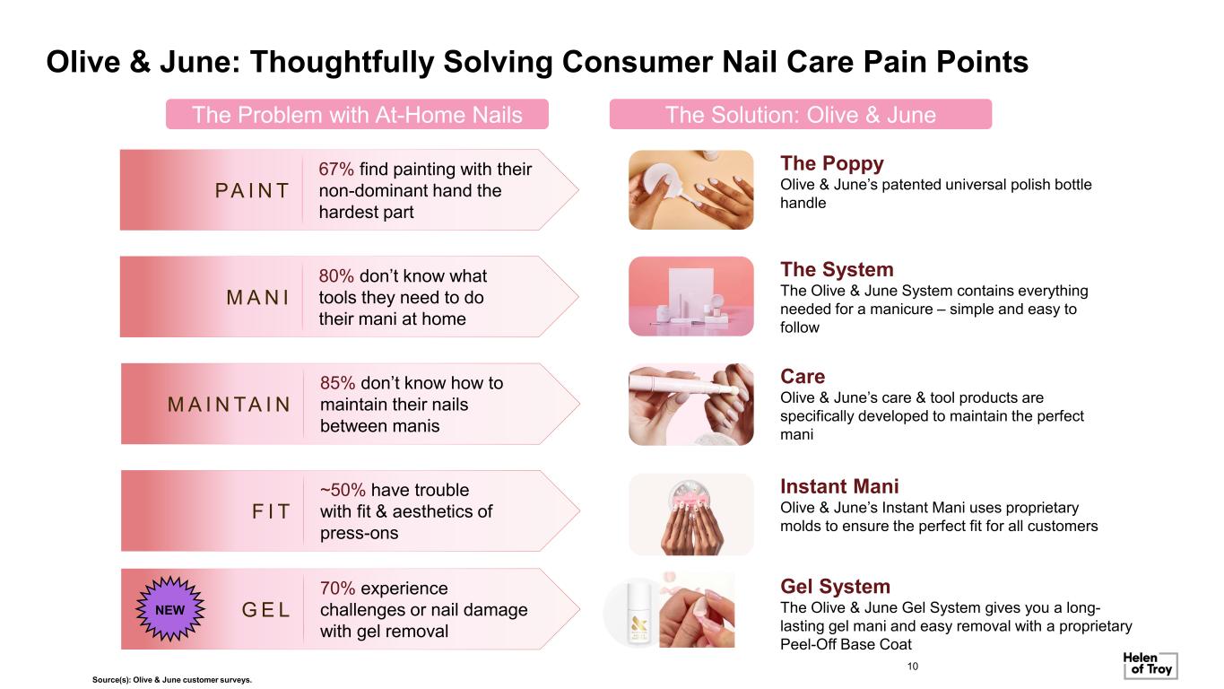 Olive & June: Disrupting the Nail Care Category Most legacy brands specialize in serving one nail category (polish OR artificial) Single Category Focus Artificial nails are expected to overtake polish The Rise of Artificial Nails Outdated go-to-market and product launch strategies Heritage Brands Not Addressing New Consumers Lack of Innovation Consumers are hungry for new ideas Community Connection Drives Younger, More Engaged Consumer Base Multi-Category Expert FFastest Growing Artificial Brand Consumer-Led Innovation 9