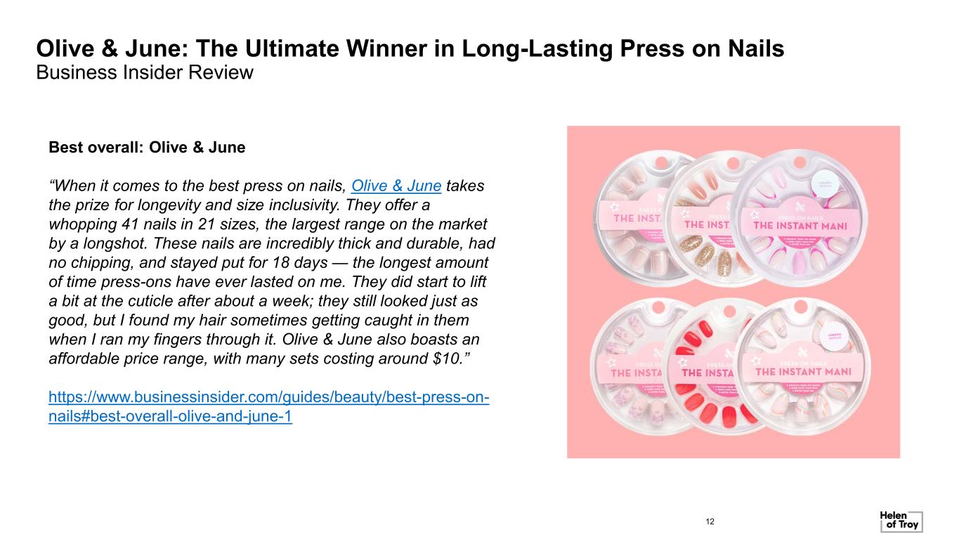 Olive & June: The Ultimate Winner in Long-Lasting Press on Nails Business Insider Review 12 Best overall: Olive & June “When it comes to the best press on nails, Olive & June takes the prize for longevity and size inclusivity. They offer a whopping 41 nails in 21 sizes, the largest range on the market by a longshot. These nails are incredibly thick and durable, had no chipping, and stayed put for 18 days — the longest amount of time press-ons have ever lasted on me. They did start to lift a bit at the cuticle after about a week; they still looked just as good, but I found my hair sometimes getting caught in them when I ran my fingers through it. Olive & June also boasts an affordable price range, with many sets costing around $10.” https://www.businessinsider.com/guides/beauty/best-press-on- nails#best-overall-olive-and-june-1