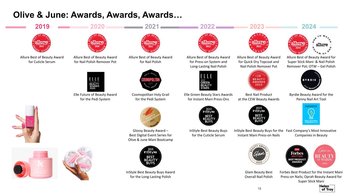 Olive & June: Awards, Awards, Awards… 2019 2020 2021 2022 2023 2024 Allure Best of Beauty Award for Cuticle Serum Allure Best of Beauty Award for Nail Polish Remover Pot Elle Future of Beauty Award for the Pedi System Allure Best of Beauty Award for Nail Polish Cosmopolitan Holy Grail for the Pedi System Glossy Beauty Award – Best Digital Event Series for Olive & June Mani Bootcamp InStyle Best Beauty Buys Award for the Long-Lasting Polish Allure Best of Beauty Award for Press-on System and Long-Lasting Nail Polish Elle Green Beauty Stars Awards for Instant Mani Press-Ons InStyle Best Beauty Buys for the Cuticle Serum Allure Best of Beauty Award for Quick Dry Topcoat and Nail Polish Remover Pot Best Nail Product at the CEW Beauty Awards InStyle Best Beauty Buys for the Instant Mani Press-on Nails Allure Best of Beauty Award for Super Stick Mani & Nail Polish Remover Pot; OTW – Gel Polish Byrdie Beauty Award for the Penny Nail Art Tool Fast Company’s Most Innovative Companies in Beauty Forbes Best Product for the Instant Mani Press-on Nails; Oprah Beauty Award for Super Stick Mani Glam Beauty Best Overall Nail Polish 13