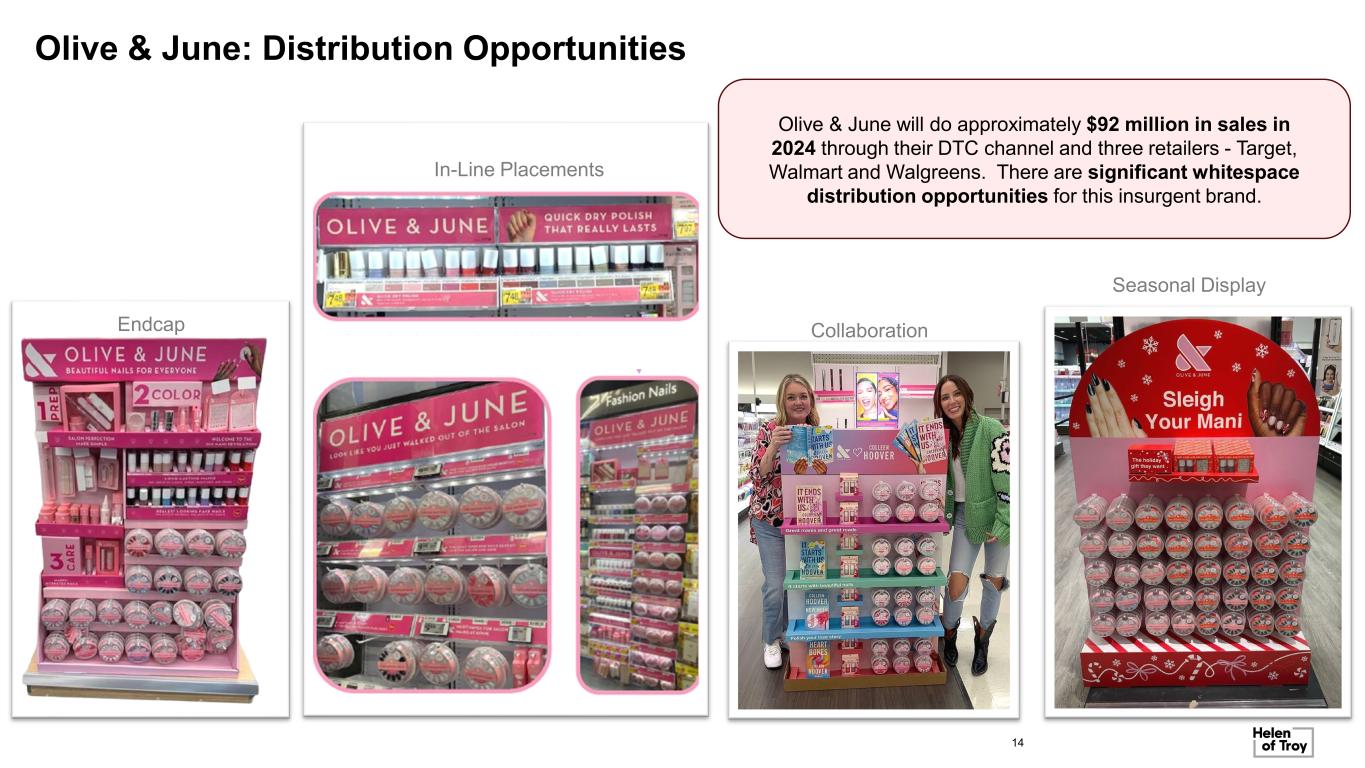 Olive & June: Distribution Opportunities Olive & June will do approximately $92 million in sales in 2024 through their DTC channel and three retailers - Target, Walmart and Walgreens. There are significant whitespace distribution opportunities for this insurgent brand. Collaboration Seasonal Display In-Line Placements Endcap 14