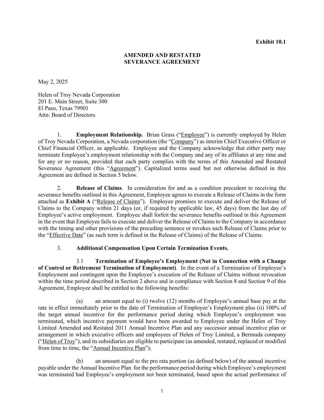 1 Exhibit 10.1 AMENDED AND RESTATED SEVERANCE AGREEMENT May 2, 2025 Helen of Troy Nevada Corporation 201 E. Main Street, Suite 300 El Paso, Texas 79901 Attn: Board of Directors 1. Employment Relationship. Brian Grass (“Employee”) is currently employed by Helen of Troy Nevada Corporation, a Nevada corporation (the “Company”) as interim Chief Executive Officer or Chief Financial Officer, as applicable. Employee and the Company acknowledge that either party may terminate Employee’s employment relationship with the Company and any of its affiliates at any time and for any or no reason, provided that each party complies with the terms of this Amended and Restated Severance Agreement (this “Agreement”). Capitalized terms used but not otherwise defined in this Agreement are defined in Section 5 below. 2. Release of Claims. In consideration for and as a condition precedent to receiving the severance benefits outlined in this Agreement, Employee agrees to execute a Release of Claims in the form attached as Exhibit A (“Release of Claims”). Employee promises to execute and deliver the Release of Claims to the Company within 21 days (or, if required by applicable law, 45 days) from the last day of Employee’s active employment. Employee shall forfeit the severance benefits outlined in this Agreement in the event that Employee fails to execute and deliver the Release of Claims to the Company in accordance with the timing and other provisions of the preceding sentence or revokes such Release of Claims prior to the “Effective Date” (as such term is defined in the Release of Claims) of the Release of Claims. 3. Additional Compensation Upon Certain Termination Events. 3.1 Termination of Employee’s Employment (Not in Connection with a Change of Control or Retirement Termination of Employment). In the event of a Termination of Employee’s Employment and contingent upon the Employee’s execution of the Release of Claims without revocation within the time period described in Section 2 above and in compliance with Section 8 and Section 9 of this Agreement, Employee shall be entitled to the following benefits: (a) an amount equal to (i) twelve (12) months of Employee’s annual base pay at the rate in effect immediately prior to the date of Termination of Employee’s Employment plus (ii) 100% of the target annual incentive for the performance period during which Employee’s employment was terminated, which incentive payment would have been awarded to Employee under the Helen of Troy Limited Amended and Restated 2011 Annual Incentive Plan and any successor annual incentive plan or arrangement in which executive officers and employees of Helen of Troy Limited, a Bermuda company (“Helen of Troy”), and its subsidiaries are eligible to participate (as amended, restated, replaced or modified from time to time, the “Annual Incentive Plan”); (b) an amount equal to the pro rata portion (as defined below) of the annual incentive payable under the Annual Incentive Plan for the performance period during which Employee’s employment was terminated had Employee’s employment not been terminated, based upon the actual performance of