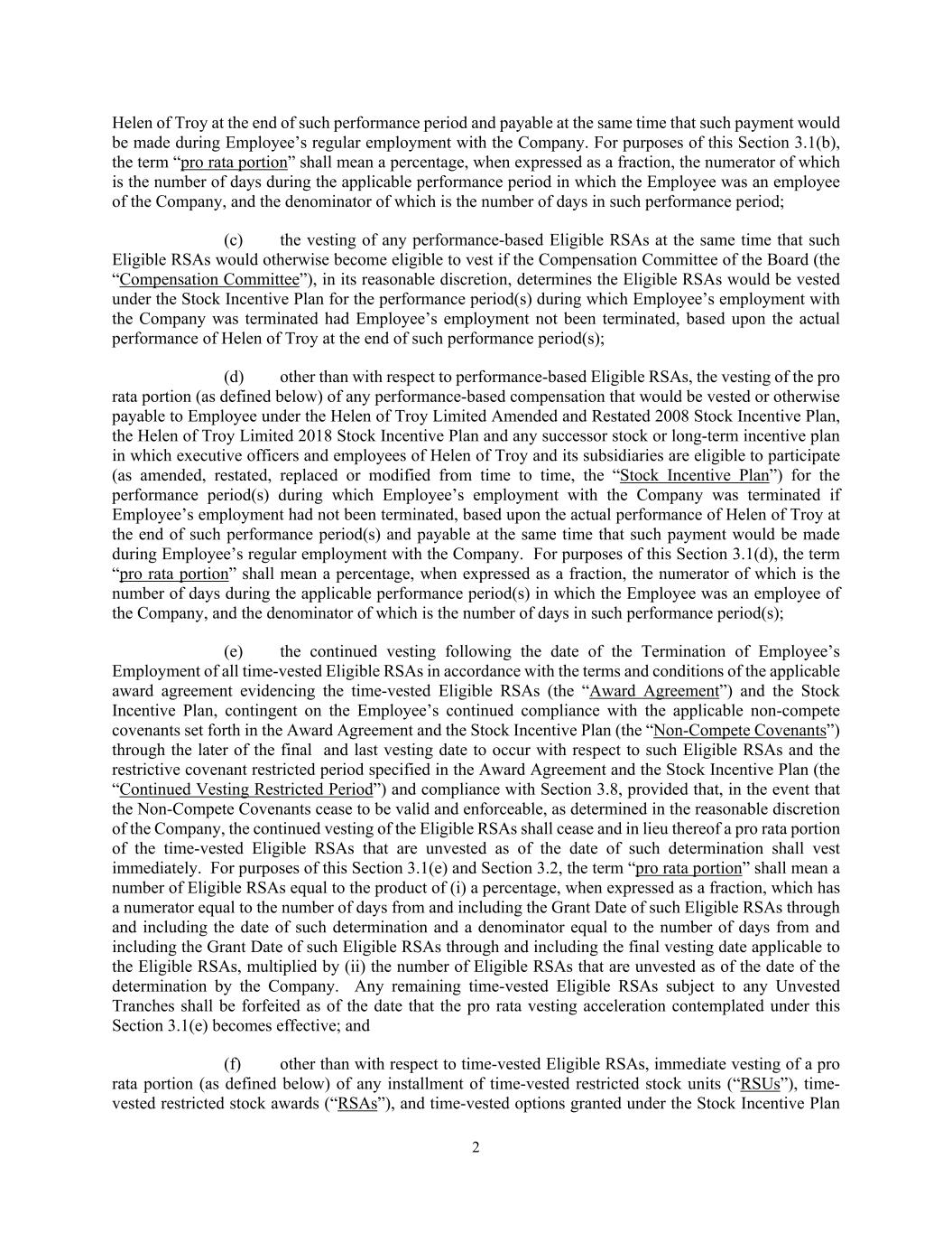 2 Helen of Troy at the end of such performance period and payable at the same time that such payment would be made during Employee’s regular employment with the Company. For purposes of this Section 3.1(b), the term “pro rata portion” shall mean a percentage, when expressed as a fraction, the numerator of which is the number of days during the applicable performance period in which the Employee was an employee of the Company, and the denominator of which is the number of days in such performance period; (c) the vesting of any performance-based Eligible RSAs at the same time that such Eligible RSAs would otherwise become eligible to vest if the Compensation Committee of the Board (the “Compensation Committee”), in its reasonable discretion, determines the Eligible RSAs would be vested under the Stock Incentive Plan for the performance period(s) during which Employee’s employment with the Company was terminated had Employee’s employment not been terminated, based upon the actual performance of Helen of Troy at the end of such performance period(s); (d) other than with respect to performance-based Eligible RSAs, the vesting of the pro rata portion (as defined below) of any performance-based compensation that would be vested or otherwise payable to Employee under the Helen of Troy Limited Amended and Restated 2008 Stock Incentive Plan, the Helen of Troy Limited 2018 Stock Incentive Plan and any successor stock or long-term incentive plan in which executive officers and employees of Helen of Troy and its subsidiaries are eligible to participate (as amended, restated, replaced or modified from time to time, the “Stock Incentive Plan”) for the performance period(s) during which Employee’s employment with the Company was terminated if Employee’s employment had not been terminated, based upon the actual performance of Helen of Troy at the end of such performance period(s) and payable at the same time that such payment would be made during Employee’s regular employment with the Company. For purposes of this Section 3.1(d), the term “pro rata portion” shall mean a percentage, when expressed as a fraction, the numerator of which is the number of days during the applicable performance period(s) in which the Employee was an employee of the Company, and the denominator of which is the number of days in such performance period(s); (e) the continued vesting following the date of the Termination of Employee’s Employment of all time-vested Eligible RSAs in accordance with the terms and conditions of the applicable award agreement evidencing the time-vested Eligible RSAs (the “Award Agreement”) and the Stock Incentive Plan, contingent on the Employee’s continued compliance with the applicable non-compete covenants set forth in the Award Agreement and the Stock Incentive Plan (the “Non-Compete Covenants”) through the later of the final and last vesting date to occur with respect to such Eligible RSAs and the restrictive covenant restricted period specified in the Award Agreement and the Stock Incentive Plan (the “Continued Vesting Restricted Period”) and compliance with Section 3.8, provided that, in the event that the Non-Compete Covenants cease to be valid and enforceable, as determined in the reasonable discretion of the Company, the continued vesting of the Eligible RSAs shall cease and in lieu thereof a pro rata portion of the time-vested Eligible RSAs that are unvested as of the date of such determination shall vest immediately. For purposes of this Section 3.1(e) and Section 3.2, the term “pro rata portion” shall mean a number of Eligible RSAs equal to the product of (i) a percentage, when expressed as a fraction, which has a numerator equal to the number of days from and including the Grant Date of such Eligible RSAs through and including the date of such determination and a denominator equal to the number of days from and including the Grant Date of such Eligible RSAs through and including the final vesting date applicable to the Eligible RSAs, multiplied by (ii) the number of Eligible RSAs that are unvested as of the date of the determination by the Company. Any remaining time-vested Eligible RSAs subject to any Unvested Tranches shall be forfeited as of the date that the pro rata vesting acceleration contemplated under this Section 3.1(e) becomes effective; and (f) other than with respect to time-vested Eligible RSAs, immediate vesting of a pro rata portion (as defined below) of any installment of time-vested restricted stock units (“RSUs”), time- vested restricted stock awards (“RSAs”), and time-vested options granted under the Stock Incentive Plan