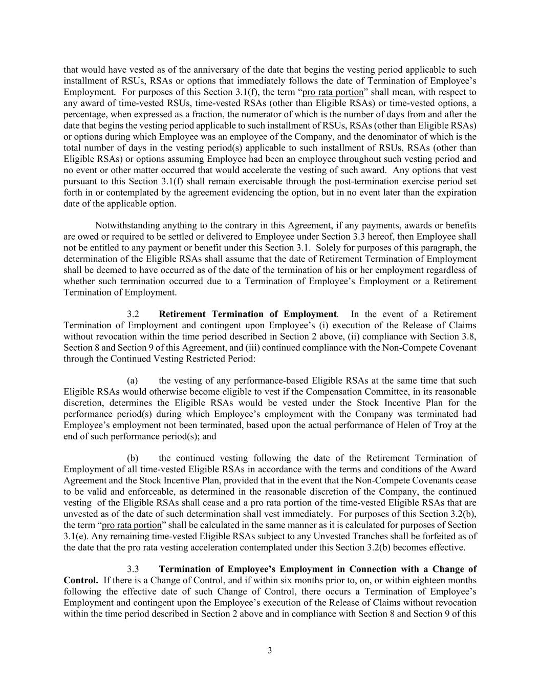 3 that would have vested as of the anniversary of the date that begins the vesting period applicable to such installment of RSUs, RSAs or options that immediately follows the date of Termination of Employee’s Employment. For purposes of this Section 3.1(f), the term “pro rata portion” shall mean, with respect to any award of time-vested RSUs, time-vested RSAs (other than Eligible RSAs) or time-vested options, a percentage, when expressed as a fraction, the numerator of which is the number of days from and after the date that begins the vesting period applicable to such installment of RSUs, RSAs (other than Eligible RSAs) or options during which Employee was an employee of the Company, and the denominator of which is the total number of days in the vesting period(s) applicable to such installment of RSUs, RSAs (other than Eligible RSAs) or options assuming Employee had been an employee throughout such vesting period and no event or other matter occurred that would accelerate the vesting of such award. Any options that vest pursuant to this Section 3.1(f) shall remain exercisable through the post-termination exercise period set forth in or contemplated by the agreement evidencing the option, but in no event later than the expiration date of the applicable option. Notwithstanding anything to the contrary in this Agreement, if any payments, awards or benefits are owed or required to be settled or delivered to Employee under Section 3.3 hereof, then Employee shall not be entitled to any payment or benefit under this Section 3.1. Solely for purposes of this paragraph, the determination of the Eligible RSAs shall assume that the date of Retirement Termination of Employment shall be deemed to have occurred as of the date of the termination of his or her employment regardless of whether such termination occurred due to a Termination of Employee’s Employment or a Retirement Termination of Employment. 3.2 Retirement Termination of Employment. In the event of a Retirement Termination of Employment and contingent upon Employee’s (i) execution of the Release of Claims without revocation within the time period described in Section 2 above, (ii) compliance with Section 3.8, Section 8 and Section 9 of this Agreement, and (iii) continued compliance with the Non-Compete Covenant through the Continued Vesting Restricted Period: (a) the vesting of any performance-based Eligible RSAs at the same time that such Eligible RSAs would otherwise become eligible to vest if the Compensation Committee, in its reasonable discretion, determines the Eligible RSAs would be vested under the Stock Incentive Plan for the performance period(s) during which Employee’s employment with the Company was terminated had Employee’s employment not been terminated, based upon the actual performance of Helen of Troy at the end of such performance period(s); and (b) the continued vesting following the date of the Retirement Termination of Employment of all time-vested Eligible RSAs in accordance with the terms and conditions of the Award Agreement and the Stock Incentive Plan, provided that in the event that the Non-Compete Covenants cease to be valid and enforceable, as determined in the reasonable discretion of the Company, the continued vesting of the Eligible RSAs shall cease and a pro rata portion of the time-vested Eligible RSAs that are unvested as of the date of such determination shall vest immediately. For purposes of this Section 3.2(b), the term “pro rata portion” shall be calculated in the same manner as it is calculated for purposes of Section 3.1(e). Any remaining time-vested Eligible RSAs subject to any Unvested Tranches shall be forfeited as of the date that the pro rata vesting acceleration contemplated under this Section 3.2(b) becomes effective. 3.3 Termination of Employee’s Employment in Connection with a Change of Control. If there is a Change of Control, and if within six months prior to, on, or within eighteen months following the effective date of such Change of Control, there occurs a Termination of Employee’s Employment and contingent upon the Employee’s execution of the Release of Claims without revocation within the time period described in Section 2 above and in compliance with Section 8 and Section 9 of this