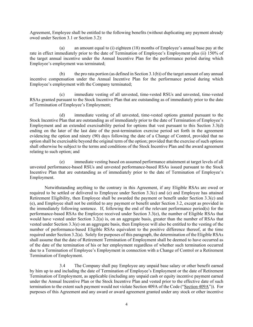 4 Agreement, Employee shall be entitled to the following benefits (without duplicating any payment already owed under Section 3.1 or Section 3.2): (a) an amount equal to (i) eighteen (18) months of Employee’s annual base pay at the rate in effect immediately prior to the date of Termination of Employee’s Employment plus (ii) 150% of the target annual incentive under the Annual Incentive Plan for the performance period during which Employee’s employment was terminated; (b) the pro rata portion (as defined in Section 3.1(b)) of the target amount of any annual incentive compensation under the Annual Incentive Plan for the performance period during which Employee’s employment with the Company terminated; (c) immediate vesting of all unvested, time-vested RSUs and unvested, time-vested RSAs granted pursuant to the Stock Incentive Plan that are outstanding as of immediately prior to the date of Termination of Employee’s Employment; (d) immediate vesting of all unvested, time-vested options granted pursuant to the Stock Incentive Plan that are outstanding as of immediately prior to the date of Termination of Employee’s Employment and an extended exercisability period for options that vest pursuant to this Section 3.3(d) ending on the later of the last date of the post-termination exercise period set forth in the agreement evidencing the option and ninety (90) days following the date of a Change of Control, provided that no option shall be exercisable beyond the original term of the option; provided that the exercise of such options shall otherwise be subject to the terms and conditions of the Stock Incentive Plan and the award agreement relating to such option; and (e) immediate vesting based on assumed performance attainment at target levels of all unvested performance-based RSUs and unvested performance-based RSAs issued pursuant to the Stock Incentive Plan that are outstanding as of immediately prior to the date of Termination of Employee’s Employment. Notwithstanding anything to the contrary in this Agreement, if any Eligible RSAs are owed or required to be settled or delivered to Employee under Section 3.3(c) and (e) and Employee has attained Retirement Eligibility, then Employee shall be awarded the payment or benefit under Section 3.3(c) and (e), and Employee shall not be entitled to any payment or benefit under Section 3.2, except as provided in the immediately following sentence. If, following the end of the relevant performance period(s) for the performance-based RSAs the Employee received under Section 3.3(e), the number of Eligible RSAs that would have vested under Section 3.2(a) is, on an aggregate basis, greater than the number of RSAs that vested under Section 3.3(e) on an aggregate basis, then Employee will also be entitled to the vesting of the number of performance-based Eligible RSAs equivalent to the positive difference thereof, at the time required under Section 3.2(a). Solely for purposes of this paragraph, the determination of the Eligible RSAs shall assume that the date of Retirement Termination of Employment shall be deemed to have occurred as of the date of the termination of his or her employment regardless of whether such termination occurred due to a Termination of Employee’s Employment in connection with a Change of Control or a Retirement Termination of Employment. 3.4 The Company shall pay Employee any unpaid base salary or other benefit earned by him up to and including the date of Termination of Employee’s Employment or the date of Retirement Termination of Employment, as applicable (including any unpaid cash or equity incentive payment earned under the Annual Incentive Plan or the Stock Incentive Plan and vested prior to the effective date of such termination to the extent such payment would not violate Section 409A of the Code (“Section 409A”)). For purposes of this Agreement and any award or award agreement granted under any stock or other incentive