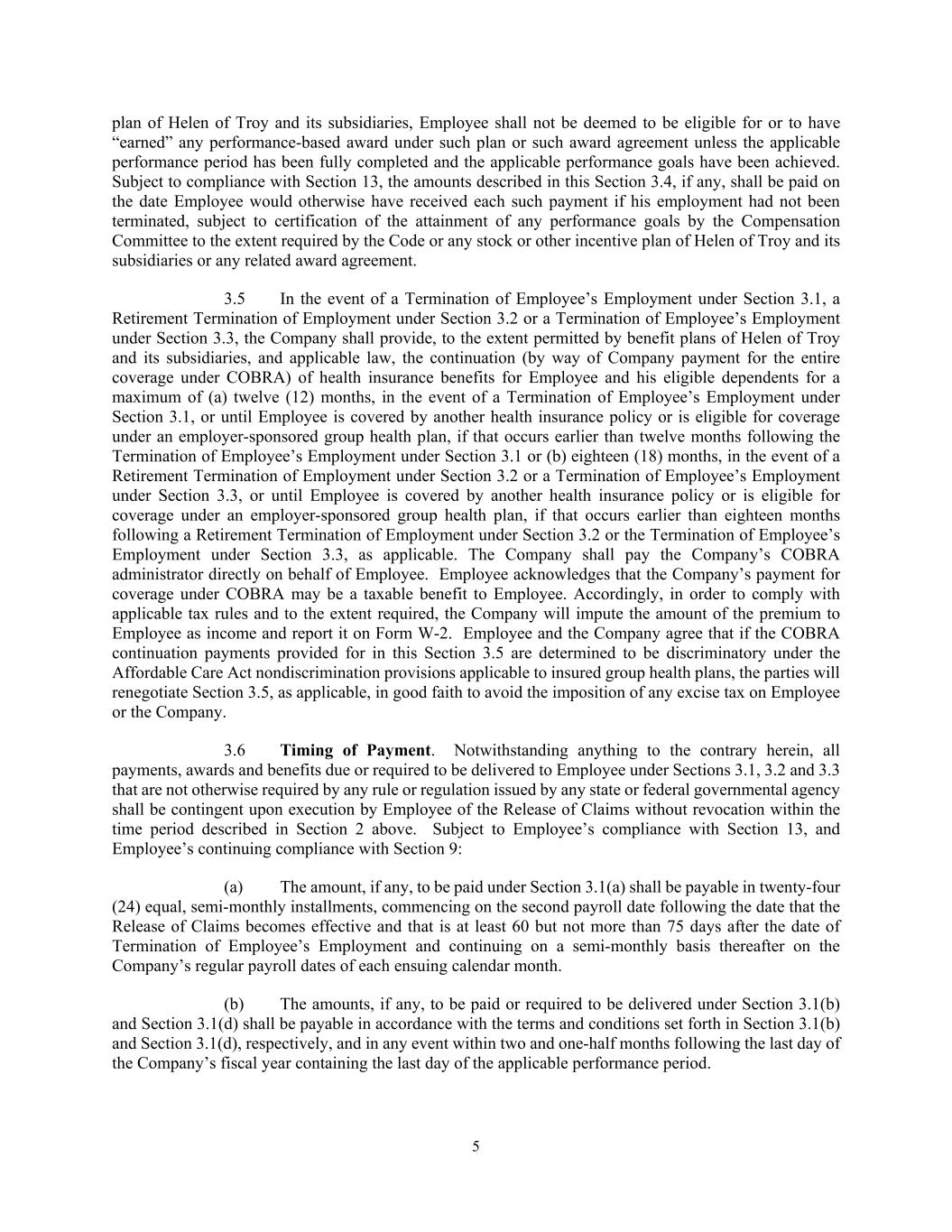 5 plan of Helen of Troy and its subsidiaries, Employee shall not be deemed to be eligible for or to have “earned” any performance-based award under such plan or such award agreement unless the applicable performance period has been fully completed and the applicable performance goals have been achieved. Subject to compliance with Section 13, the amounts described in this Section 3.4, if any, shall be paid on the date Employee would otherwise have received each such payment if his employment had not been terminated, subject to certification of the attainment of any performance goals by the Compensation Committee to the extent required by the Code or any stock or other incentive plan of Helen of Troy and its subsidiaries or any related award agreement. 3.5 In the event of a Termination of Employee’s Employment under Section 3.1, a Retirement Termination of Employment under Section 3.2 or a Termination of Employee’s Employment under Section 3.3, the Company shall provide, to the extent permitted by benefit plans of Helen of Troy and its subsidiaries, and applicable law, the continuation (by way of Company payment for the entire coverage under COBRA) of health insurance benefits for Employee and his eligible dependents for a maximum of (a) twelve (12) months, in the event of a Termination of Employee’s Employment under Section 3.1, or until Employee is covered by another health insurance policy or is eligible for coverage under an employer-sponsored group health plan, if that occurs earlier than twelve months following the Termination of Employee’s Employment under Section 3.1 or (b) eighteen (18) months, in the event of a Retirement Termination of Employment under Section 3.2 or a Termination of Employee’s Employment under Section 3.3, or until Employee is covered by another health insurance policy or is eligible for coverage under an employer-sponsored group health plan, if that occurs earlier than eighteen months following a Retirement Termination of Employment under Section 3.2 or the Termination of Employee’s Employment under Section 3.3, as applicable. The Company shall pay the Company’s COBRA administrator directly on behalf of Employee. Employee acknowledges that the Company’s payment for coverage under COBRA may be a taxable benefit to Employee. Accordingly, in order to comply with applicable tax rules and to the extent required, the Company will impute the amount of the premium to Employee as income and report it on Form W-2. Employee and the Company agree that if the COBRA continuation payments provided for in this Section 3.5 are determined to be discriminatory under the Affordable Care Act nondiscrimination provisions applicable to insured group health plans, the parties will renegotiate Section 3.5, as applicable, in good faith to avoid the imposition of any excise tax on Employee or the Company. 3.6 Timing of Payment. Notwithstanding anything to the contrary herein, all payments, awards and benefits due or required to be delivered to Employee under Sections 3.1, 3.2 and 3.3 that are not otherwise required by any rule or regulation issued by any state or federal governmental agency shall be contingent upon execution by Employee of the Release of Claims without revocation within the time period described in Section 2 above. Subject to Employee’s compliance with Section 13, and Employee’s continuing compliance with Section 9: (a) The amount, if any, to be paid under Section 3.1(a) shall be payable in twenty-four (24) equal, semi-monthly installments, commencing on the second payroll date following the date that the Release of Claims becomes effective and that is at least 60 but not more than 75 days after the date of Termination of Employee’s Employment and continuing on a semi-monthly basis thereafter on the Company’s regular payroll dates of each ensuing calendar month. (b) The amounts, if any, to be paid or required to be delivered under Section 3.1(b) and Section 3.1(d) shall be payable in accordance with the terms and conditions set forth in Section 3.1(b) and Section 3.1(d), respectively, and in any event within two and one-half months following the last day of the Company’s fiscal year containing the last day of the applicable performance period.