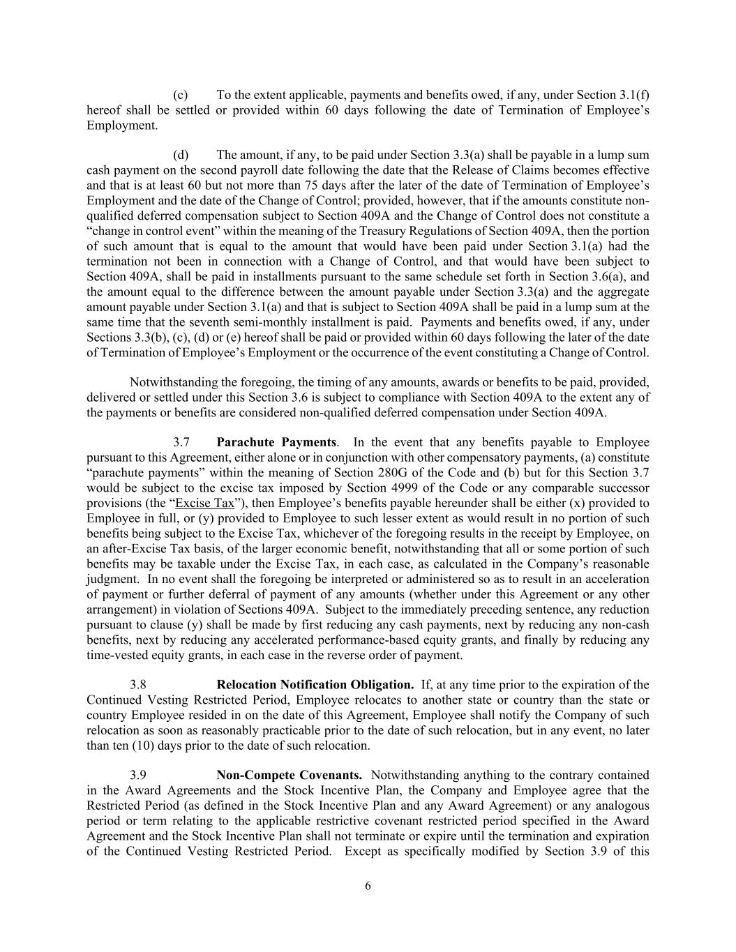6 (c) To the extent applicable, payments and benefits owed, if any, under Section 3.1(f) hereof shall be settled or provided within 60 days following the date of Termination of Employee’s Employment. (d) The amount, if any, to be paid under Section 3.3(a) shall be payable in a lump sum cash payment on the second payroll date following the date that the Release of Claims becomes effective and that is at least 60 but not more than 75 days after the later of the date of Termination of Employee’s Employment and the date of the Change of Control; provided, however, that if the amounts constitute non- qualified deferred compensation subject to Section 409A and the Change of Control does not constitute a “change in control event” within the meaning of the Treasury Regulations of Section 409A, then the portion of such amount that is equal to the amount that would have been paid under Section 3.1(a) had the termination not been in connection with a Change of Control, and that would have been subject to Section 409A, shall be paid in installments pursuant to the same schedule set forth in Section 3.6(a), and the amount equal to the difference between the amount payable under Section 3.3(a) and the aggregate amount payable under Section 3.1(a) and that is subject to Section 409A shall be paid in a lump sum at the same time that the seventh semi-monthly installment is paid. Payments and benefits owed, if any, under Sections 3.3(b), (c), (d) or (e) hereof shall be paid or provided within 60 days following the later of the date of Termination of Employee’s Employment or the occurrence of the event constituting a Change of Control. Notwithstanding the foregoing, the timing of any amounts, awards or benefits to be paid, provided, delivered or settled under this Section 3.6 is subject to compliance with Section 409A to the extent any of the payments or benefits are considered non-qualified deferred compensation under Section 409A. 3.7 Parachute Payments. In the event that any benefits payable to Employee pursuant to this Agreement, either alone or in conjunction with other compensatory payments, (a) constitute “parachute payments” within the meaning of Section 280G of the Code and (b) but for this Section 3.7 would be subject to the excise tax imposed by Section 4999 of the Code or any comparable successor provisions (the “Excise Tax”), then Employee’s benefits payable hereunder shall be either (x) provided to Employee in full, or (y) provided to Employee to such lesser extent as would result in no portion of such benefits being subject to the Excise Tax, whichever of the foregoing results in the receipt by Employee, on an after-Excise Tax basis, of the larger economic benefit, notwithstanding that all or some portion of such benefits may be taxable under the Excise Tax, in each case, as calculated in the Company’s reasonable judgment. In no event shall the foregoing be interpreted or administered so as to result in an acceleration of payment or further deferral of payment of any amounts (whether under this Agreement or any other arrangement) in violation of Sections 409A. Subject to the immediately preceding sentence, any reduction pursuant to clause (y) shall be made by first reducing any cash payments, next by reducing any non-cash benefits, next by reducing any accelerated performance-based equity grants, and finally by reducing any time-vested equity grants, in each case in the reverse order of payment. 3.8 Relocation Notification Obligation. If, at any time prior to the expiration of the Continued Vesting Restricted Period, Employee relocates to another state or country than the state or country Employee resided in on the date of this Agreement, Employee shall notify the Company of such relocation as soon as reasonably practicable prior to the date of such relocation, but in any event, no later than ten (10) days prior to the date of such relocation. 3.9 Non-Compete Covenants. Notwithstanding anything to the contrary contained in the Award Agreements and the Stock Incentive Plan, the Company and Employee agree that the Restricted Period (as defined in the Stock Incentive Plan and any Award Agreement) or any analogous period or term relating to the applicable restrictive covenant restricted period specified in the Award Agreement and the Stock Incentive Plan shall not terminate or expire until the termination and expiration of the Continued Vesting Restricted Period. Except as specifically modified by Section 3.9 of this